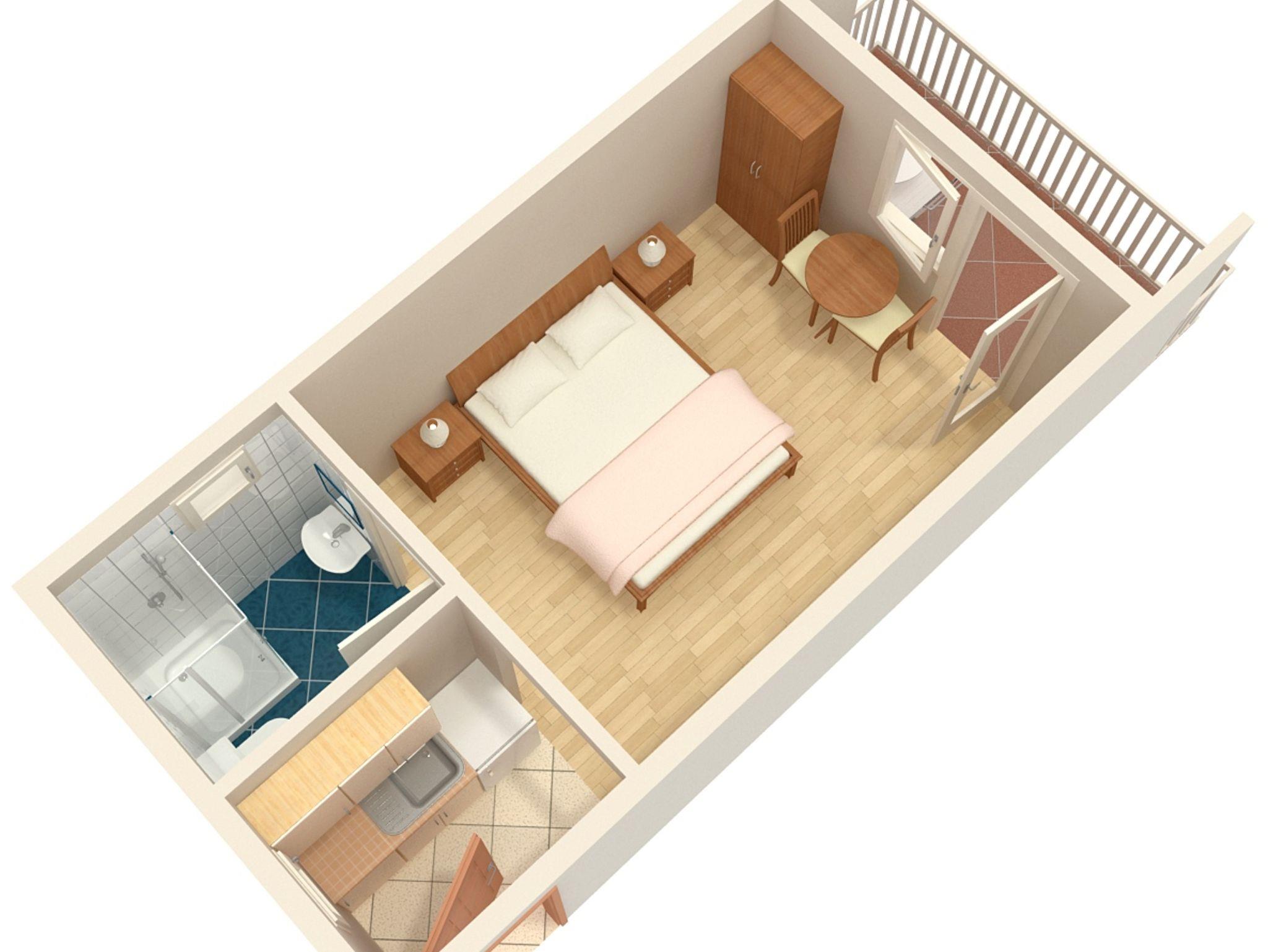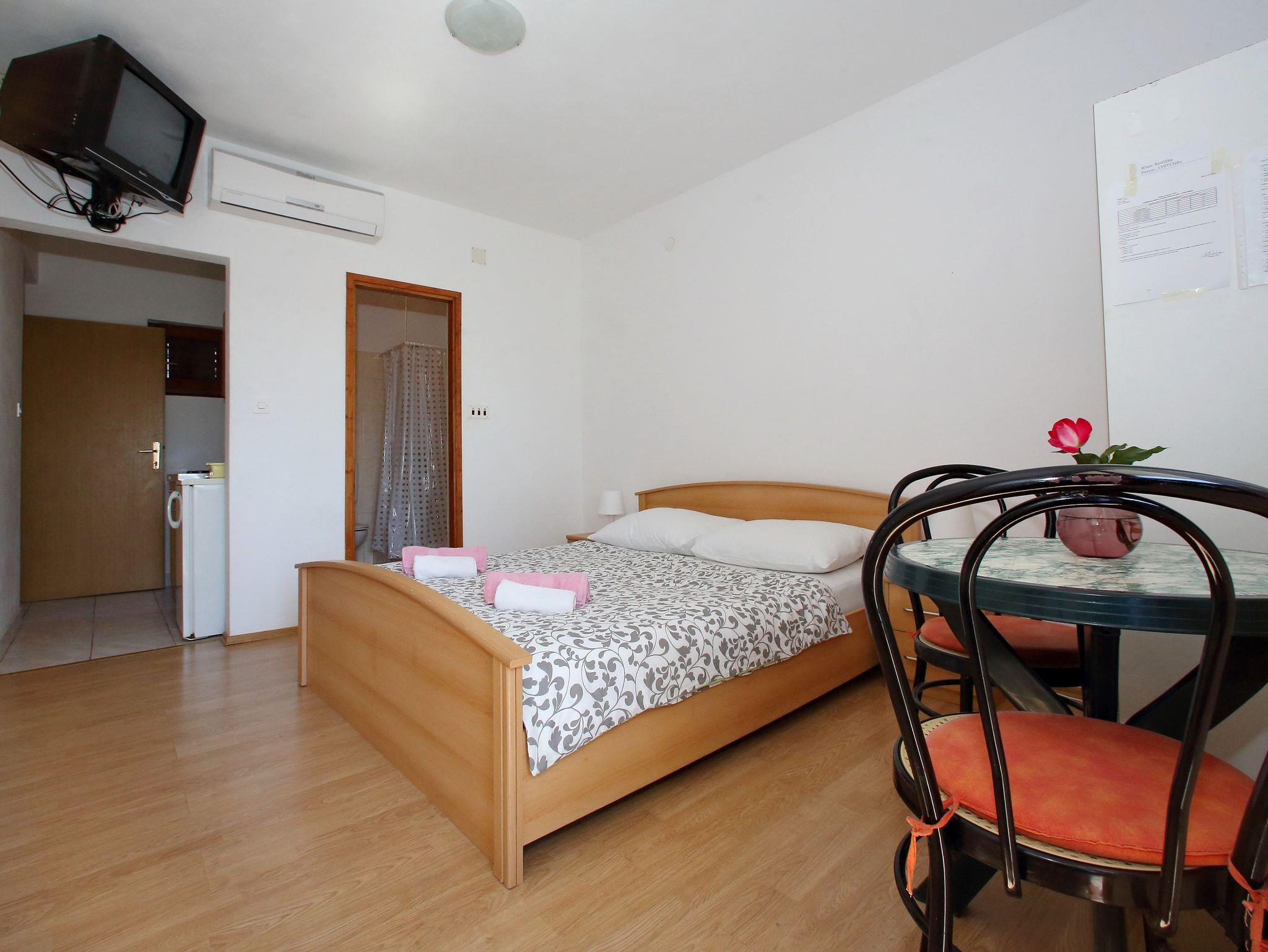 Studio bietet Platz für 2 Gäste. Die Betten sind in Schlafzimmern, die es 1 gibt, innerhalb einer Gesamtfläche von 19m2, angeordnet. Die Gäste haben eine eigene Terrasse zur Verfügung, auf der sie in warmen Sommernächten genießen können. Das Studio-Apartment bietet Meerblick. Es ist erlaubt, Speisen auf dem Gemeinschafts-Grill vorzubereiten. In der Unterkunftseinheit besteht die Möglichkeit des Mitbringens von Haustieren gegen Aufpreis. IM PREIS INBEGRIFFEN: Kurtaxe, Endreinigung, Parkplatz, Internet, tragbarer Grill. VERBINDLICHE ZUSÄTZLICHE KOSTEN: Aufzahlung für Kurzaufenthalte (prozentualer Zuschlag pro Nächtigungsanzahl: 30% - 1, 20% - 2, 10% - 3). UNVERBINDLICHE ZUSÄTZLICHE KOSTEN: Klimatisierung (5,00 € pro Nacht), Haustiere (5,00 € pro Nacht). Die Verfügbarkeit zusätzlicher Dienstleistungen in Ihrem reservierten Termin und die Preise derselben (falls nicht aufgeführt) müssen im Voraus überprüft werden. Zusätzliche Dienstleistungen die in der Zahlungsaufforderung nicht aufgeführt sind werden direkt beim Vermieter bezahlt, angenommen der Gast nutzt auch diese.