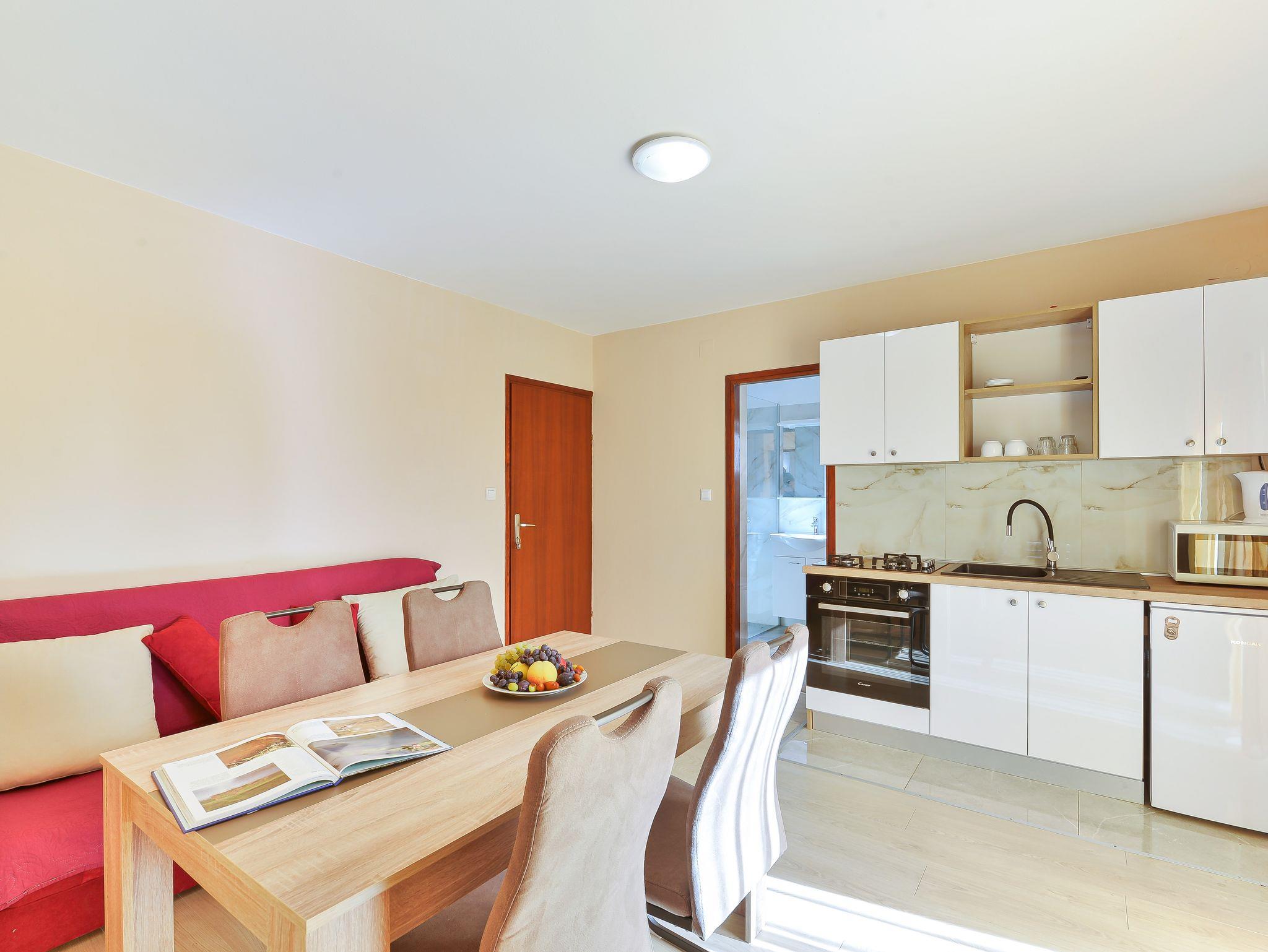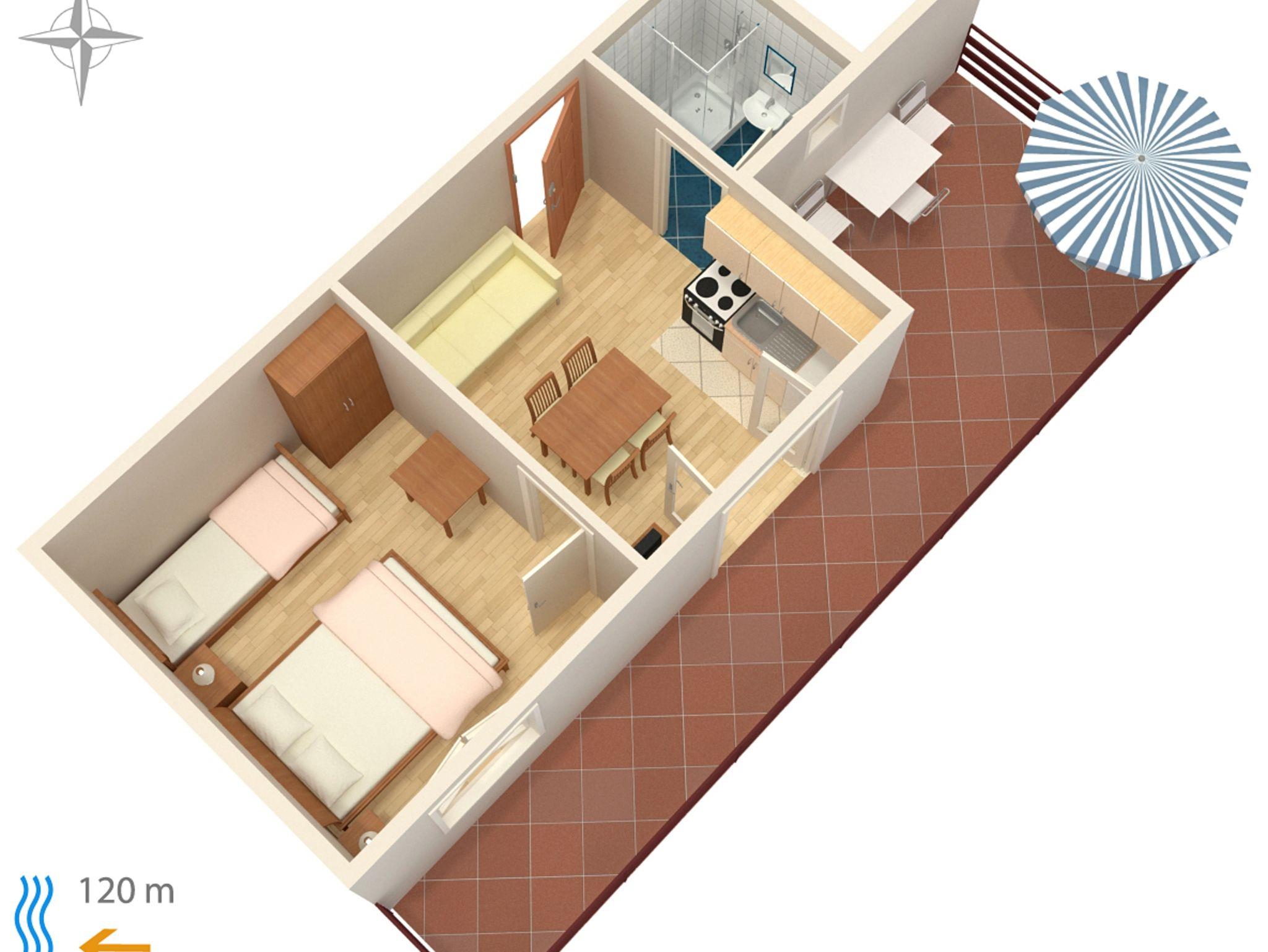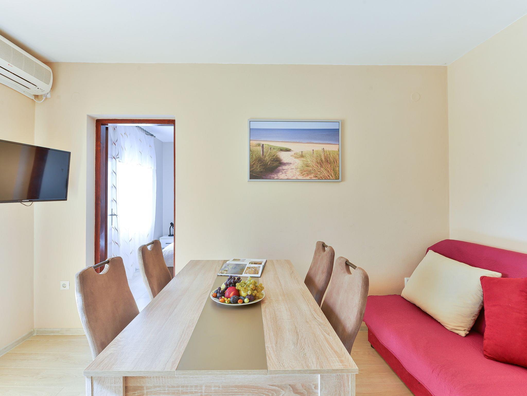 Ferienwohnung bietet Platz für 4 Gäste. Die Betten sind in Schlafzimmern, die es 1 gibt, und in Esszimmer, innerhalb einer Gesamtfläche von 31m2, angeordnet. Die Gäste haben einen eigenen Balkon zur Verfügung, auf der sie in warmen Sommernächten genießen können. Das Apartment bietet Meerblick. Es ist erlaubt, Speisen auf dem Gemeinschafts-Grill vorzubereiten. IM PREIS INBEGRIFFEN: Kurtaxe, Endreinigung, Parkplatz, Internet. VERBINDLICHE ZUSÄTZLICHE KOSTEN: Aufzahlung für Kurzaufenthalte (prozentualer Zuschlag pro Nächtigungsanzahl: 30% - 1, 20% - 2, 10% - 3). UNVERBINDLICHE ZUSÄTZLICHE KOSTEN: Klimatisierung (7,00 € pro Nacht). Die Verfügbarkeit zusätzlicher Dienstleistungen in Ihrem reservierten Termin und die Preise derselben (falls nicht aufgeführt) müssen im Voraus überprüft werden. Zusätzliche Dienstleistungen die in der Zahlungsaufforderung nicht aufgeführt sind werden direkt beim Vermieter bezahlt, angenommen der Gast nutzt auch diese.