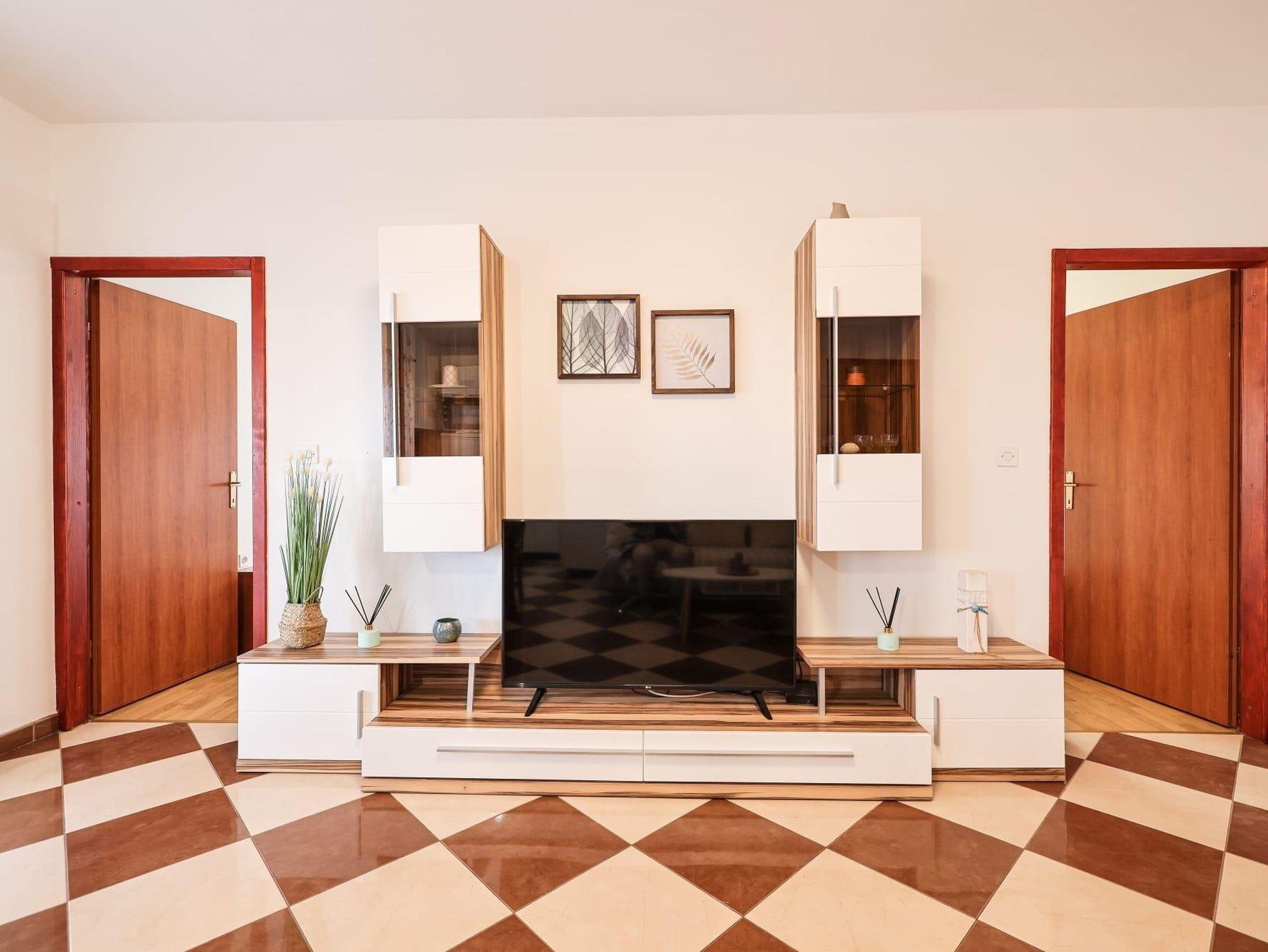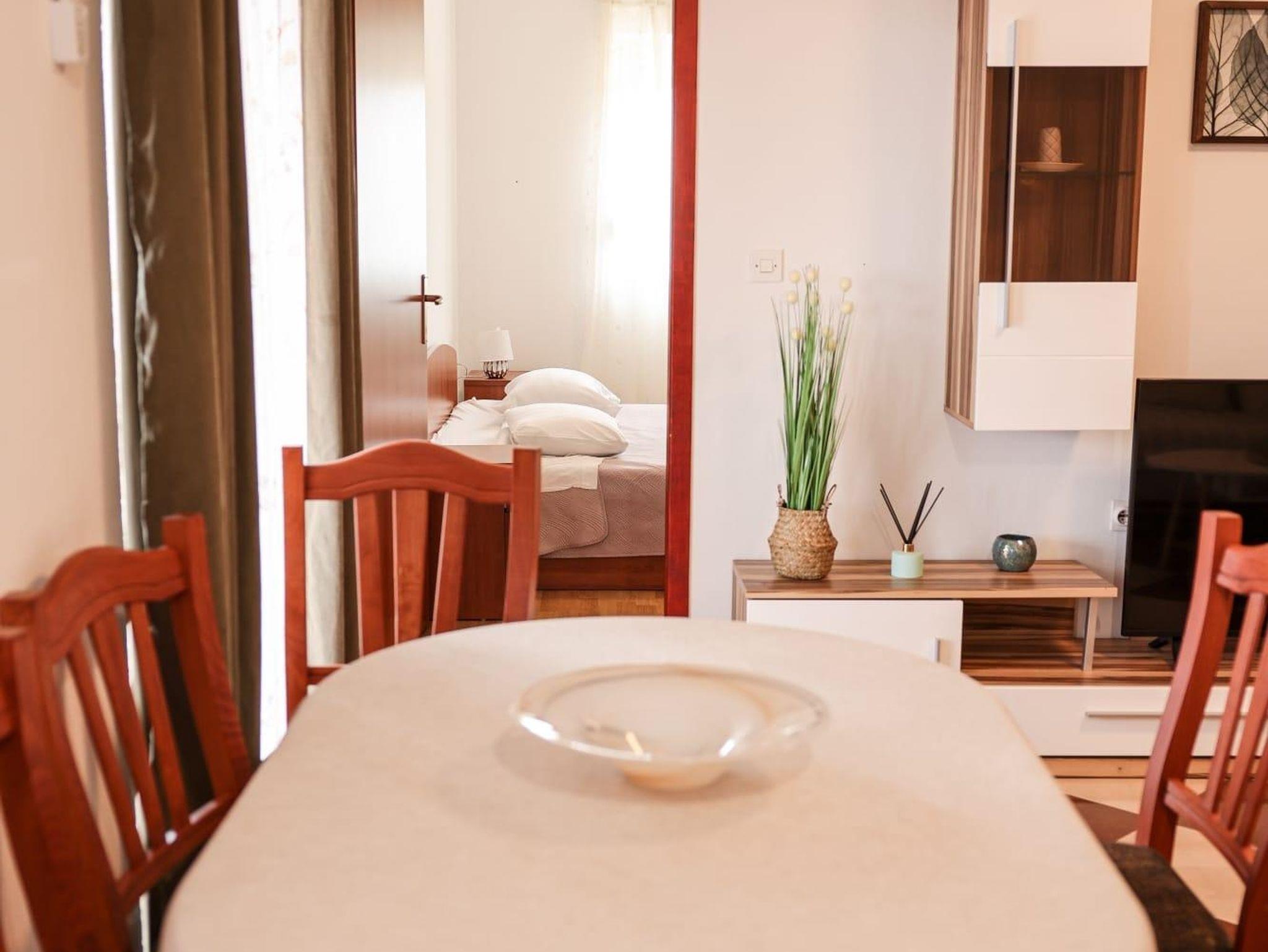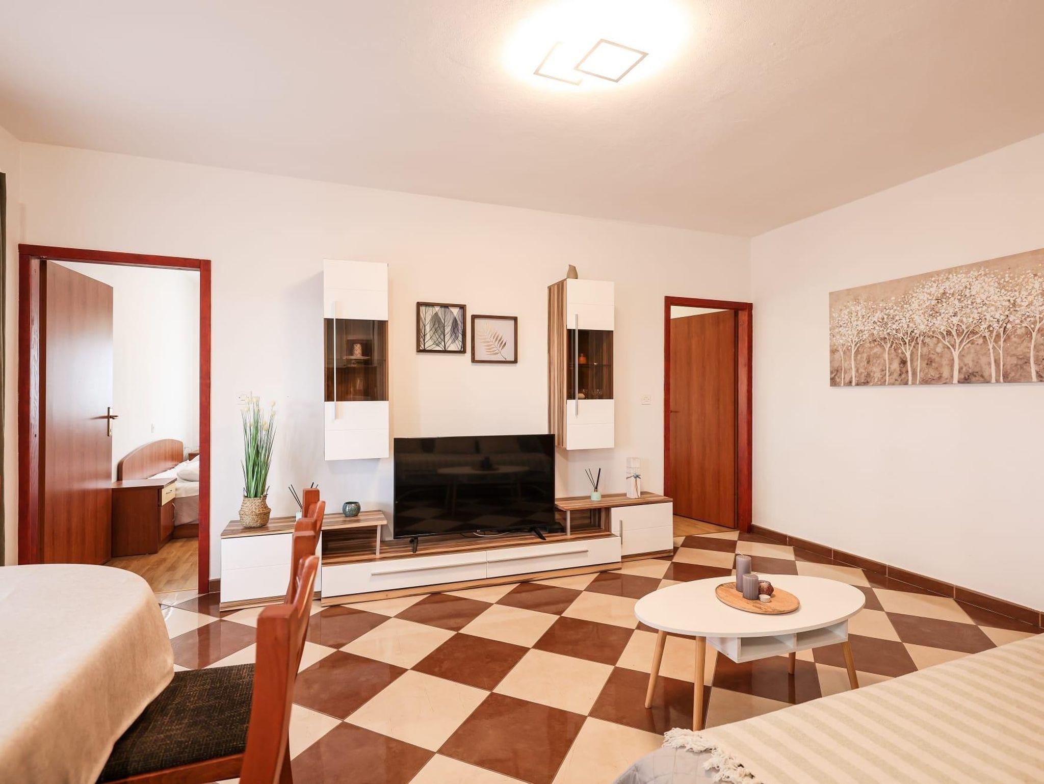 Ferienwohnung bietet Platz für 6 Gäste. Die Betten sind in Schlafzimmern, die es 2 gibt, und in Wohnzimmer, innerhalb einer Gesamtfläche von 47m2, angeordnet. Die Gäste haben eine eigene Terrasse zur Verfügung, auf der sie in warmen Sommernächten genießen können. Das Apartment bietet Meerblick. Es ist erlaubt, Speisen auf dem Gemeinschafts-Grill vorzubereiten. In der Unterkunftseinheit besteht die Möglichkeit des Mitbringens von Haustieren, und die Dienstleistung ist im Preis der Unterkunft enthalten. IM PREIS INBEGRIFFEN: Kurtaxe, Endreinigung, Klimatisierung, Parkplatz, Internet, Haustiere, Kinderbett. Die Verfügbarkeit zusätzlicher Dienstleistungen in Ihrem reservierten Termin und die Preise derselben (falls nicht aufgeführt) müssen im Voraus überprüft werden. Zusätzliche Dienstleistungen die in der Zahlungsaufforderung nicht aufgeführt sind werden direkt beim Vermieter bezahlt, angenommen der Gast nutzt auch diese.