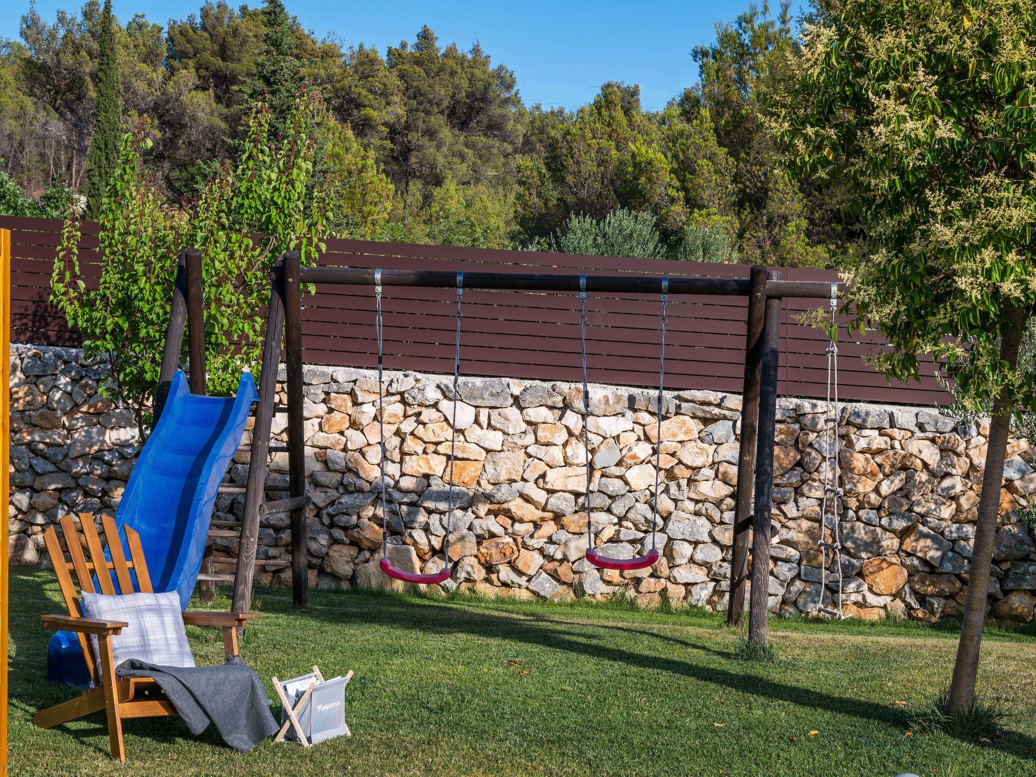 The courtyard of the villa is dominated by a 36 m2 swimming pool surrounded by six sun loungers. In the courtyard there is a fun content for children that will surely delight the youngest visitors of the villa, and the greenery that stretches in front of the villa will tempt you to outdoor activities in the air.