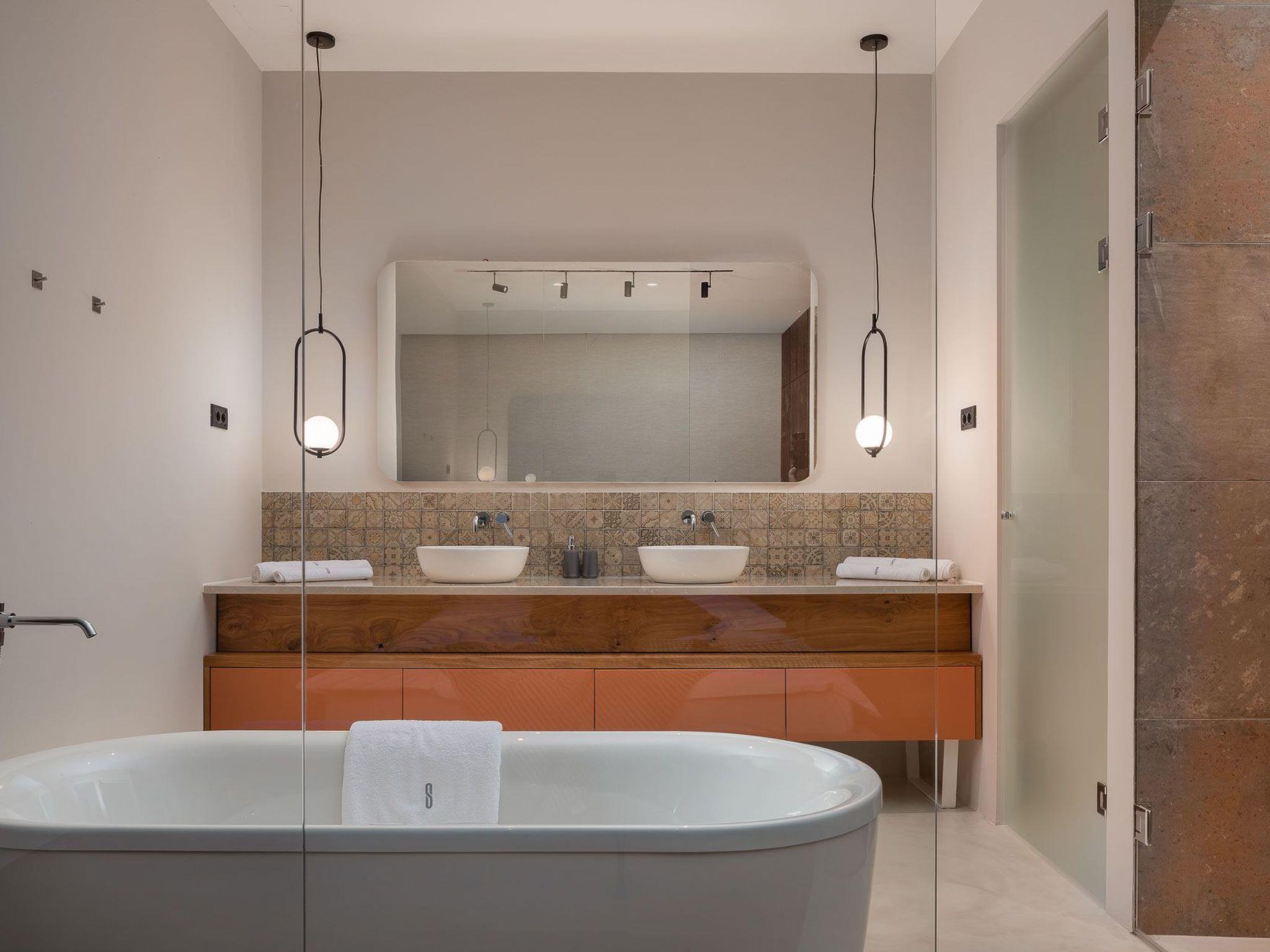 The outdoor area of Villa Sound of Silence is an oasis of leisure and entertainment. The fully fenced yard offers not just privacy but also features a heated pool as its crown jewel, promising endless fun under the sun. With sun loungers and sun umbrellas available, it's an ideal spot for sunbathing or enjoying a refreshing dip. The outdoor dining room beckons for barbecue dinners under the stars, making every meal a special occasion. The mix of Mediterranean charm with stone features, olive trees, and a minimalist industrial design complements the beauty of the natural surroundings, creating an inviting outdoor living space.