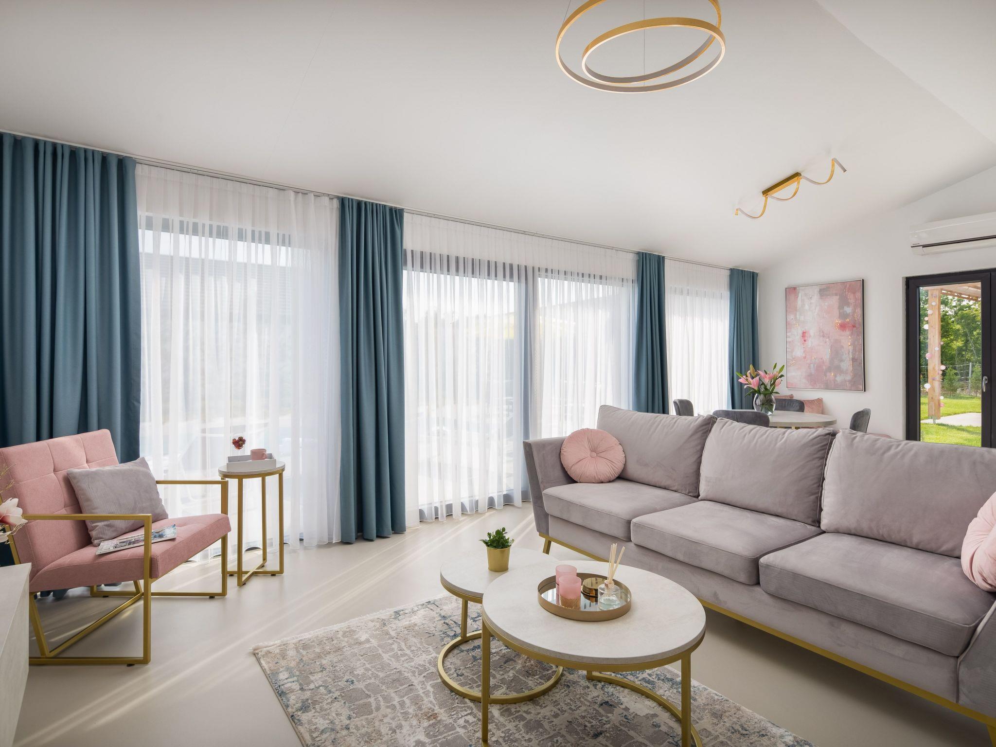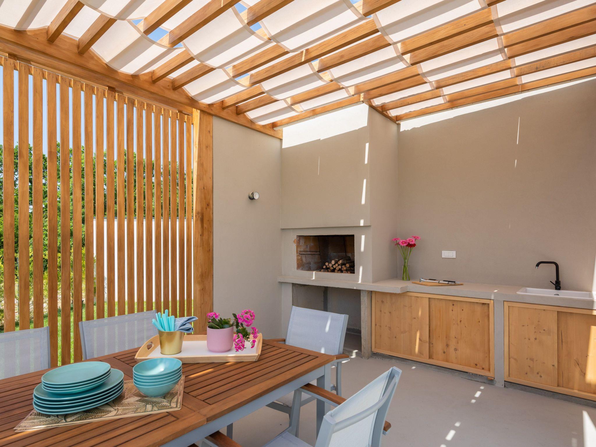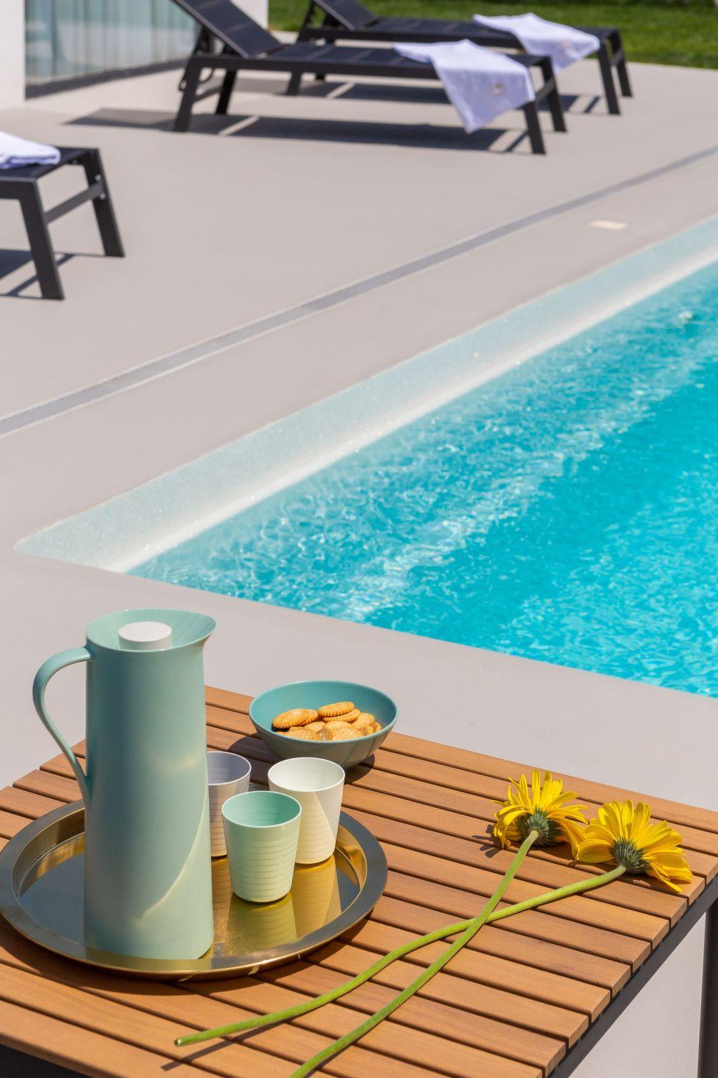 The maximum capacity of the Villa is 8 guests, 4 guests per villa. There are 4 spacious bedrooms altogether, with double beds and single beds, and in each one you can find a baby cot. In the romantic interior, you can find a charming living room with workspace and film collections, which offers you the best of both worlds. Each villa has an indoor and outdoor kitchen, just like the indoor and outdoor dining areas. You will find the outdoor kitchen and dining area under a beautiful wooden arbour by the pool.