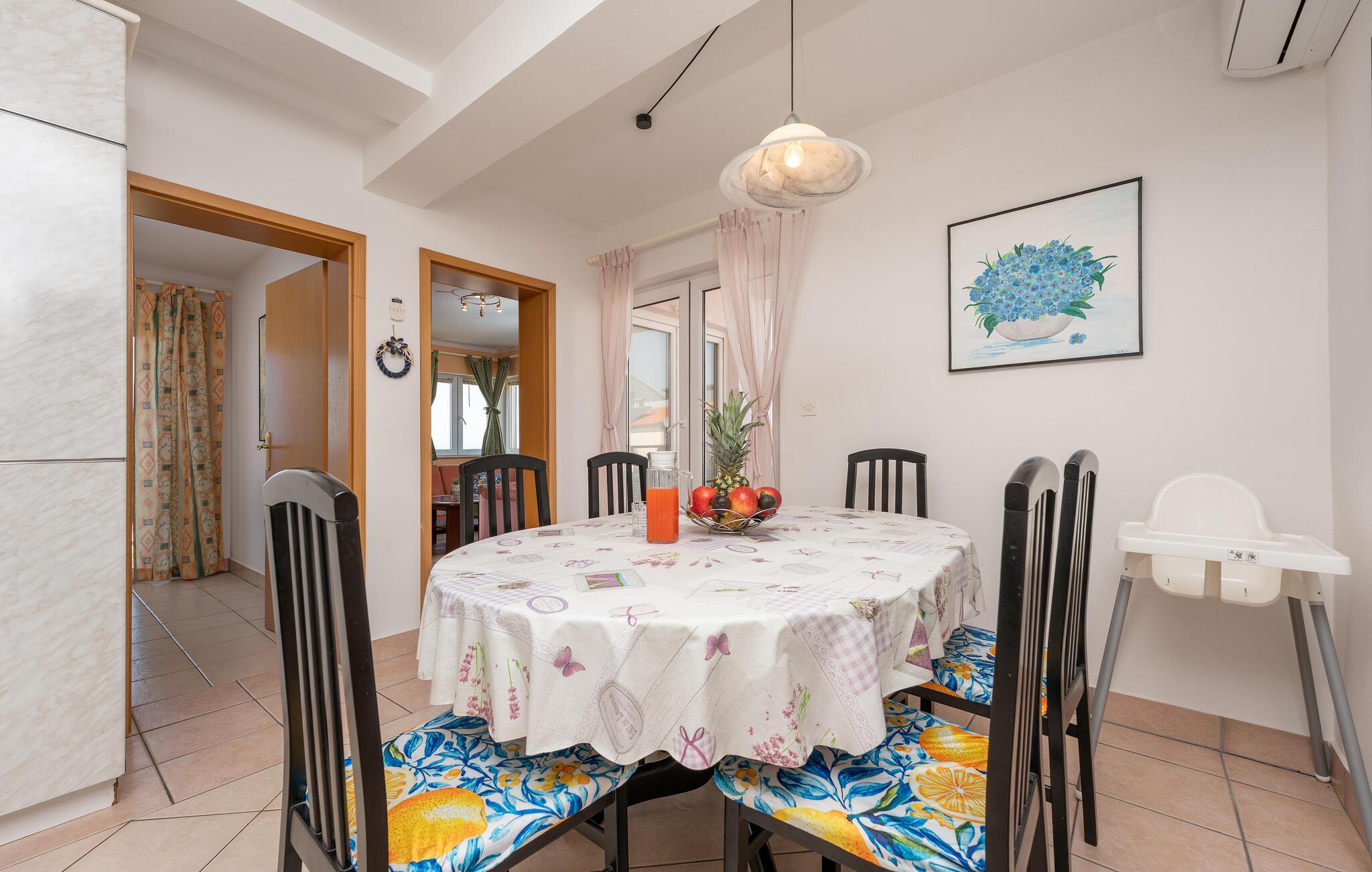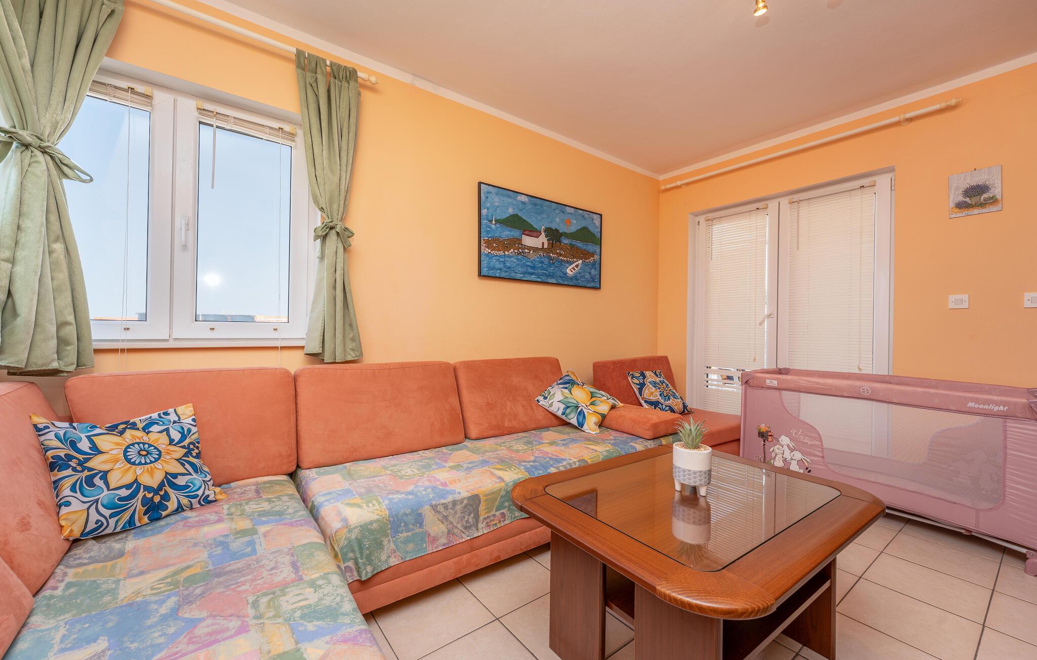 Verbringen Sie erholsame Urlaubstage in dieser einladenden Ferienwohnung. Die zentrale Lage nahe der Küste, das familiäre Wohnumfeld und die schöne Aussicht auf das Meer machen diese Unterkunft zu einem idealen Ausgangspunkt für Ihren Aufenthalt an der Adria. Machen Sie es sich im großzügigen Wohnbereich bequem. Der Raum ist mit einer gemütlichen Eckcouch, einem Fernseher und einer Vitrine ausgestattet und lädt zum Entspannen nach einem erlebnisreichen Tag ein. Bereiten Sie Ihre Mahlzeiten in der geräumigen Essküche zu und genießen Sie Ihre Speisen am großen Esstisch.