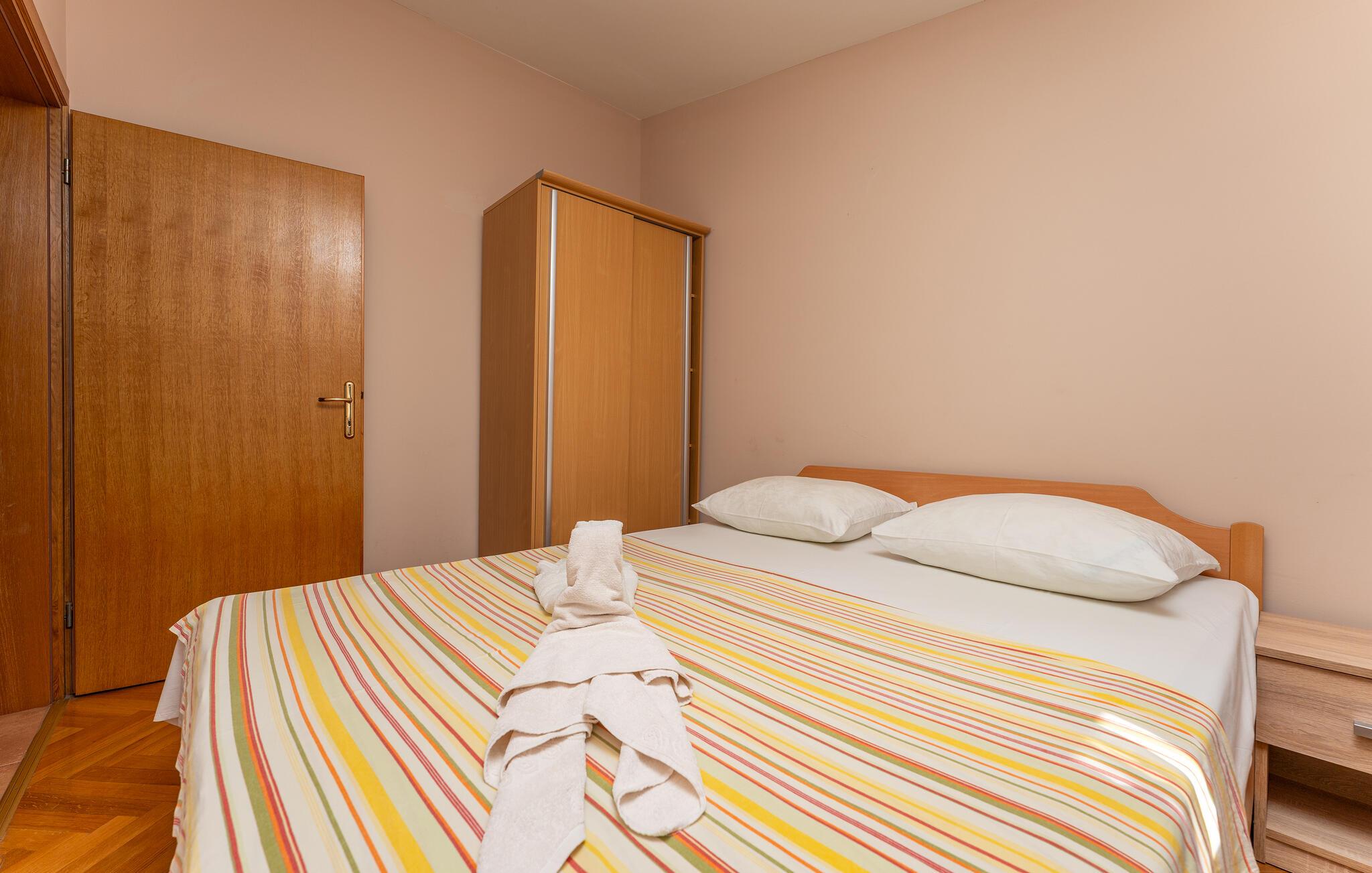 In diesem einladenden Apartment mit Meerblick erleben Sie und Ihre Familie entspannte Urlaubstage voller Komfort und Privatsphäre. Die helle und praktische Gestaltung der Ferienwohnung bietet Raum für Großfamilien oder befreundete Familien, die hier gemeinsam unvergessliche Momente erleben können. Der grüne Garten mit Grillplatz und die Terrasse laden dazu ein, im Freien zu speisen und die kroatische Sonne zu genießen. Nach einem Tag am nahen Strand lassen Sie den Abend entspannt bei einem guten Essen unter freiem Himmel ausklingen.