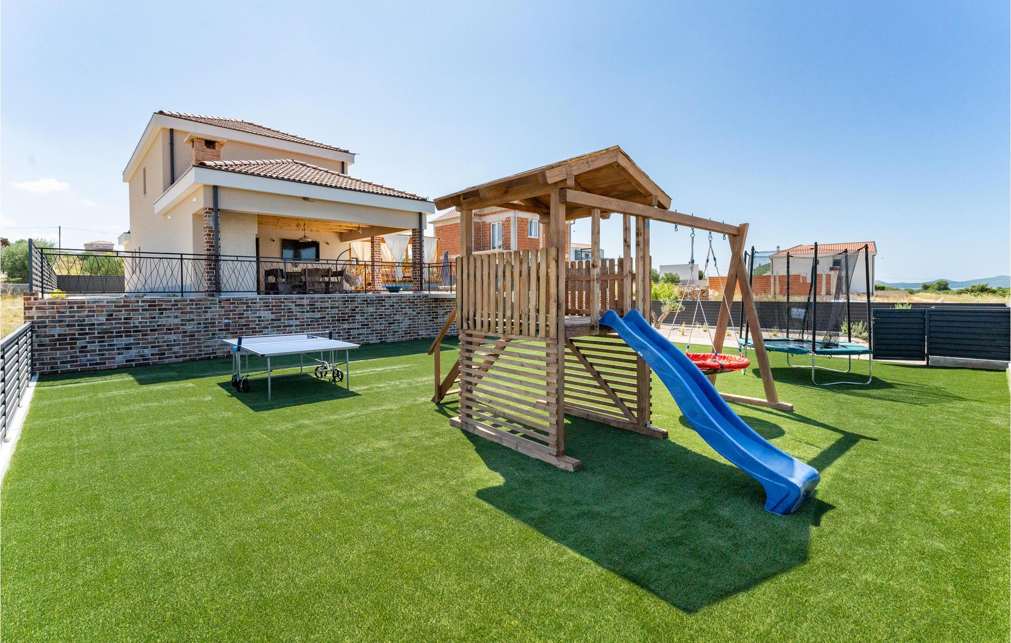 Treten Sie hinaus ins Freie und entdecken die ungewöhnlich gestaltete Lounge-Terrasse direkt über dem Pool. Verbringen Sie viele Stunden im beheizten und geräumigen Pool, während Ihre Kinder auf dem Rasen die Spielgeräte unsicher machen und viel Spaß haben.