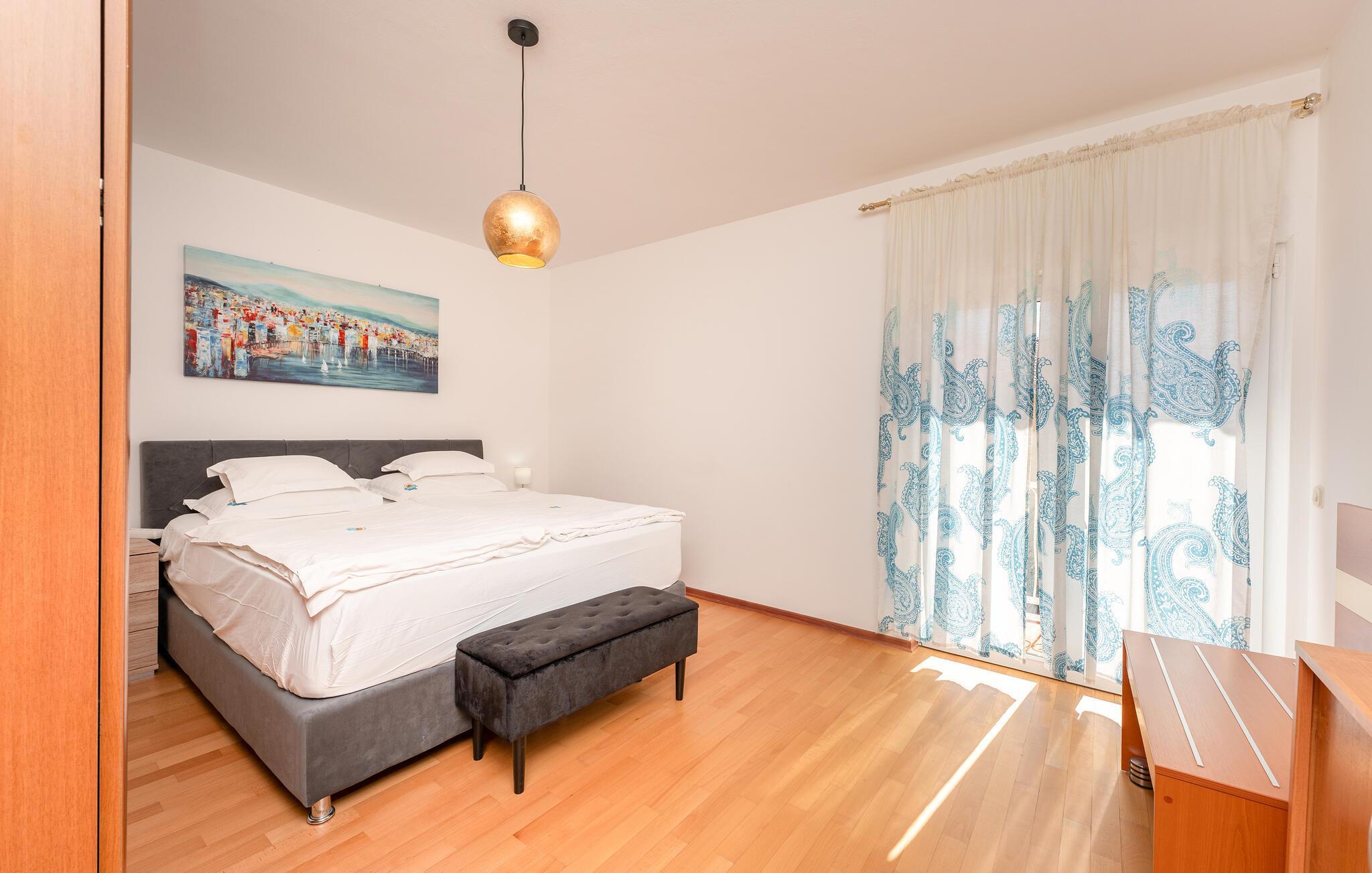 Erleben Sie einen entspannten Urlaub in dieser freundlich eingerichteten Ferienwohnung, die sich ideal für Familien oder Paare eignet. Die Unterkunft liegt in einer ruhigen Wohngegend, nur wenige Schritte vom Meer entfernt, und bietet Ihnen einen guten Ausgangspunkt für erholsame Tage an der dalmatinischen Küste. Treten Sie ein und lassen Sie sich vom hellen, offenen Wohnbereich empfangen. Der Raum ist geschmackvoll gestaltet und bietet zwei gemütliche Sofas, einen Esstisch und einen Fernseher für entspannte Abende. Die Küche ist funktional ausgestattet – ideal, um sich im Urlaub bequem selbst zu versorgen.