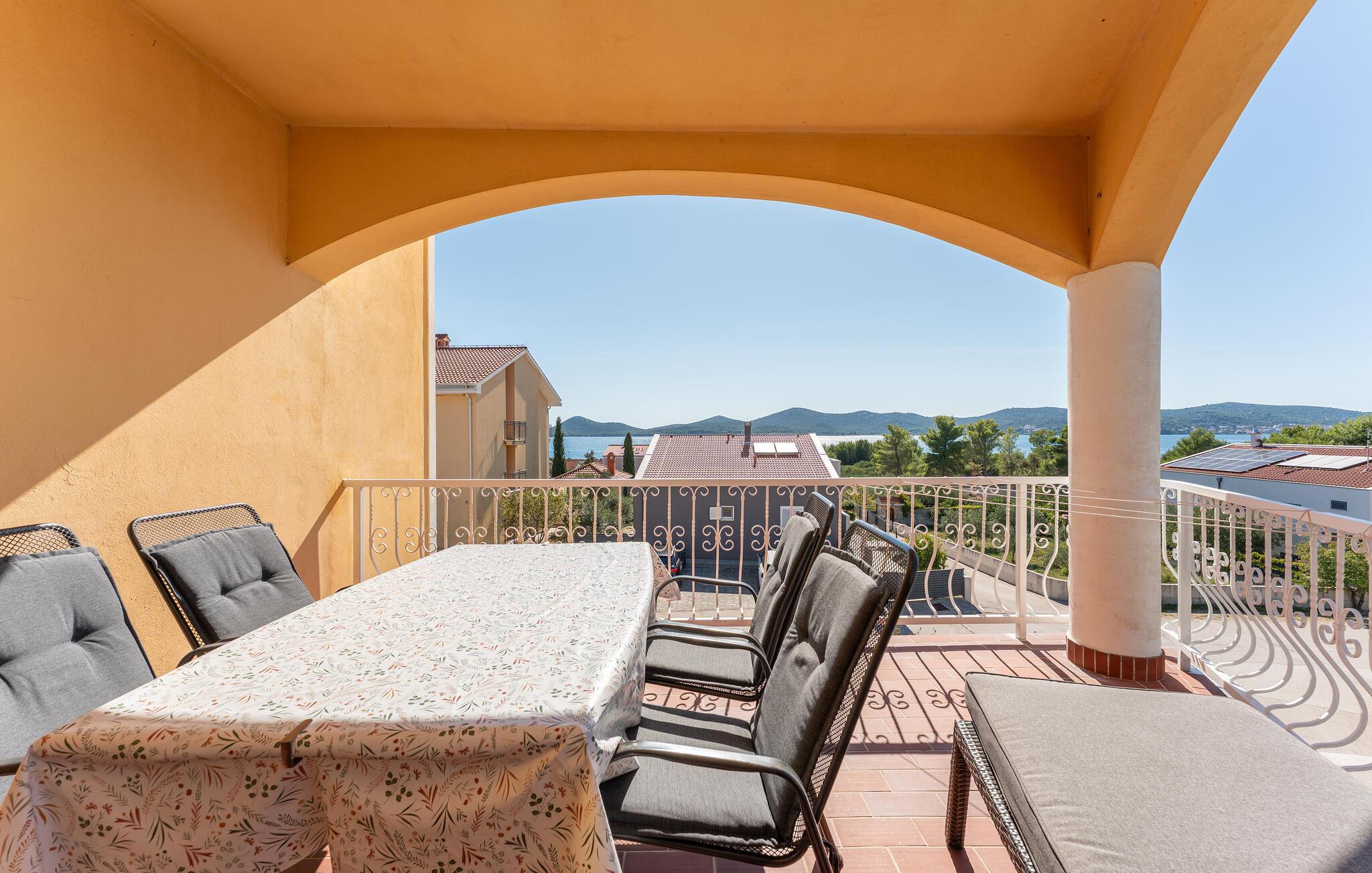 Gehen Sie hinaus auf den überdachten Balkon und genießen Sie den Blick auf das Meer und die vorgelagerten Inseln. Nehmen Sie Ihr Frühstück im Freien ein oder lassen Sie den Abend mit einem Glas Wein ausklingen, während die Sonne über der Adria untergeht.