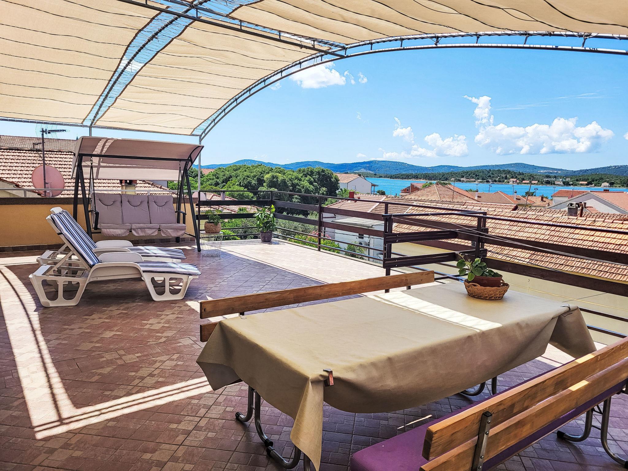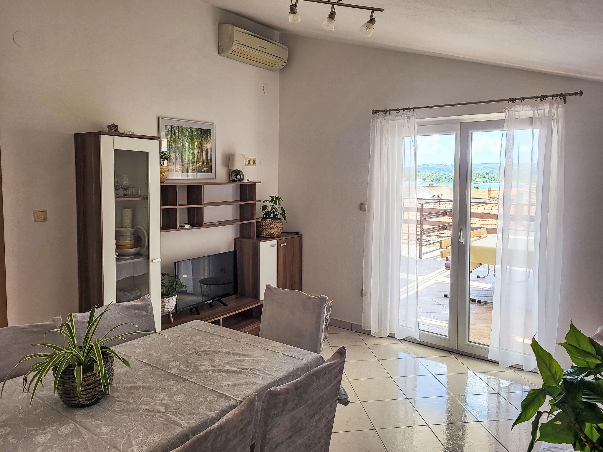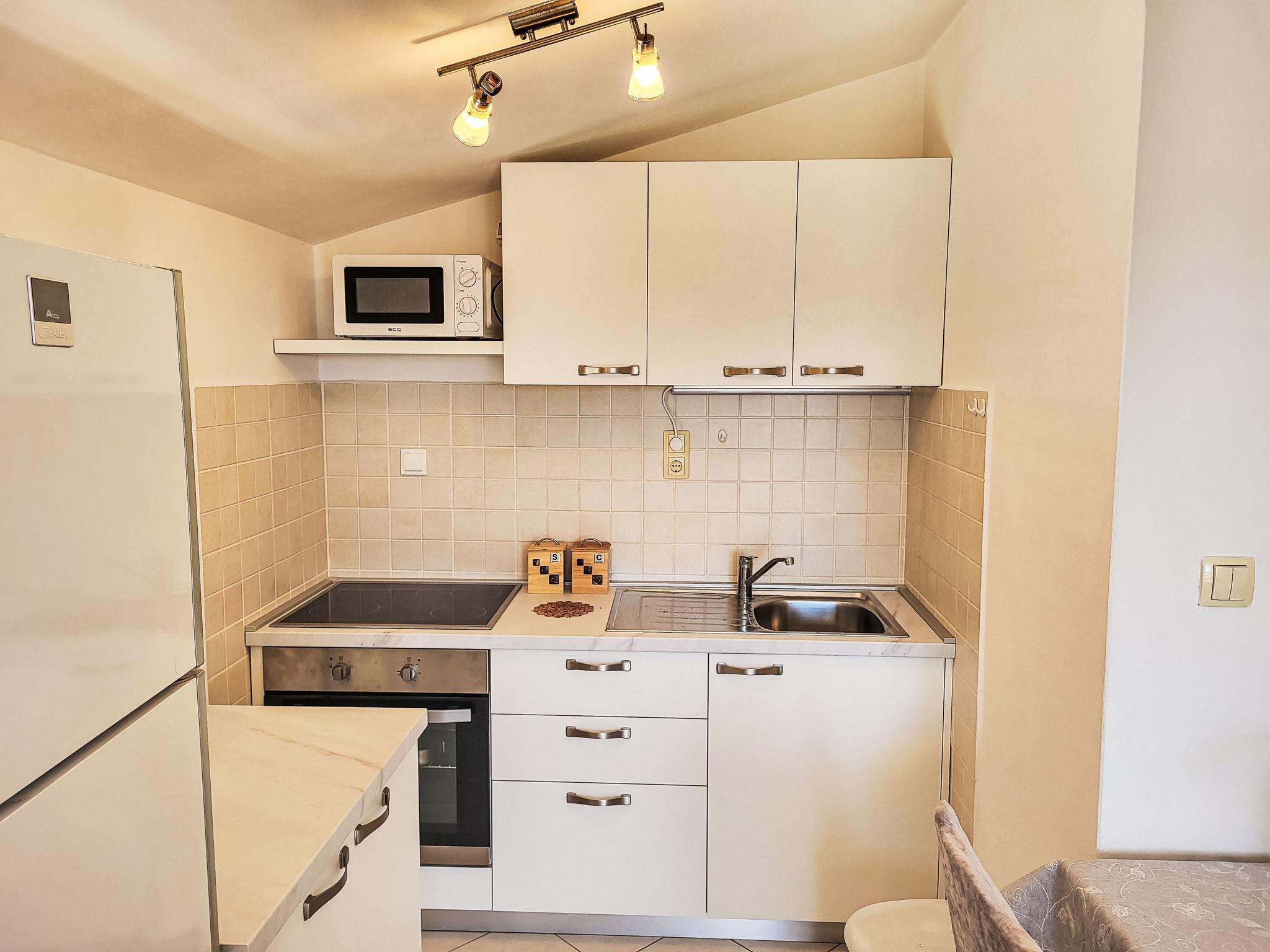 "Ana", 3-room apartment 55 m2 on 2nd floor. Living/dining room with 1 sofabed, satellite TV and air conditioning. Exit to the terrace. 1 room with 2 beds (90 cm, length 200 cm). 1 room with 1 double bed (2 x 80 cm, length 200 cm). Exit to the terrace. With sloping ceilings, open kitchen (oven, 4 ceramic glass hob hotplates, toaster, kettle, microwave, freezer, electric coffee machine) with dining table. Shower/WC. No heating option. Terrace 50 m2 partly roofed. Terrace furniture, deck chairs. View of the sea. Facilities: washing machine. Internet (WiFi, free). Parking (1 car) at the house. Please note: non-smokers only.