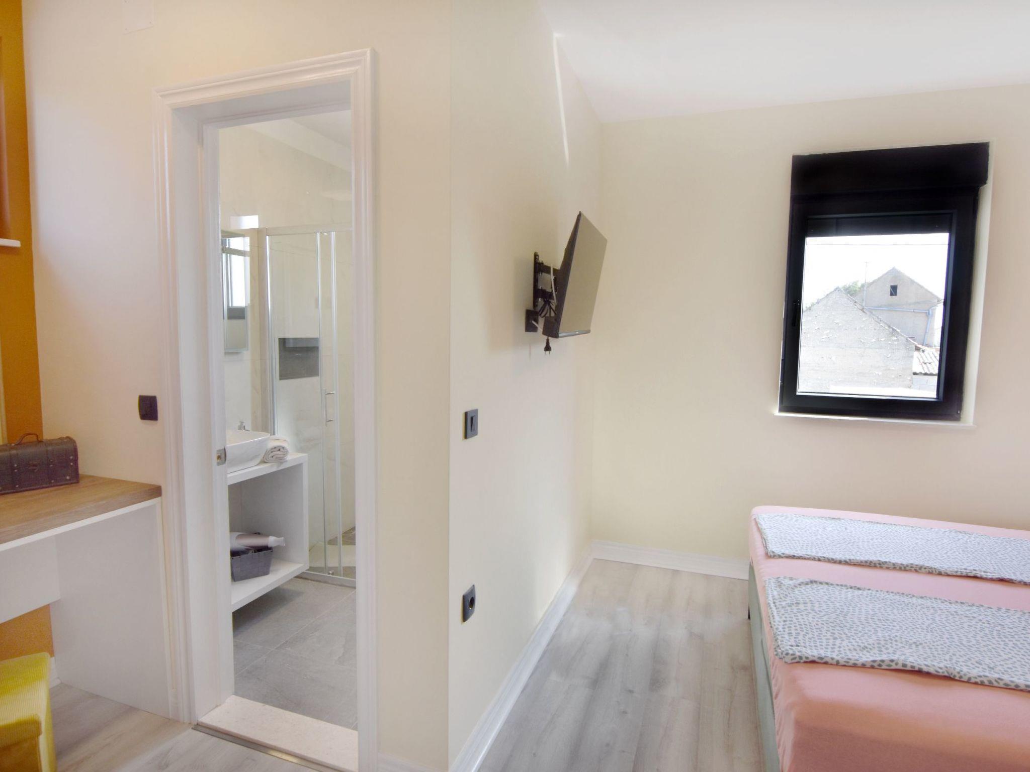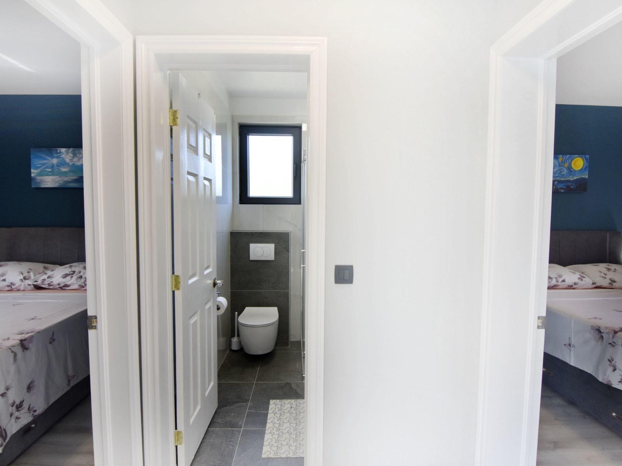 From the ground floor, an internal staircase leads to the rooms located on the first floor. The first bedroom, with a welcoming beauty corner for ladies, has a double bed and a private bathroom with shower cubicle, toilet, sink with cabinet and mirror, and hairdryer. Bath towels (two per person) and bed linen are provided. On the first floor, there are two further bedrooms, both with double beds, and a bathroom with shower, toilet and washbasin with mirror. All bedrooms are equipped with TV and air conditioner. Furthermore, on the first floor, you can enjoy a covered terrace furnished with armchairs and a table, offering a magnificent view of the surrounding nature and, in the distance, of the splendid Vrana Lake.