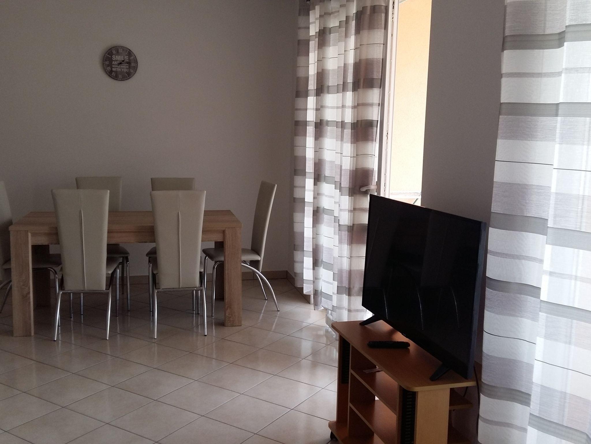 Ferienwohnung bietet Platz für 5 Gäste. Die Betten sind in Schlafzimmern, die es 2 gibt, und in Wohnzimmer, innerhalb einer Gesamtfläche von 61m2, angeordnet. Die Gäste haben eine eigene Terrasse zur Verfügung, auf der sie in warmen Sommernächten genießen können. Es ist erlaubt, Speisen auf dem Gemeinschafts-Grill vorzubereiten. In der Unterkunftseinheit besteht die Möglichkeit des Mitbringens von Haustieren, und die Dienstleistung ist im Preis der Unterkunft enthalten. IM PREIS INBEGRIFFEN: Kurtaxe, Endreinigung, Klimatisierung, Parkplatz, Internet, Wäschewaschen, Haustiere, Kinderbett, Zusatzbett, Bügeleisen, Bügelbrett, Föhn. Die Verfügbarkeit zusätzlicher Dienstleistungen in Ihrem reservierten Termin und die Preise derselben (falls nicht aufgeführt) müssen im Voraus überprüft werden. Zusätzliche Dienstleistungen die in der Zahlungsaufforderung nicht aufgeführt sind werden direkt beim Vermieter bezahlt, angenommen der Gast nutzt auch diese.
