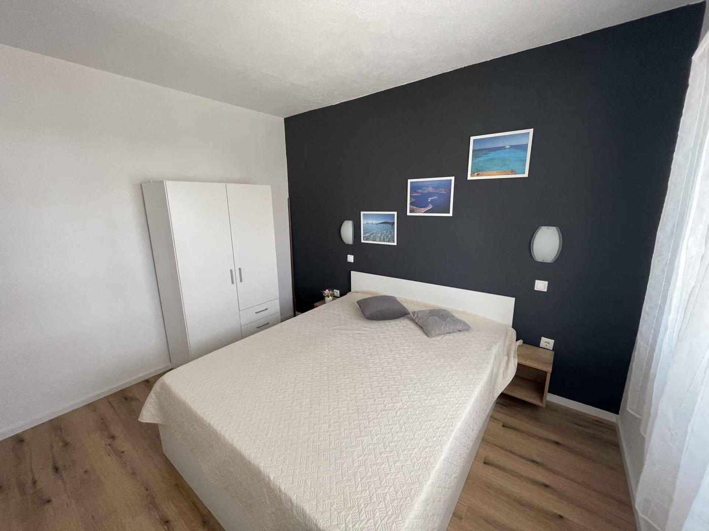 Die Wohnung umfasst ein Wohnzimmer mit kleinem Essbereich, eine Schlafcouch für zwei Personen sowie eine moderne Küchenzeile. Es gibt ein Schlafzimmer mit einem Doppelbett sowie ein Duschbad. Eine Klimaanlage ist vorhanden. Entspannen Sie auf dem überdachten Balkon mit seitlichem Meerblick!