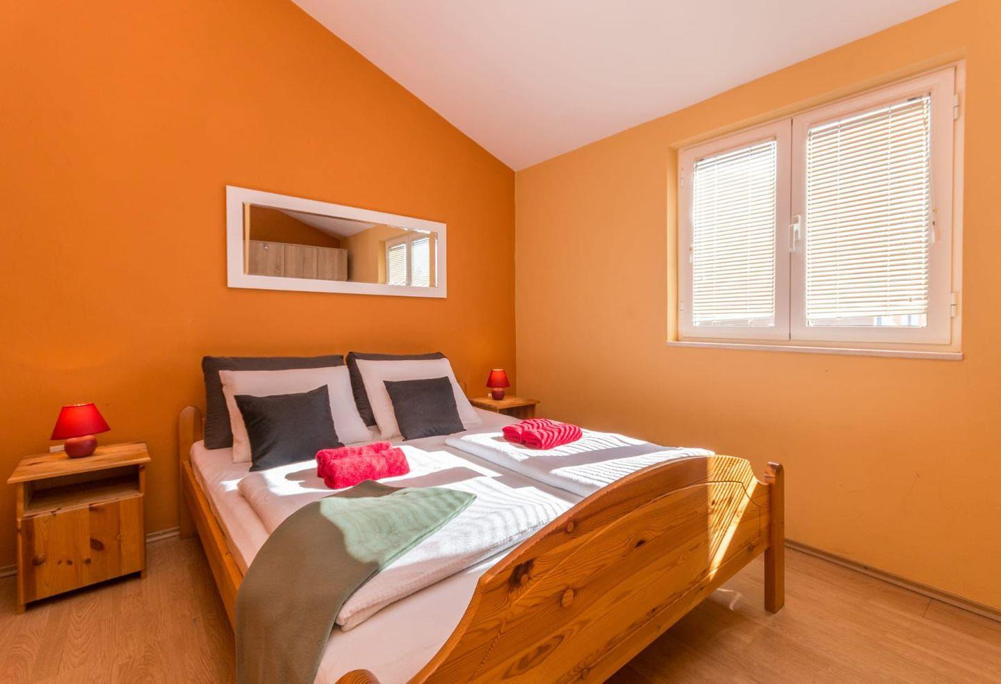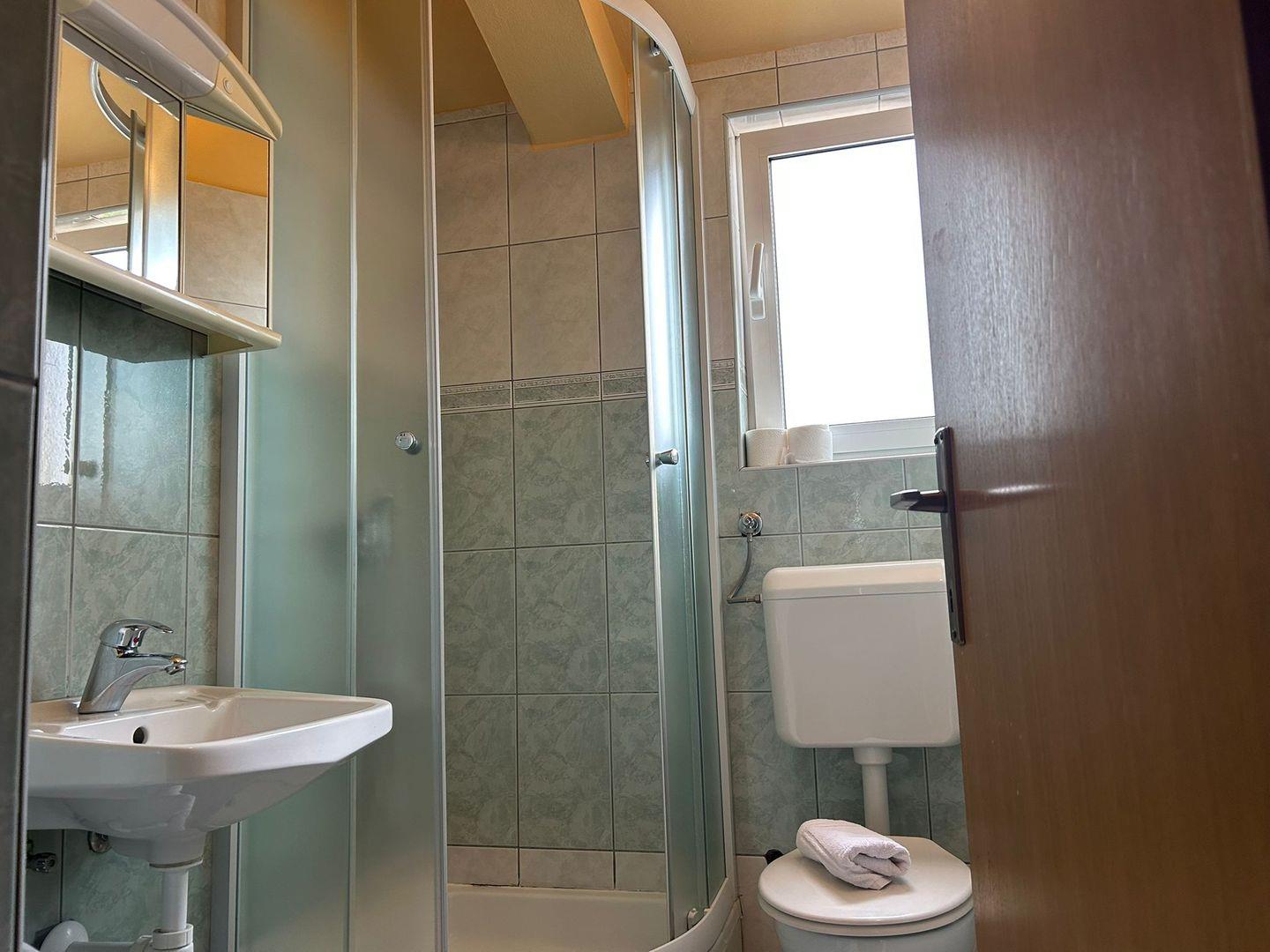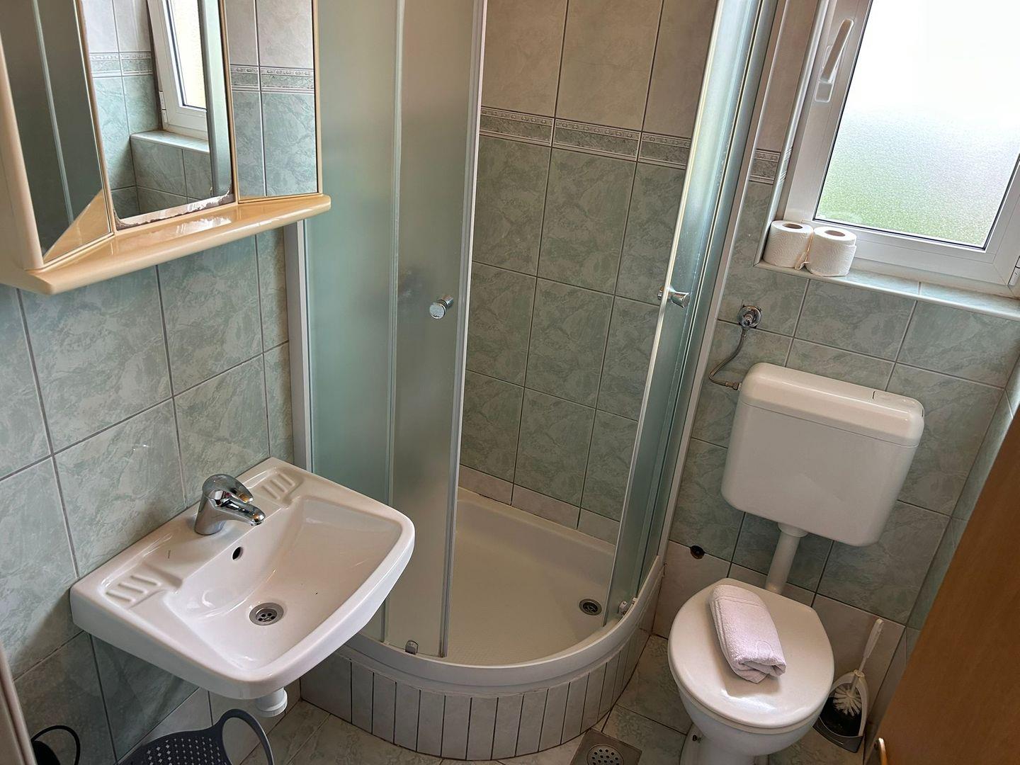 Die Wohnung verfügt über zwei separate Schlafzimmer mit gemütlichen Doppelbetten, Kleiderschränken und Tageslicht – ideal für erholsame Nächte. Das Badezimmer ist mit Dusche, Waschbecken,Waschmaschine, WC und Fenster ausgestattet und bietet alles, was Sie für einen angenehmen Aufenthalt benötigen.