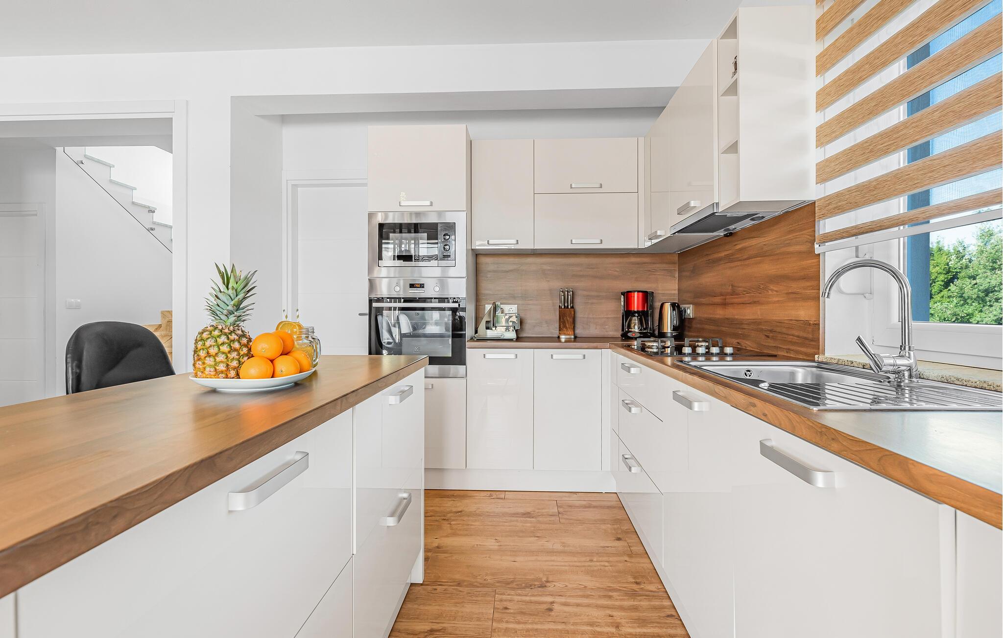 Das Ferienhaus bietet ideale Bedingungen für einen Urlaub mit Kindern und Haustieren und erstreckt sich über zwei Etagen. Die Einrichtung ist modern und ansprechend.