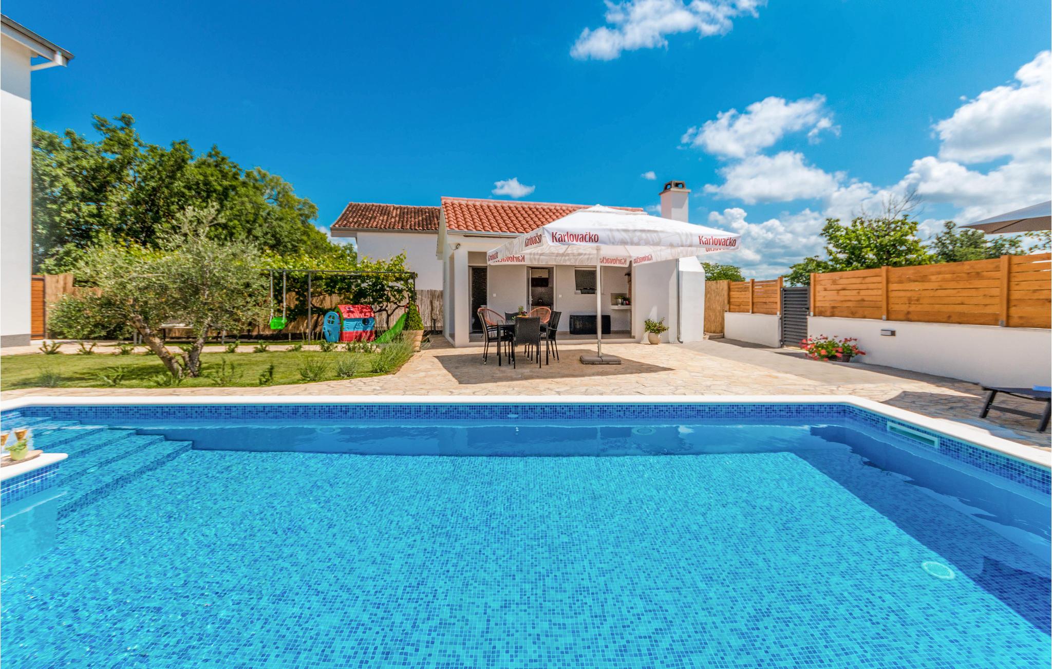 Verbringen Sie einen tollen und entspannten Urlaub in dieser schönen Ferienwohnung. Komfortable und hochwertige Ausstattung und Einrichtung sowie ein moderner Fliesenboden bieten Ihnen die idealen Rahmen für einen unbeschwerten Urlaub. Während die helle Wohnung Ihnen alles zum Wohlfühlen bietet, können Sie auch im Freien viele Stunden verbringen. Der schön angelegte Garten, in deren Herzen der Pool liegt, wird zu Ihrem natürlichem Familientreffpunkt. Baden, sonnen und spielen Sie im Garten und kochen und grillen am Abend im Gartenhaus.