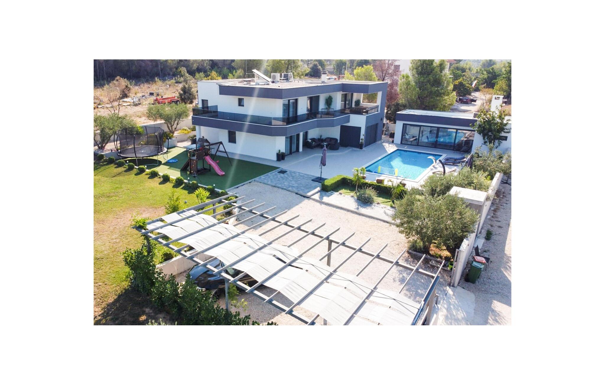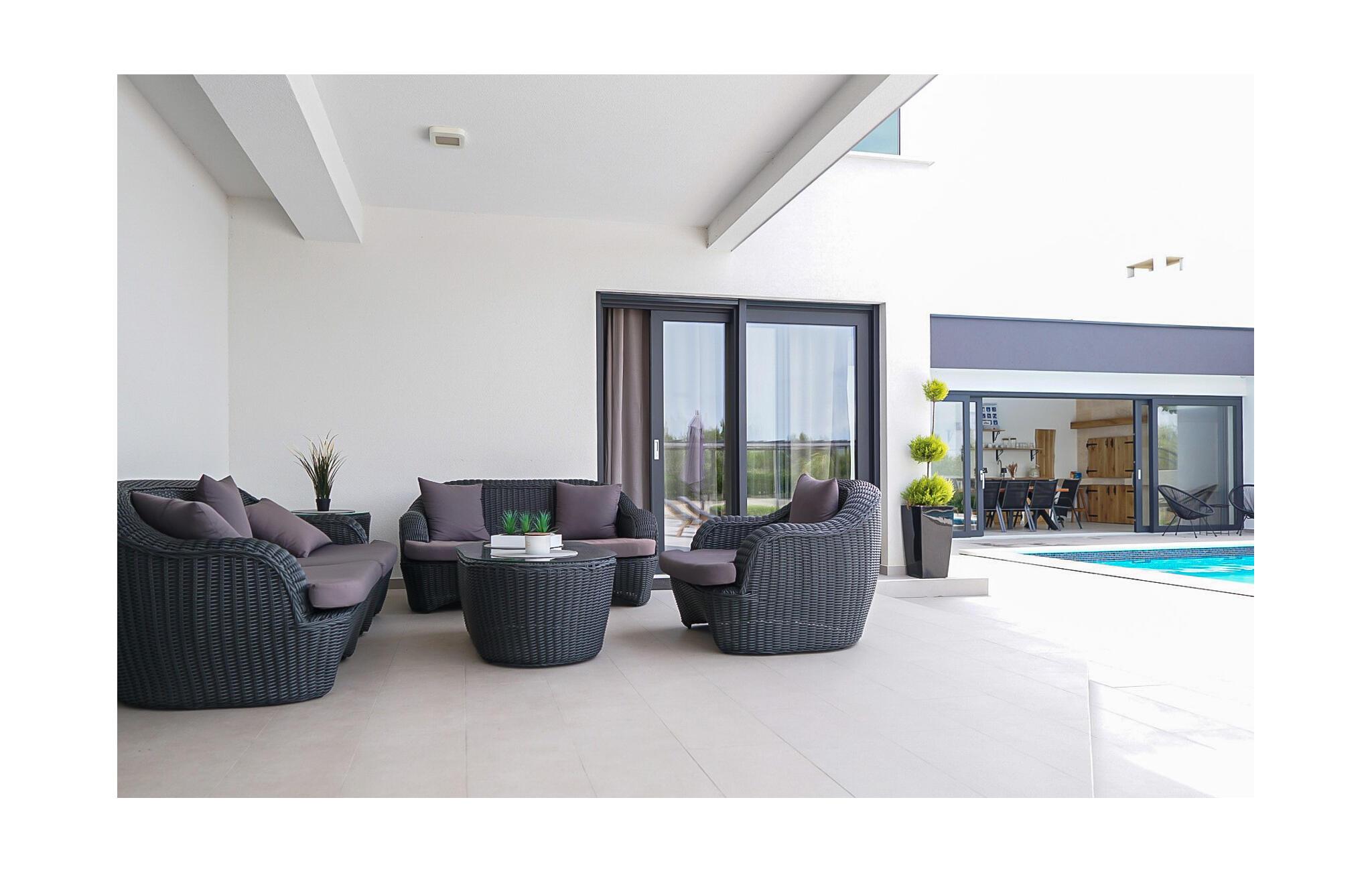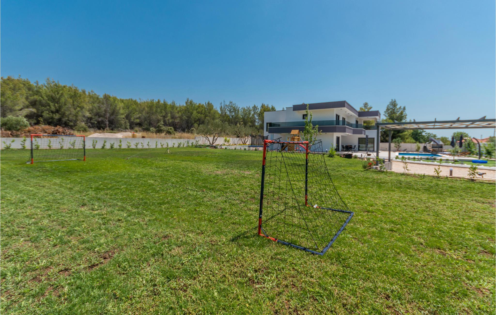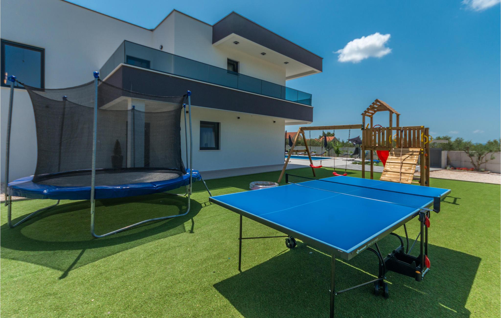 Kommen Sie mit Ihrer Familie oder den Freunden in dieses schöne Ferienhaus und genießen Sie einen luxuriösen Urlaub. In den gut ausgestatteten Räumen werden Sie sich sofort wohlfühlen. Hier finden Sie nicht nur eine geräumige Wohnküche und gemütliche Schlafzimmer vor. Es erwarten Sie auch ein Wellness-Bereich mit Whirlpool und Sauna, sowie Fitnessgeräte. Im ersten Stock gibt es einen großen Balkon und im Erdgeschoss kommen Sie auf die Terrasse mit Swimmingpool. Lassen Sie Ihre Kinder im Garten an den Spielgeräten herumturnen oder im Pool planschen, während Sie sich auf den Liegen sonnen und Ihren Gedanken nachhängen.