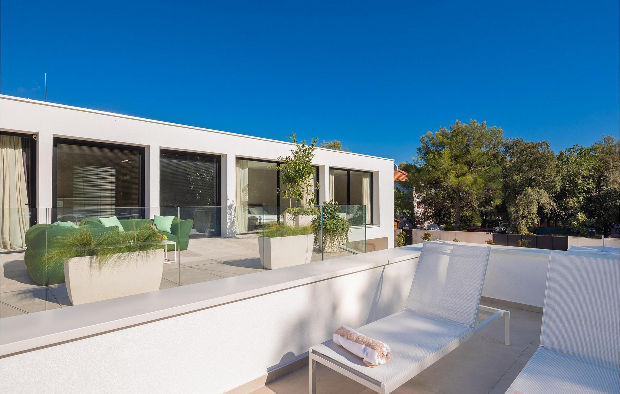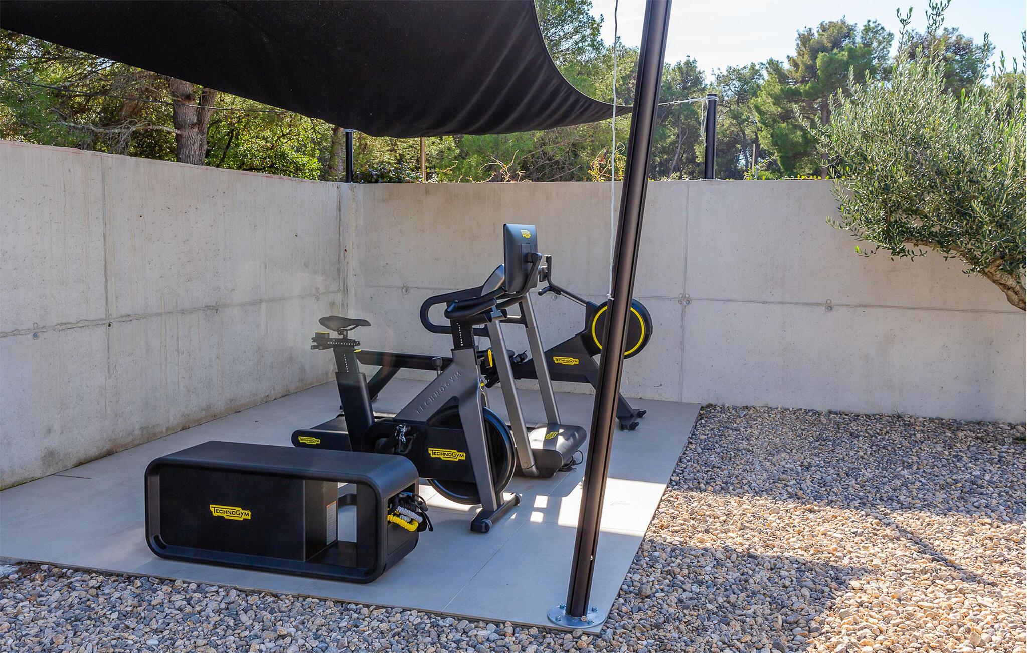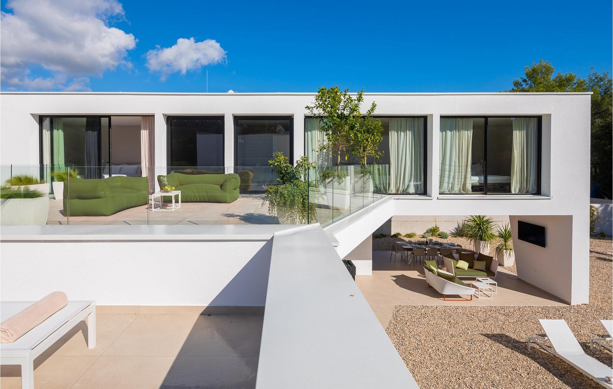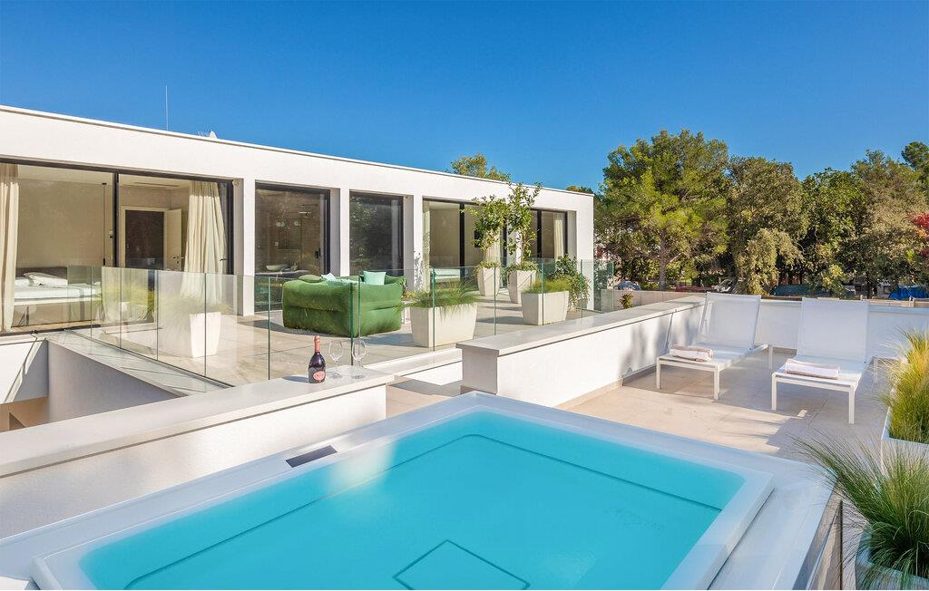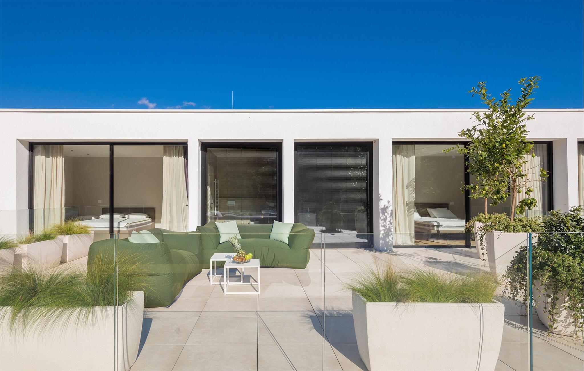 Auch der elegante Außenbereich lässt keine Wünsche offen. Servieren Sie sich Ihr Frühstück auf der schönen Terrasse, erfrischen Sie sich im herrlichen Pool, plaudern Sie bei einem Glas Wein auf bequemen Lounge-Möbeln und nutzen Sie den Fitnessbereich für Ihr Workout. In der Sommerküche können Sie mediterrane Beilagen für stimmungsvolle Grillabende zubereiten, und auf der Terrasse im Obergeschoss lädt ein Whirlpool zu romantischen Momenten bei Sonnenuntergang ein.