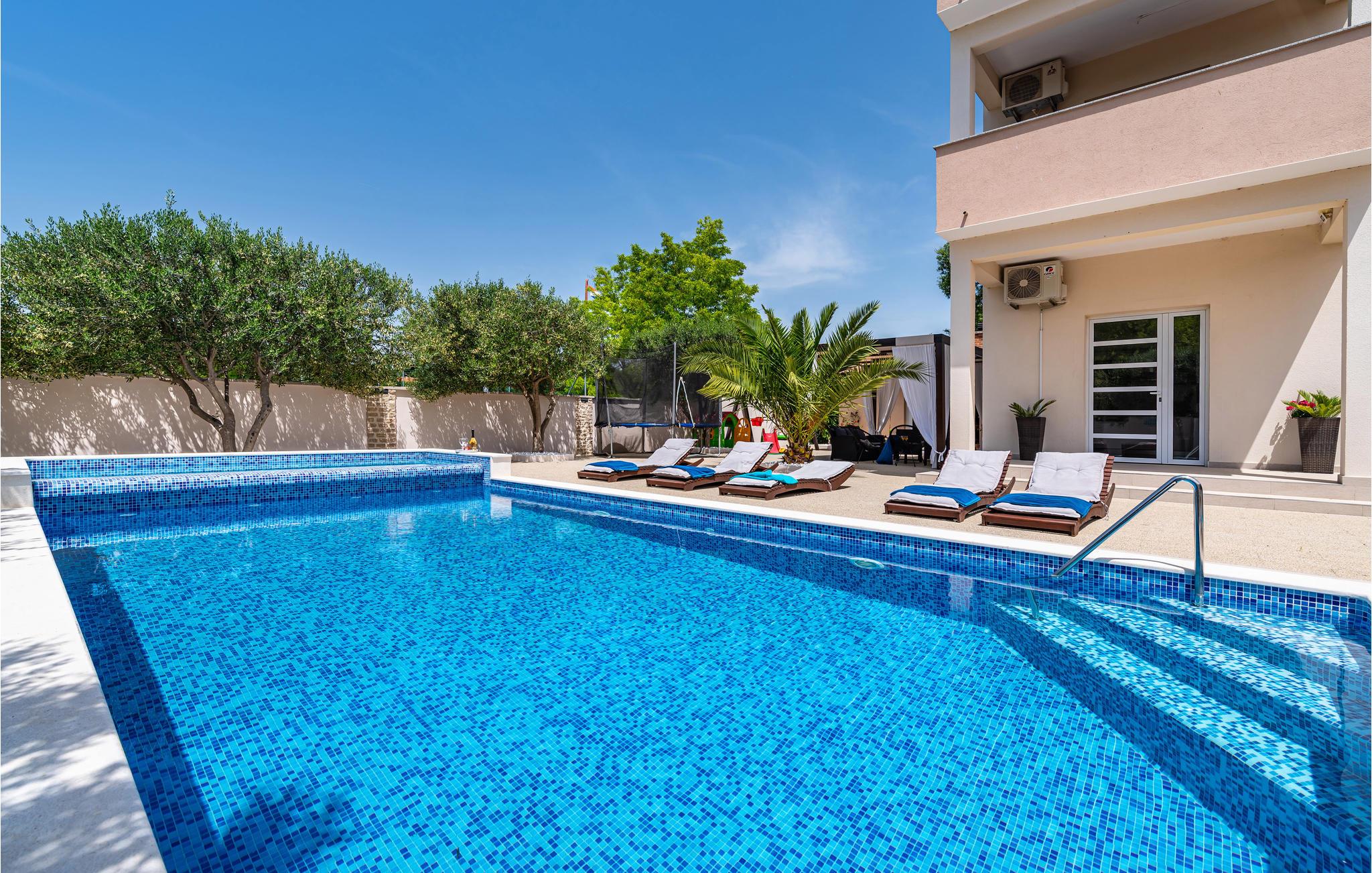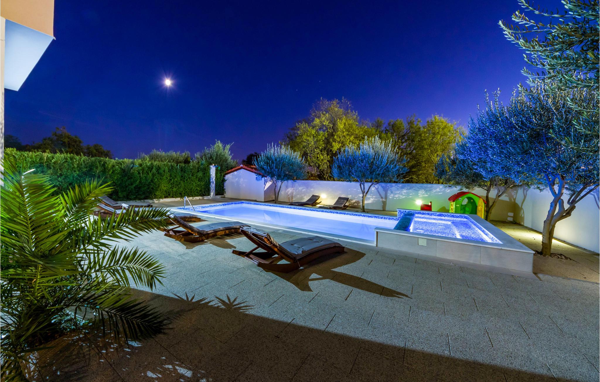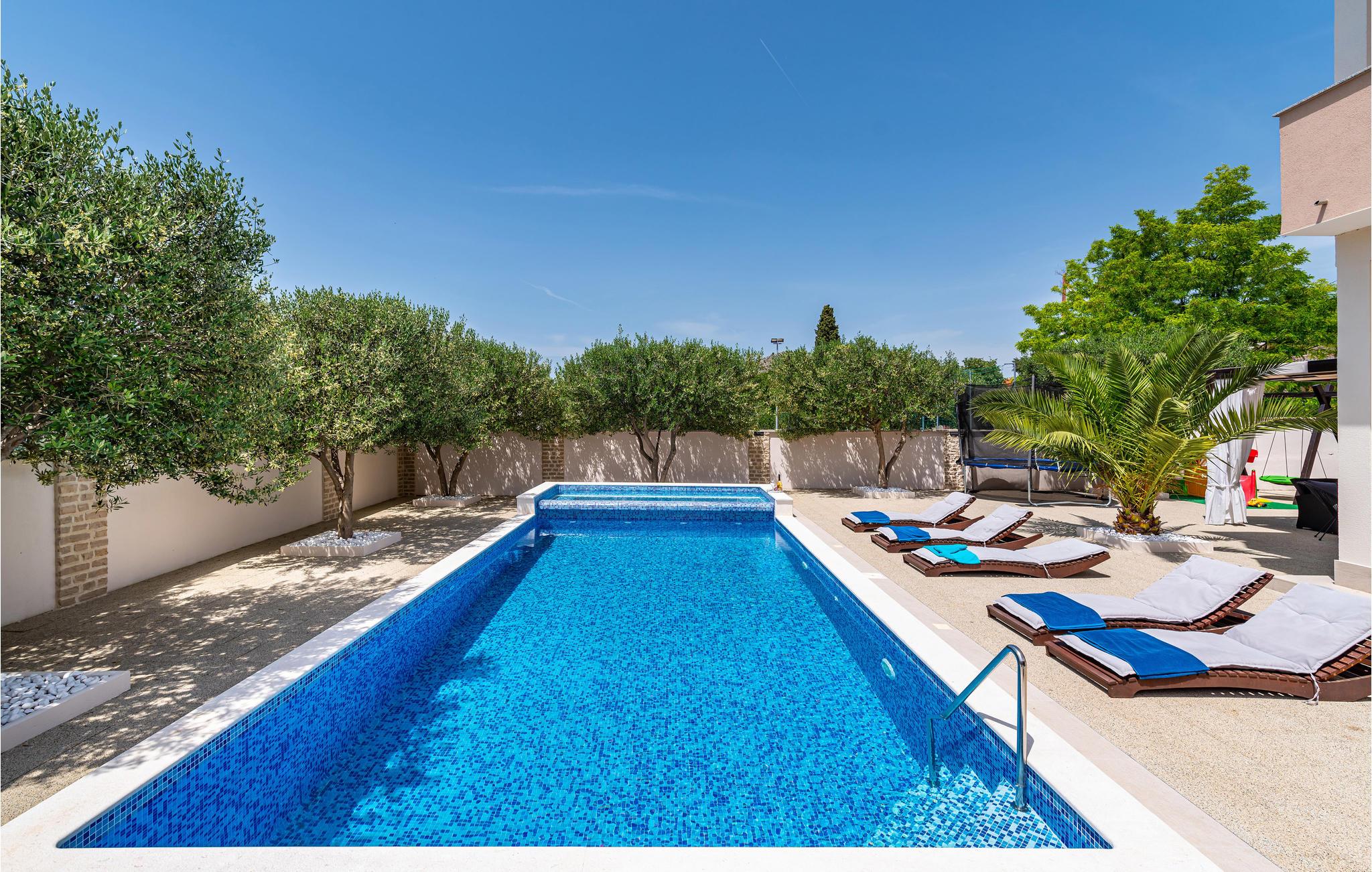 Radašinovci ist ein typisches, malerisches dalmatinisches Dorf in der Nähe des Vrana-Sees und nicht weit von der attraktiven Stadt Biograd na Moru entfernt. Hier befindet sich dieses schöne und modern ausgestattete Ferienhaus. Es besteht aus zwei komfortablen und geräumigen Apartments, die durch eine Innentreppe miteinander verbunden sind. Auf dem gepflegten Grundstück gibt es eine Außenküche mit Grill, Spielmöglichkeiten im Freien und einen Pool für viel Spaß und echte Erfrischung. Im zweiten Stock gibt es eine Sauna und einen Fitnessraum sowie eine kleinere Küche. Die Terrassen sind ideal für gemütliches Zusammensitzen mit einem Glas Ihres Lieblingsgetränks, während Sie gleichzeitig die wunderschöne Landschaft und Sonnenuntergänge genießen. Durch die Nähe zu den wichtigsten Verkehrspunkten können die Nationalparks Krka, Paklenica und Plitvicer Seen schnell erreicht werden. Alle bieten eine einzigartige natürliche Schönheit.