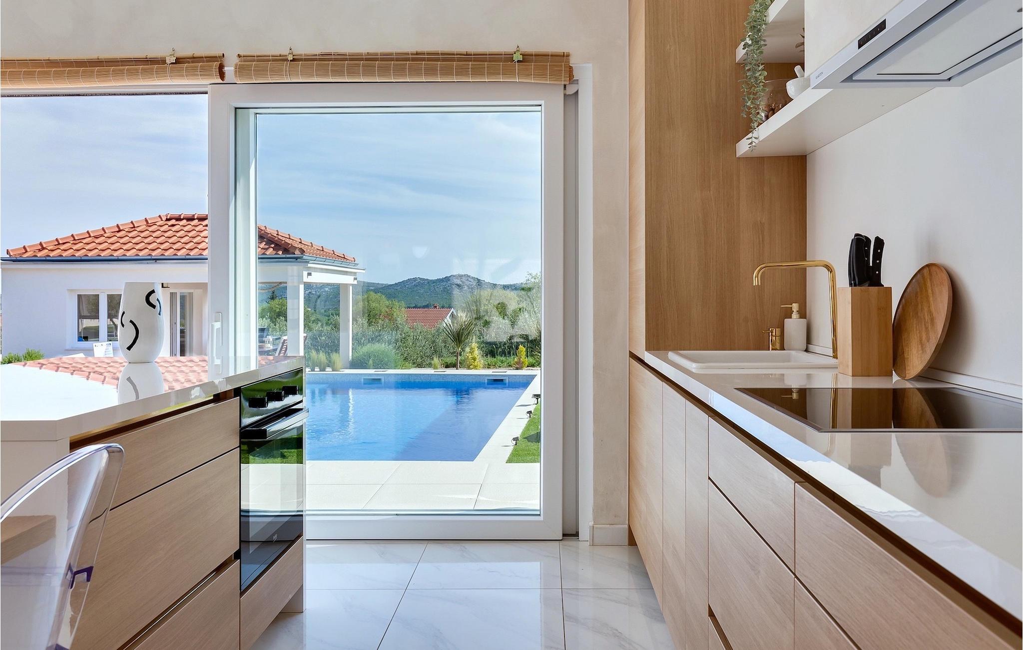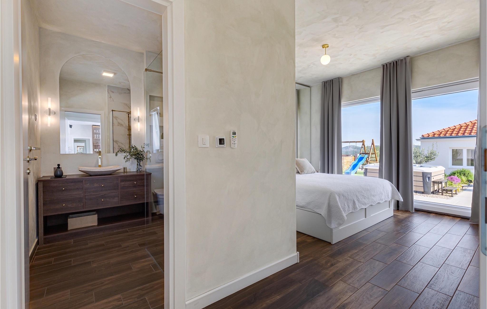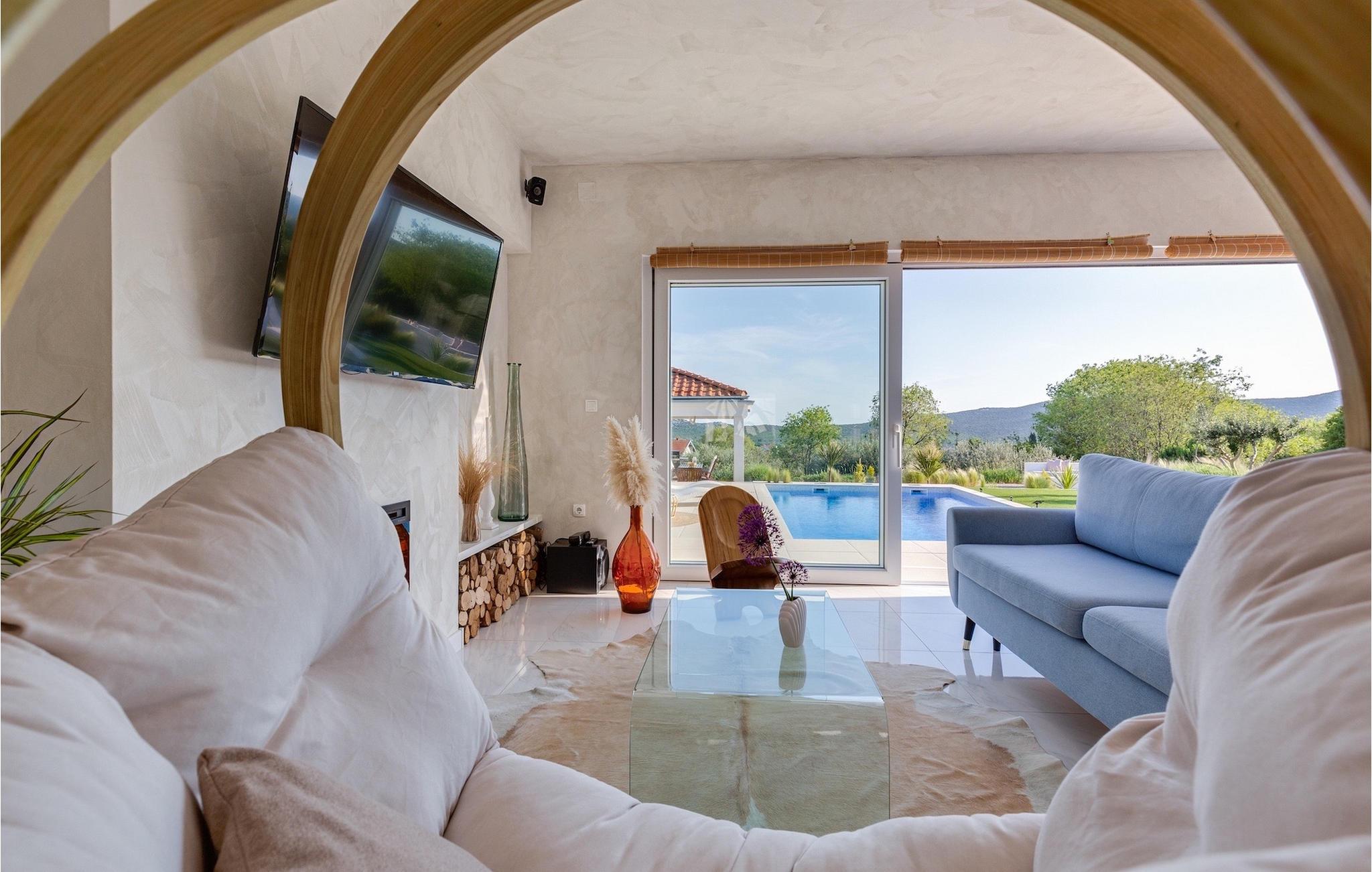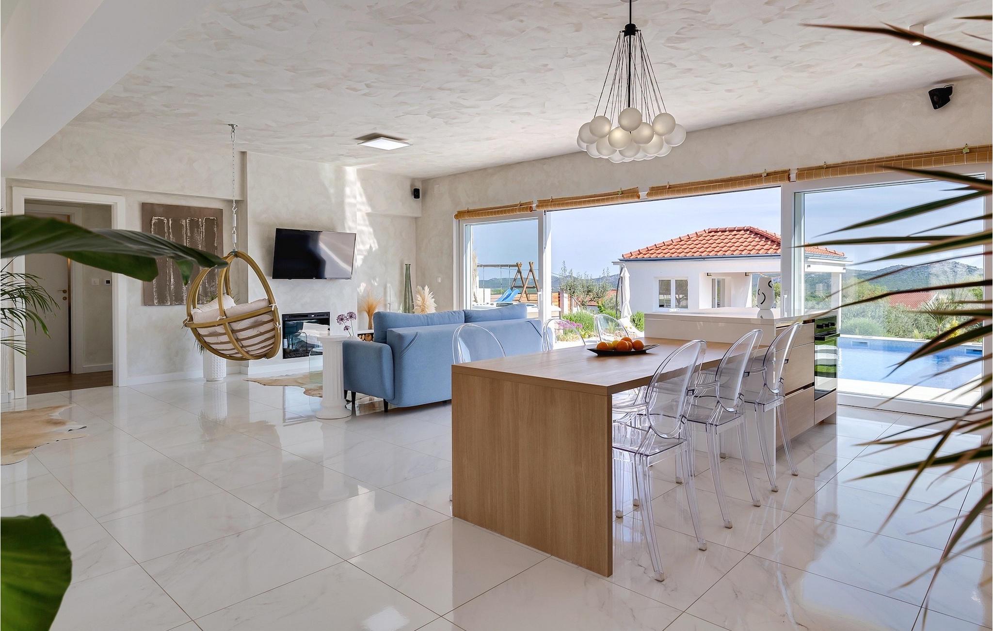 Das Herzstück der Villa Nebesi ist sicherlich der helle offene Wohn- und Essbereich mit Küche und wundervollem Ausblick auf den Außenbereich. Die Mischung aus Naturtönen und stilvollen Farbakzenten erzeugt ein wohnliches Ambiente, in dem Sie sich wie zu Hause fühlen werden. In der modernen Küche können Sie Ihr Lieblingsgericht zubereiten und anschließend mit Blick auf den schönen Außenbereich der Villa genießen. Der Wohnbereich mit Hängesessel und gemütlichem Sofa am Kamin lädt zum Verweilen ein. Ein Sitzecke mit Schachspiel rundet diesen Bereich ab. Im Erdgeschoss befinden sich außerdem zwei komfortable Schlafzimmer mit jeweils eigenem Bad sowie ein Gäste-WC. Praktischerweise verfügen die Schlafzimmer und der Wohn- und Essbereich über große Glastüren, die Sie zum nicht minder attraktiven Außenbereich der Villa führen. Im Mittelpunkt steht der private Pool, in dem Sie sich an warmen Sommertagen erfrischen können. Um ihn herum befinden sich zahlreiche Sonnenliegen sowie die Außendusche. Die kleinen Gäste werden sich sicherlich über den Spielplatz mit Trampolin und Tischtennisplatte freuen, was Villa Nebesi zum idealen Ferienhaus für Kleinfamilien macht. Außerdem befindet sich am Pool ein Sitzbereich und eine Sommerküche mit überdachtem Außenessbereich und Gasgrill. Buchen Sie Villa Nebesi für einen unvergesslichen Urlaub in Dalmatien.Die charmante Villa Nebesi befindet sich im Ort Radasinovci in der Gemeinde Benkovac und in der Nähe größerer touristischer Städte wie Zadar (55 km Entfernung) oder Sibenik (40 km Entfernung). Die Lage ist ein guter Ausgangspunkt falls Sie gerne die Schönheit der Inseln (z. B. Pasman, Ugljan, Iz) bewundern möchten. Besuchen Sie naheliegende Inseln und genießen Sie einsame Buchten, das kristallklare Meer und den natürlichen Duft der Kiefern. Nur 11 km von der Villa entfernt befindet sich auch der größte See Kroatiens - der Vrana-See, der seit dem 21. Juli 1999 Naturschutzgebiet ist. Erkunden Sie den See direkt am Meer, umgeben von Bergen. Hier können Sie wandern, Rad fahren oder ein Camping Ausflug machen. Außerdem gibt es mehrere Nationalparks (Kornati, Krka, Paklenica, Nördlicher Velebit und die weiter entfernten Plitvicer Seen) und zahlreiche kulturelle und historische Sehenswürdigkeiten in Zadar und Sibenik zu entdecken. Der berühmte Touristenort Biograd na Moru (20 km Entfernung) bietet unzählige gastronomische Einrichtungen und Strände sowie den Fun Park Mirnovec, falls Sie zusätzliche Aktivitäten für Ihre Familie wünschen.