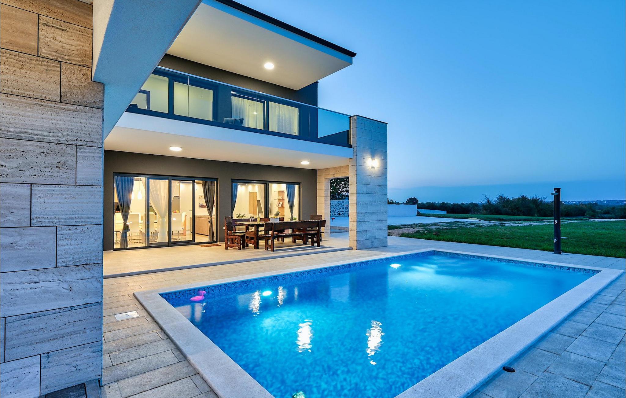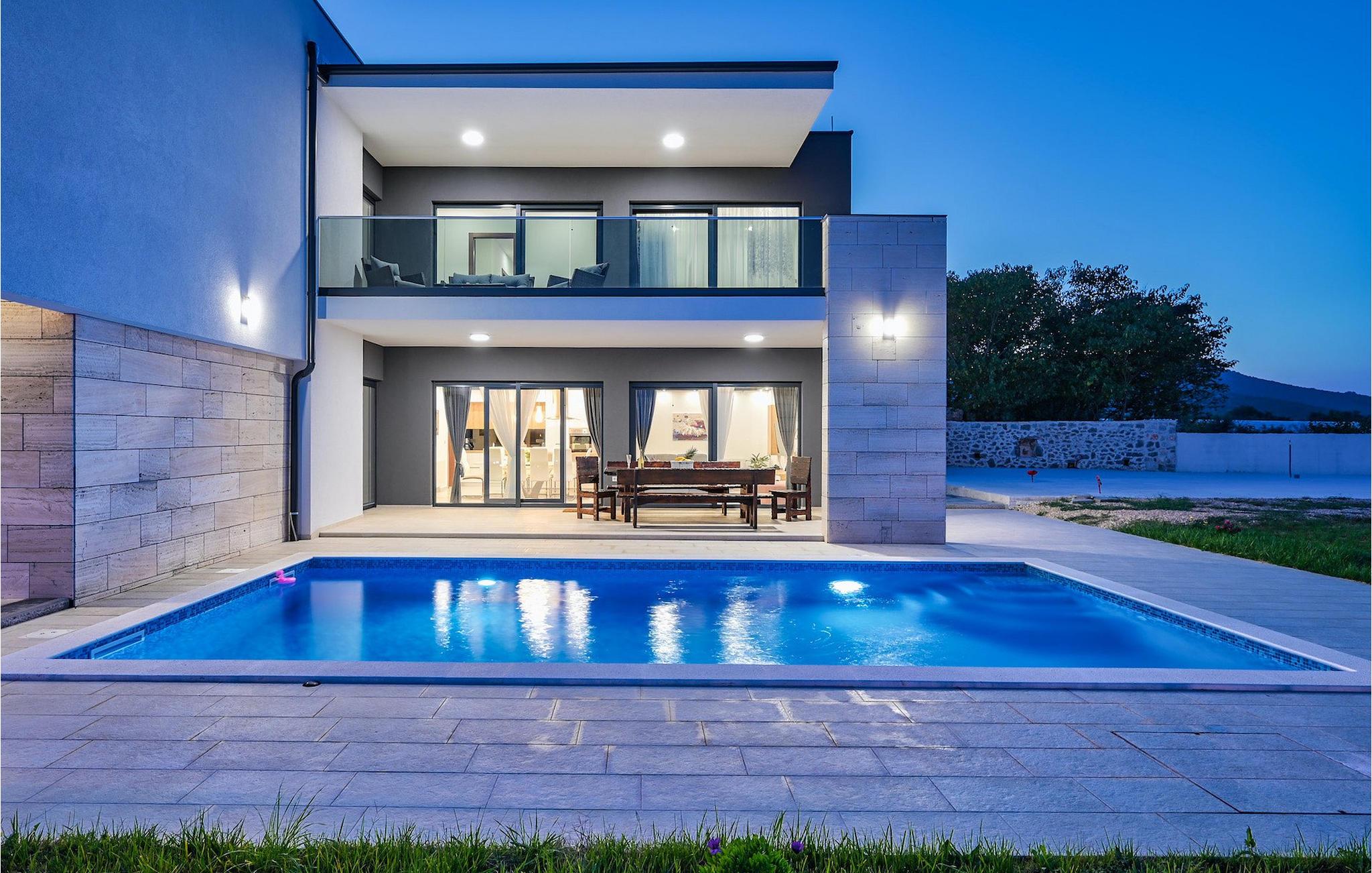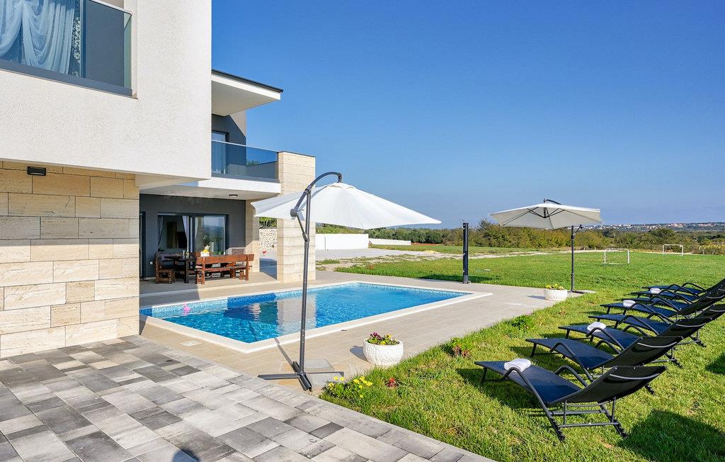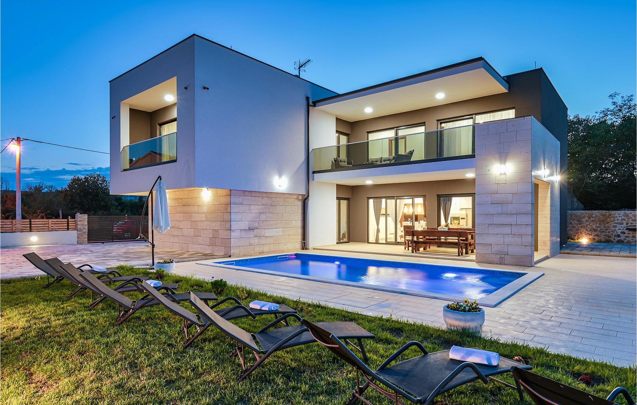 If you are looking for a beautiful, modern villa close to the sea and untouched nature, Villa FA Exclusive is your right choice! This wonderful villa can accommodate 8 guests in 4 bedrooms and it has much more to offer. If you are looking for entertainment or a little work-out session you will find some fitness equipment and darts on the ground floor. The ground floor also offers a spacious, contemporary furnished area with a living and dining room and a nice, furnished kitchen. Here you will also find a bedroom, while the other 3 are located on the first floor. All the bedrooms have double beds, air conditioners and TVs at disposal and the ones on the floor also have en suite bathrooms. The outdoor area with the inviting pool is the perfect place for sunbathing and relaxation on one of the sun loungers. If you are traveling with kids the garden disposes over a playground for children as well as a trampoline. For al fresco dinner nights there is also a grill available and the first beach is only 3 km away.Die Villa FA Exclusive befindet sich in einen kleinen Ort Donje Rastane gegenüber der Pasman Insel und nur etwa 20 km entfernt von einem der sehenswerten Touristenzentrums Dalmatiens - Zadar. Diese Lage ist perfekt für diejenigen die gerne am Strand ausruhen, aber auch für aktive Urlauber da der Nationalpark Paklenica nur 50 km entfernt ist. In der Nähe befindet sich auch der Vrana See mit schöner Natu, zwischen Meer und den Bergen. Hier kann man schön wandern, Radtouren machen und die Natur bewundern. Besuchen Sie auch unbedingt die wunderschöne Stadt Zadar mit zahlreichen kulturellen und gastronomischen Angebot. Besuchen Sie viele Museen, bewundern Sie die antike Architektur oder genießen Sie natürliche Strände und das aktive Nachtleben. Im Stadtzentrum von Zadar dürfen Sie nicht verpassen das alte Forum mit der Kirche des hl. Donatus (aus den 9. Jahrhundert) zu besuchen. Dies ist eines der wichtigsten Denkmale von Zadar, mit der Kirche im romanischen Stil erbaut.