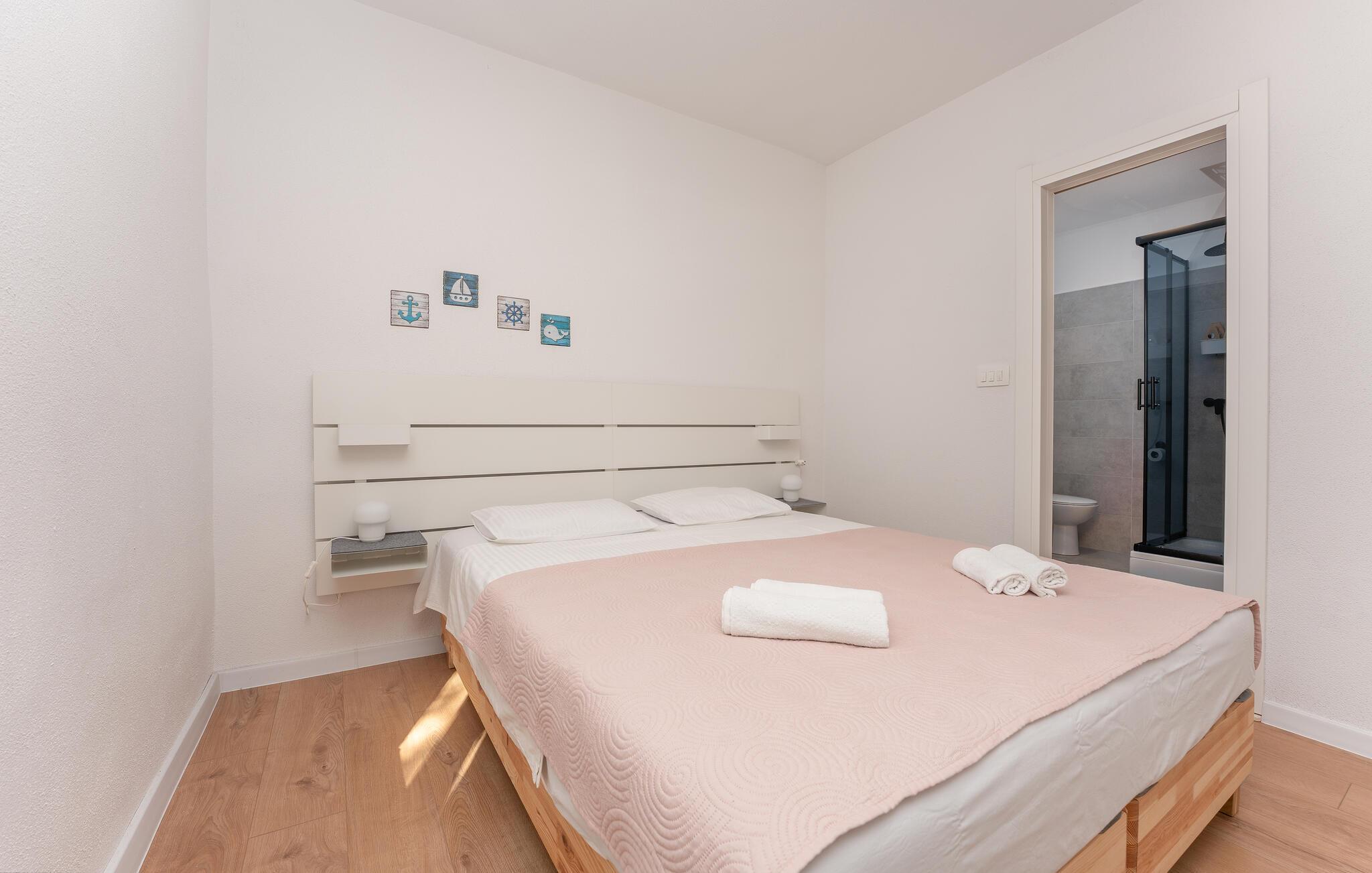 Im Außenbereich erwartet Sie eine großzügige Terrasse mit bequemen Sitzmöglichkeiten – ideal für gesellige Abende oder ruhige Momente bei einem Glas kroatischen Weins. Genießen Sie den Ausblick auf die Umgebung und die sanfte Brise vom Meer. Nutzen Sie den Gemeinschaftsgrill, um ein köstliches Barbecue unter freiem Himmel zu zaubern.