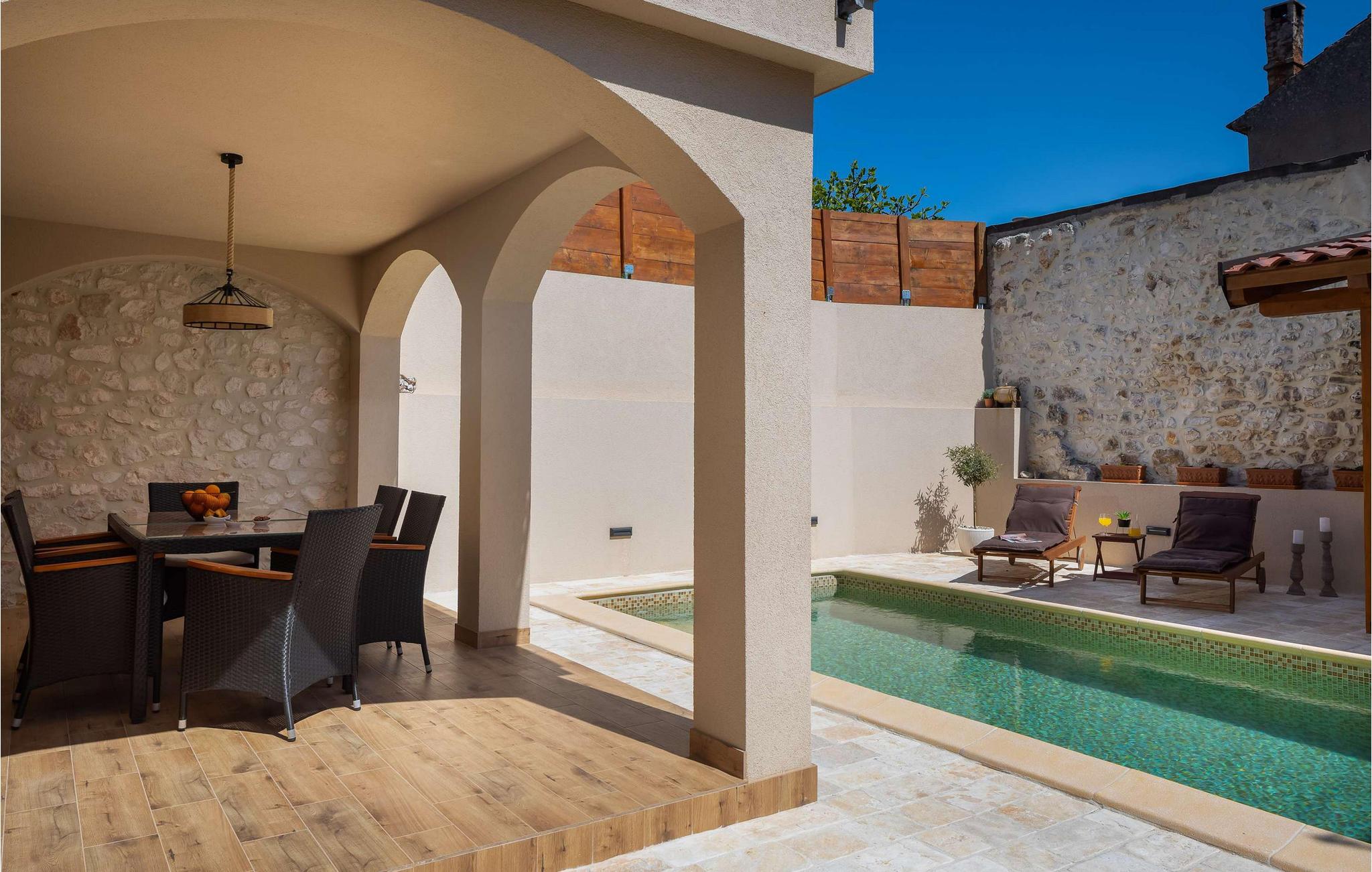 Die wunderschöne Villa Kameni Dvori vereint rustikalen Charme mit modernem Luxus und begrüßt Sie in der malerischen Küstenstadt Sveti Filip i Jakov, unweit des Stadtzentrums von Zadar. Zaubern Sie kulinarische Highlights in der offenen Küche, genießen Sie harmonische Mahlzeiten im behaglichen Wohnbereich und vergnügen Sie sich an der PlayStation oder plaudern Sie im gemütlichen Wohnzimmer über vergangene Zeiten.