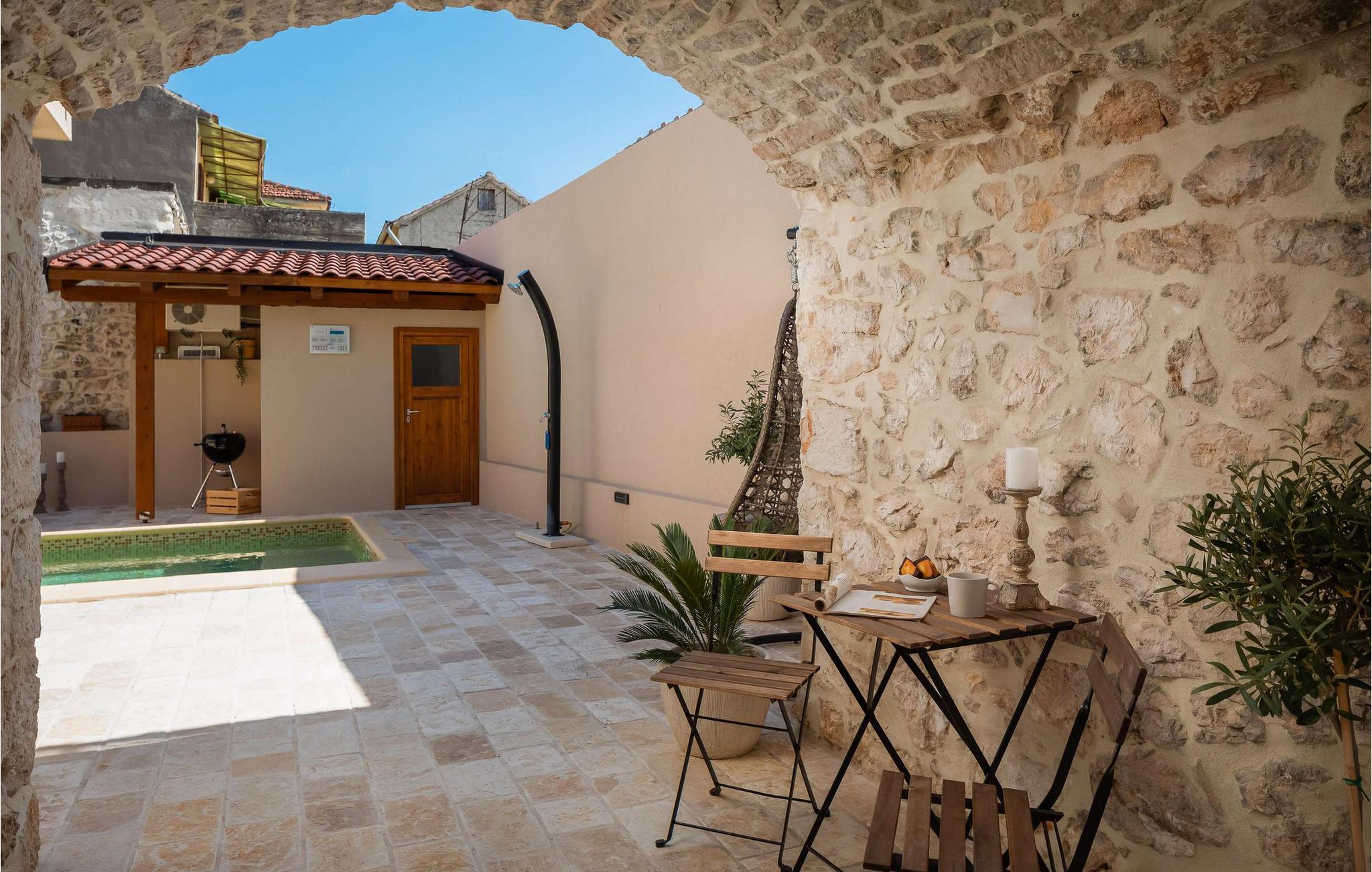 Der großzügige Balkon lädt mit überdachten Liegestühlen und bequemen Outdoor-Möbeln zum Entspannen ein – ideal für ein Glas Wein bei Sonnenuntergang. Im Innenhof der Villa befindet sich ein wunderschöner Pool, an dem Sie Ihre Privatsphäre genießen und auf den komfortablen Sonnenliegen die Seele baumeln lassen können. Nutzen Sie den Grill für stimmungsvolle Mahlzeiten auf der einladenden Terrasse und genießen Sie laue Sommerabende in vertrauter Runde.