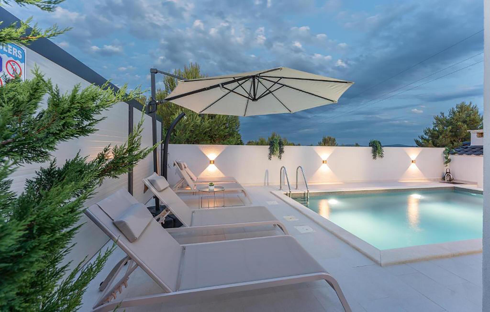 Nutzen Sie den geschützten Hof für entspannte Stunden in absoluter Privatsphäre. Schwimmen Sie draußen im beleuchteten Pool und entspannen Sie auf den eleganten Sonnenliegen oder ziehen Sie sich unter den Sonnenschirm zurück. Verweilen Sie auf der überdachten Terrasse mit bequemen Sitzmöbeln und lassen Sie laue Abende bei stimmungsvoller Beleuchtung ausklingen.
