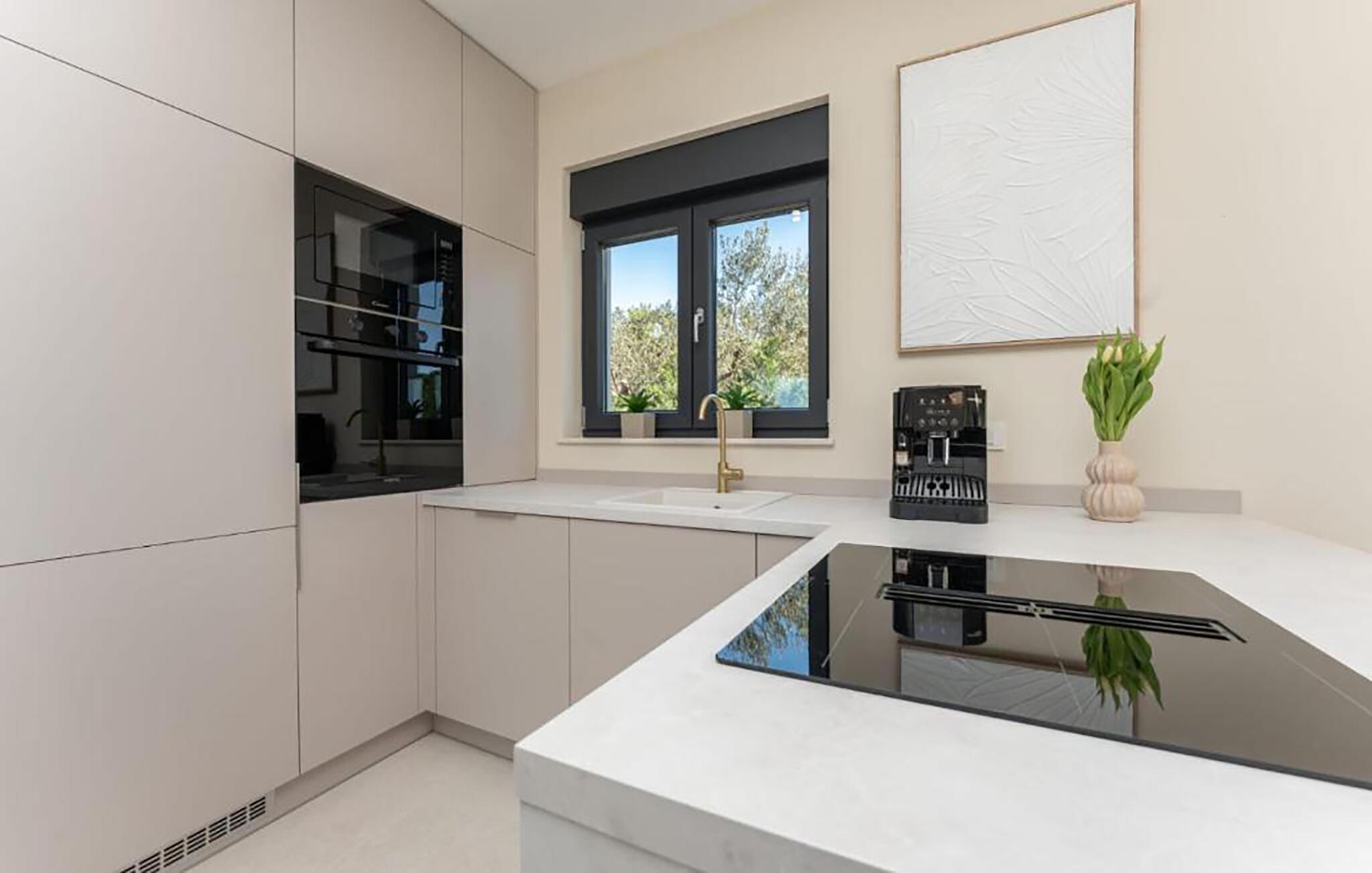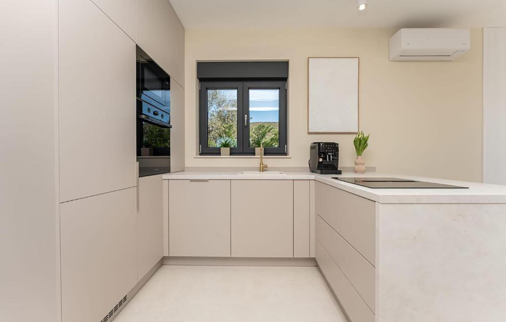 Entspannen Sie im großzügigen Wohnraum mit eleganter Gestaltung, großzügiger Sofalandschaft und großen Fenstern, die den Blick bis zum Meer öffnen. Genießen Sie ruhige Stunden vor der markanten Designwand mit integriertem Fernseher. Nehmen Sie am Esstisch Platz und verbringen Sie gemeinsame Mahlzeiten in harmonischer Atmosphäre. Nutzen Sie die offen gestaltete Küche mit Kochinsel und hochwertigen Geräten für einen genussvollen Start in den Tag und Abende beim gemeinsamen Kochen.