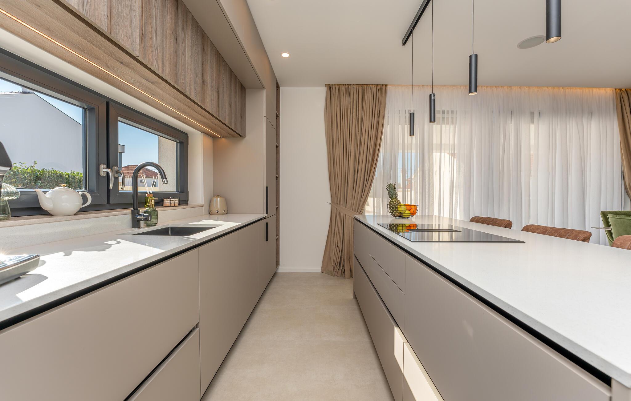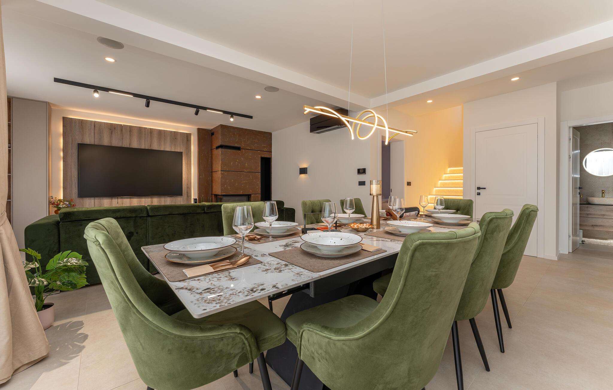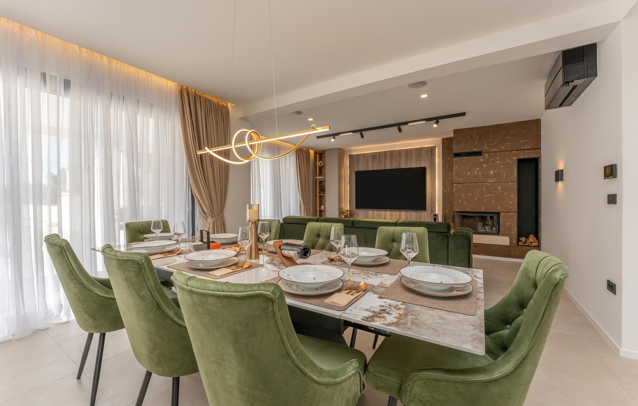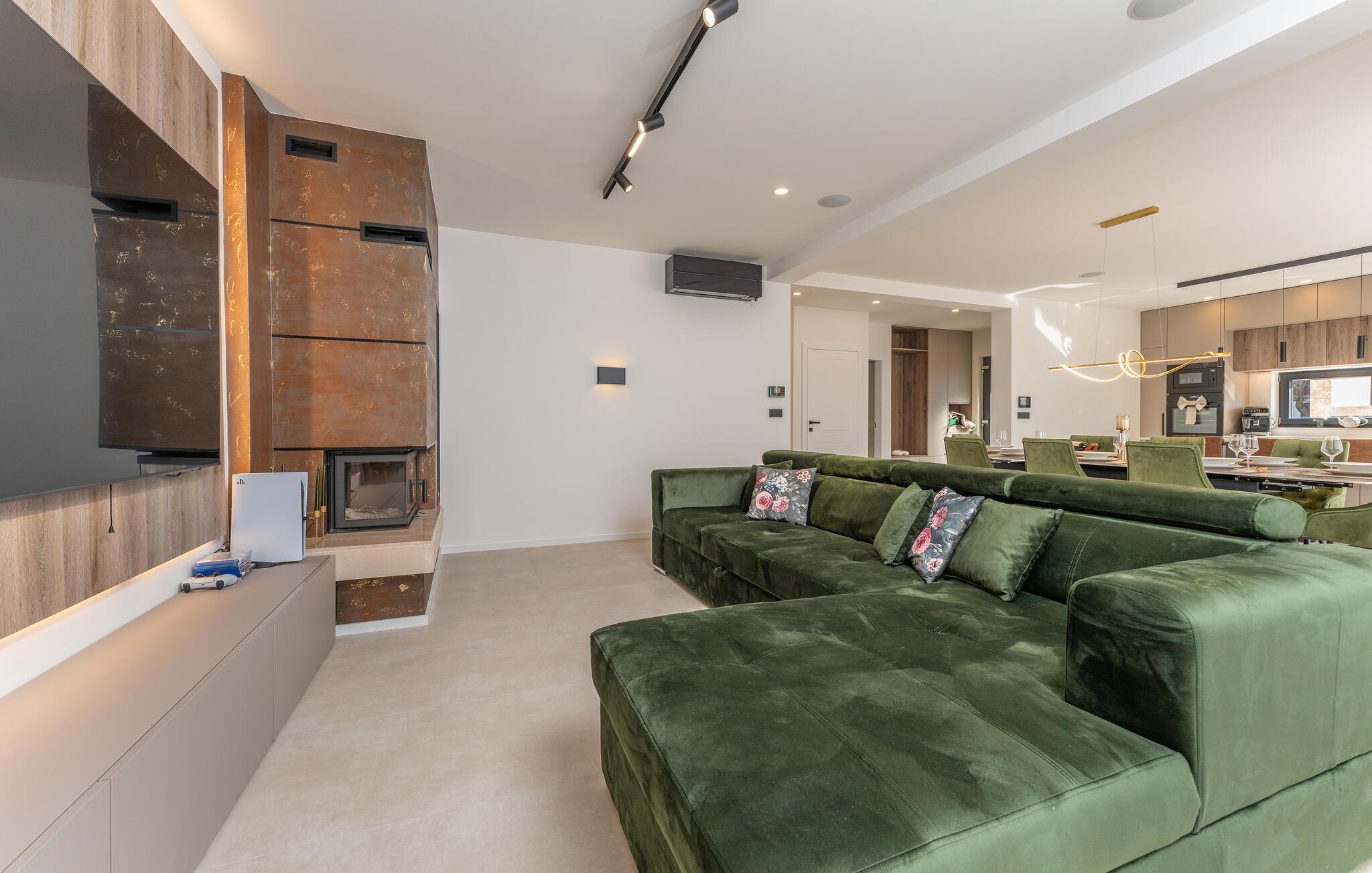 Diese großzügige Villa verwöhnt Sie mit einer hochwertigen Ausstattung und einem modernen, behaglichen Interieur. Freuen Sie sich auf gesellige Kochabende in der offenen Küche und zelebrieren Sie Ihre Mahlzeiten am stilvollen Esstisch. Lassen Sie sich auf dem gemütlichen Sofa nieder und streamen Sie eine spannende Serie oder einen guten Film.