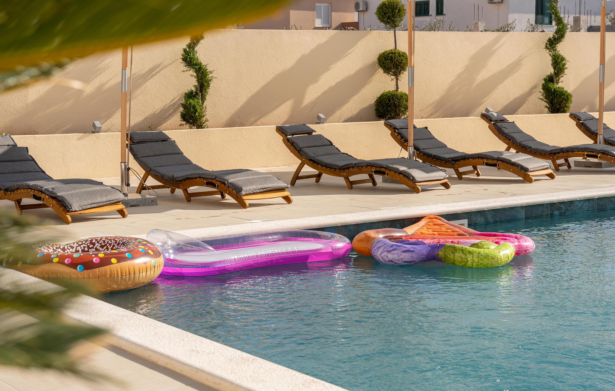 Der elegante Außenbereich begeistert mit einer großen Sonnenterrasse und einem herrlichen Pool. Erfrischen Sie sich hier nach Lust und Laune, lassen Sie auf den bequemen Liegen die Seele baumeln und feiern Sie die lauen Sommernächte bei Wein und leckeren Gerichten vom Grill.