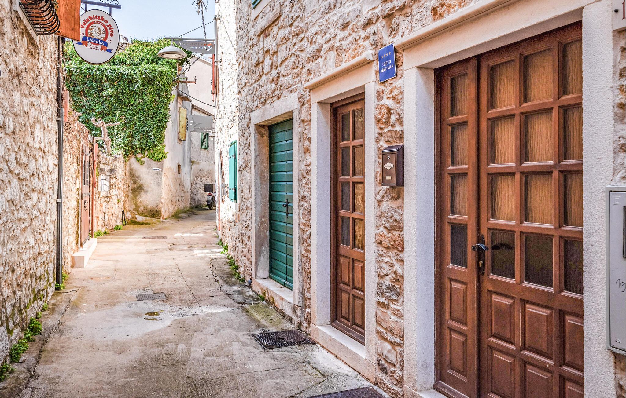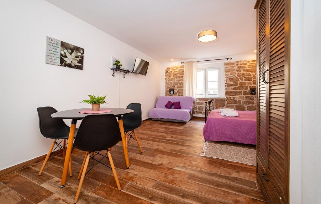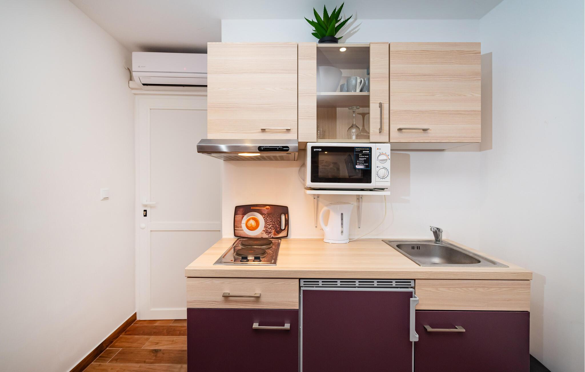 Im Zentrum von Biograd erwartet Sie diese schlichte, aber urgemütliche Ferienwohnung aus Stein. Dank der zentralen Lage der Wohnung, die optimal für einen Urlaub zu zweit eingerichtet ist, können Sie Ihren Urlaubsort sehr gut zu Fuß erkunden. Bereiten Sie morgens in der kompakten Küche Ihr Frühstück und eine Tasse Kaffe zu und nutzen Sie den angrenzenden Essbereich für die Tagesplanung. Auch einen kleinen Snack können Sie hier zu sich nehmen, bevor Sie Ihren Urlaubsort erkunden.