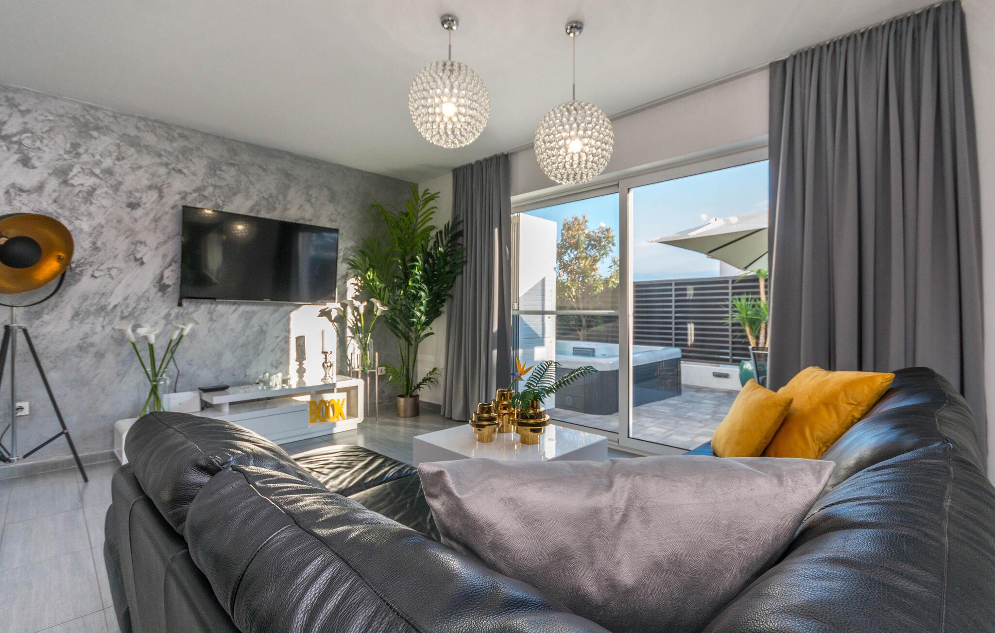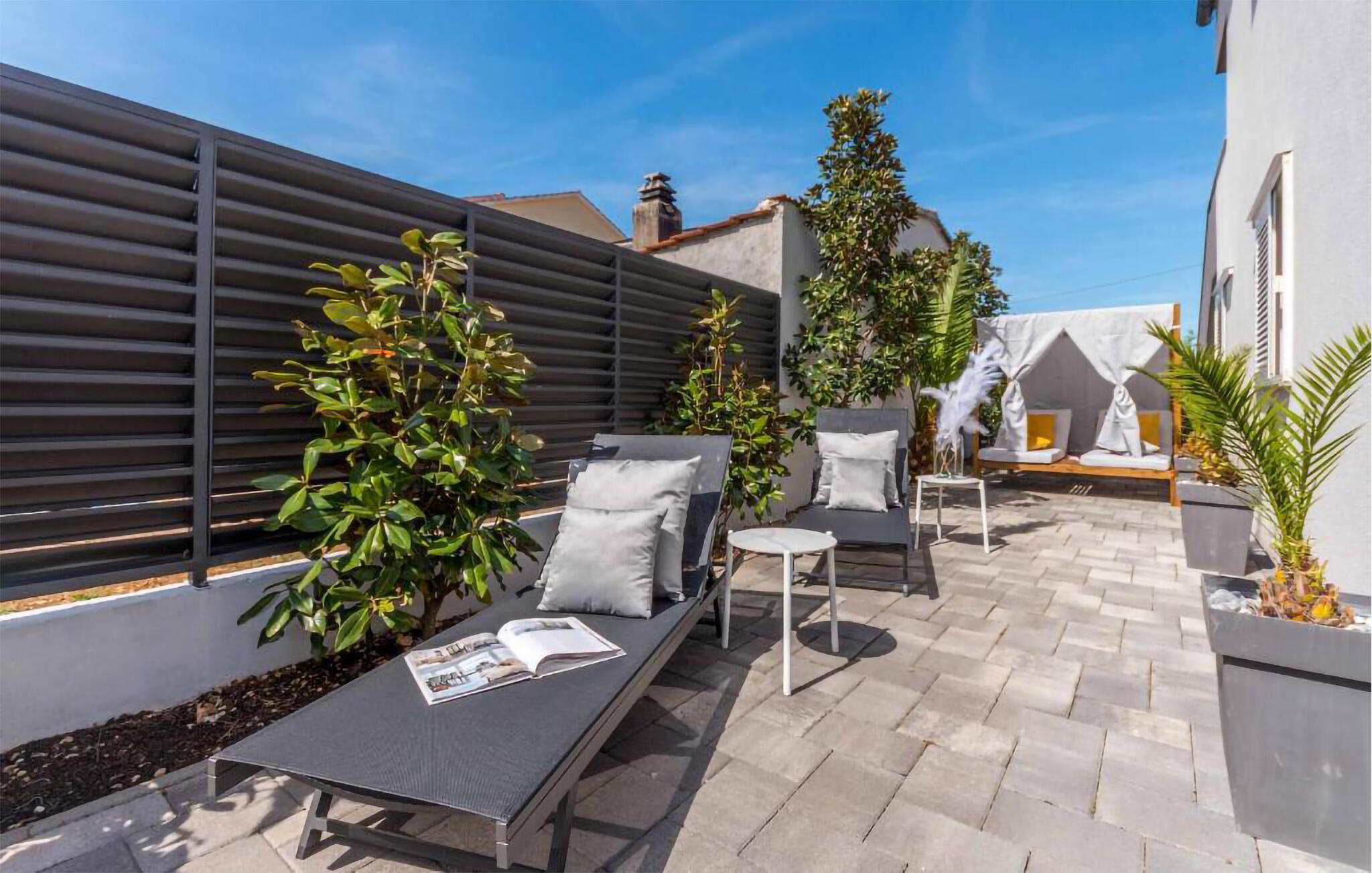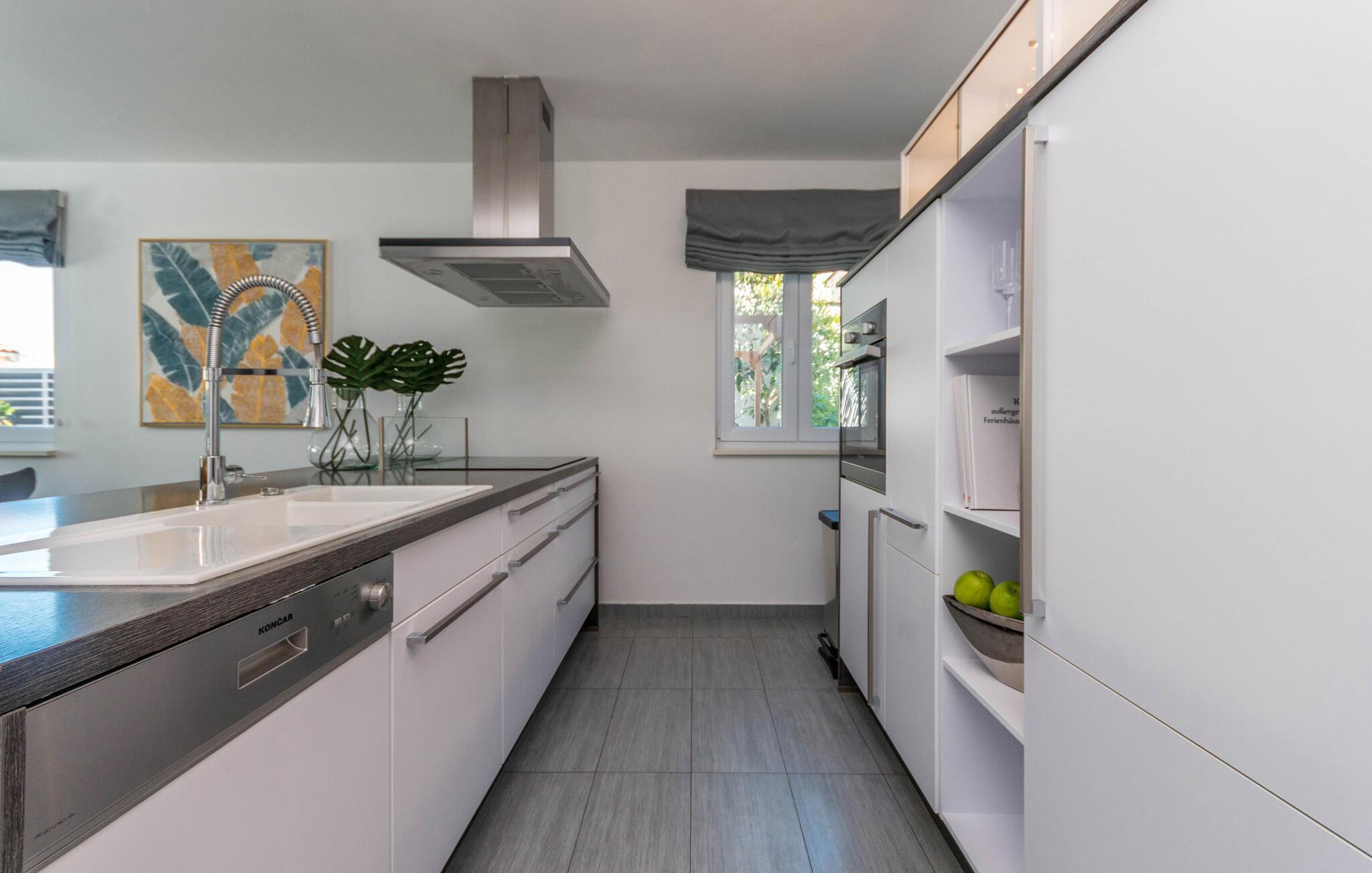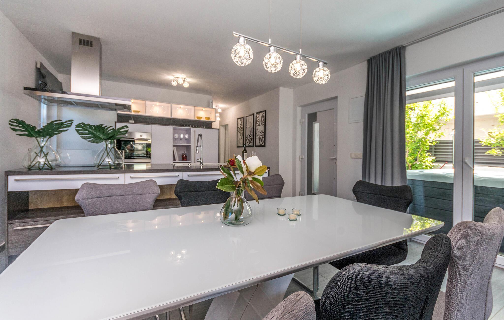 Erleben Sie pure Erholung in diesem komfortablen Ferienhaus in Biograd na Moru. Die Innenräume sind geschmackvoll eingerichtet und bieten höchsten Komfort. Das geräumige Wohnzimmer lädt zum Entspannen ein, die moderne Küche ist perfekt ausgestattet für kulinarische Genüsse und die Schlafzimmer versprechen erholsame Nächte.