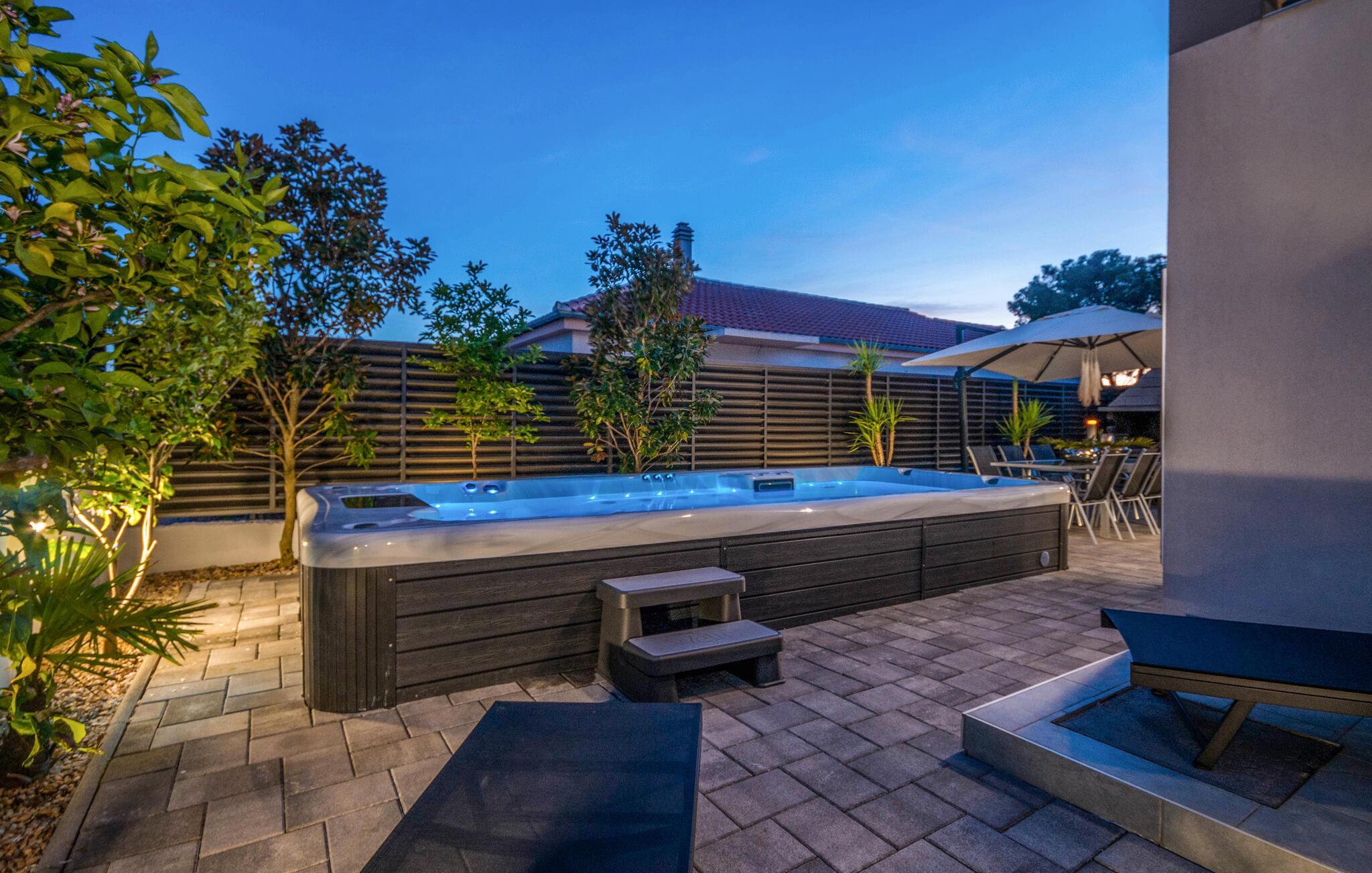 Der Garten ist der ideale Ort, um den Tag zu beginnen oder ausklingen zu lassen. Genießen Sie Ihr Frühstück im Freien oder entspannen Sie sich am Abend bei einem Glas Wein. Der beheizte Außenpool mit Gegenstromschwimmen und der Whirlpool im Freien bieten zusätzliche Entspannungsmöglichkeiten, während Sie die Sonne genießen.