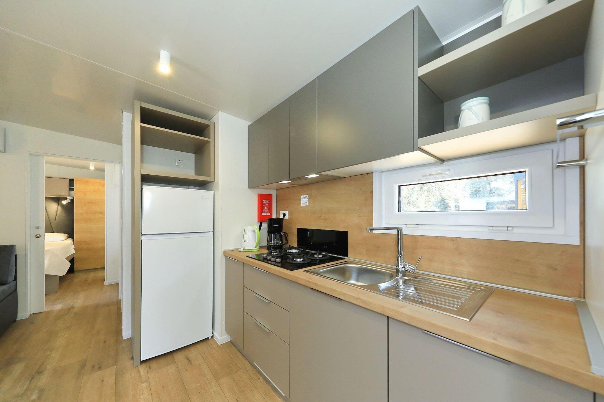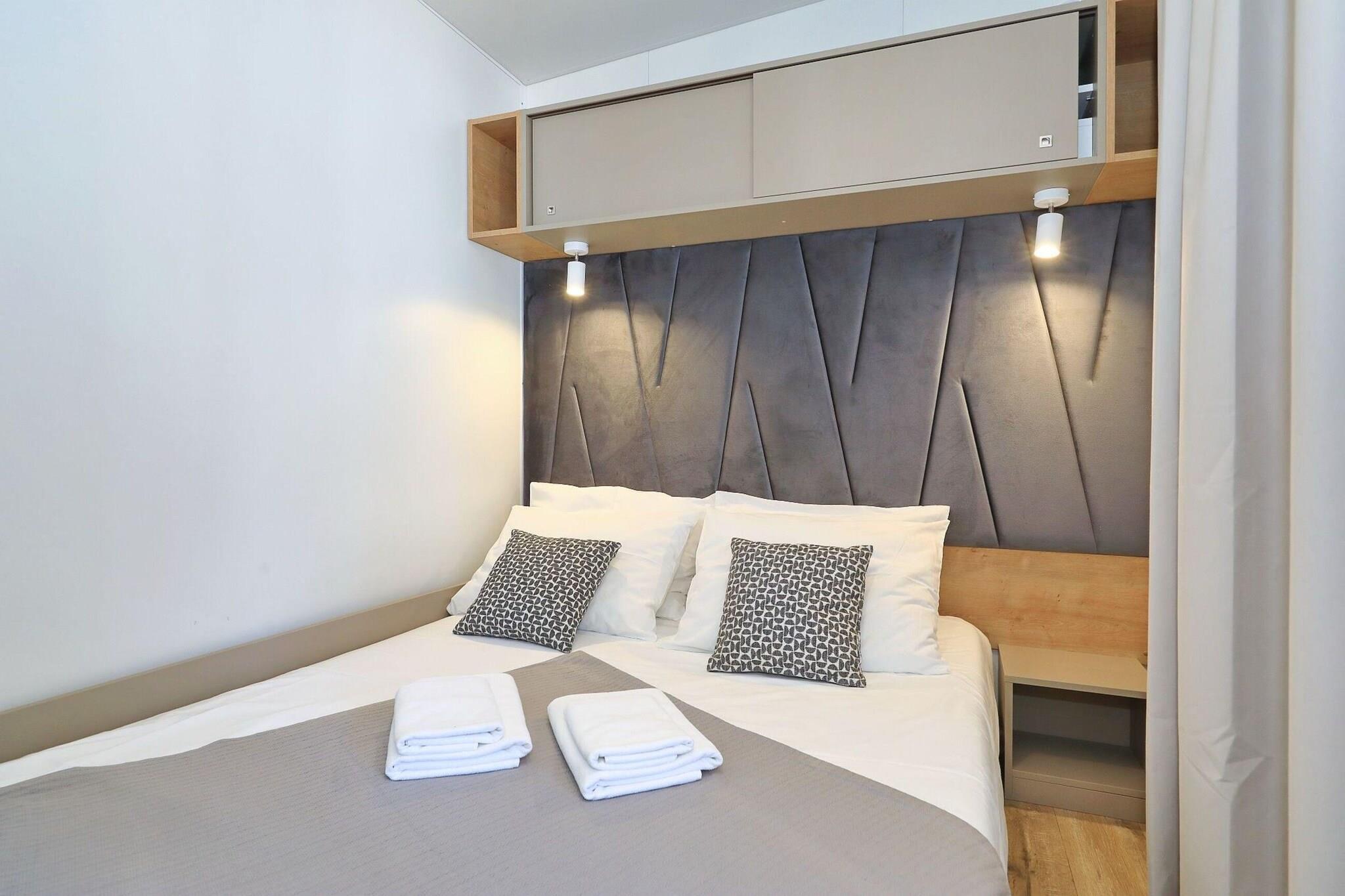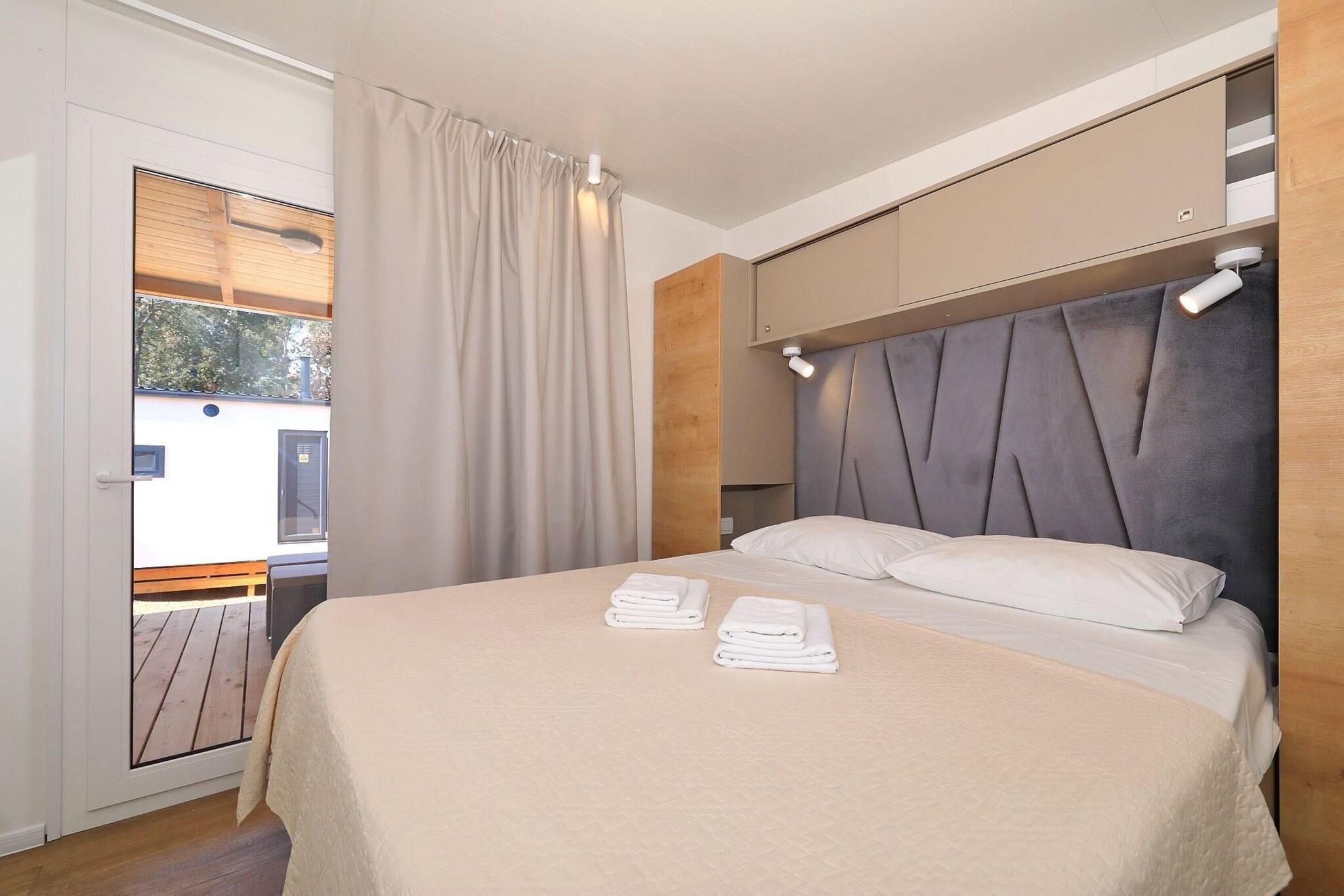 The Soline caravan park with its 250 mobile homes welcomes you right on the gently sloping sand and pebble beach. Depending on the location, these are between 40 m and up to 400 m from the beach and are in the shade of a dense pine forest. You can park your car right next to your mobile home and end the day on the covered terrace. an additional parking place costs EUR 10.00 per day. Biograd na Moru, the white town by the sea, is located between Zadar and Vodice on the Dalmatian coast. The two large marinas are popular with many boat and yacht owners who start their trips to the Kornati island labyrinth from here. Fantastic beaches and bays await bathers. Especially the gently sloping pebble beach Drazice and the sandy beach Soline right next to it are very popular with families with children. Services included: consumption based energy costs, bedlinen, towels, wifi. Activities nearby: The "Park Soline" restaurant is located within the campsite. In the shade of the pine forest you can choose from various Mediterranean specialties on the spacious terrace with a view of the sea. For the entertainment of adults and children, fun and sporting activities are organized every day by the professional animators. They will also be happy to help you plan hikes or excursions to attractive national parks such as Krka, Kornati or Paklenica, or to the historic cities of Zadar and Sibenik. You can reach the town center of Biograd with a relaxed walk along the beach via the newly developed footpath along the beach. Mobility: Not suitable for people with restricted mobility.