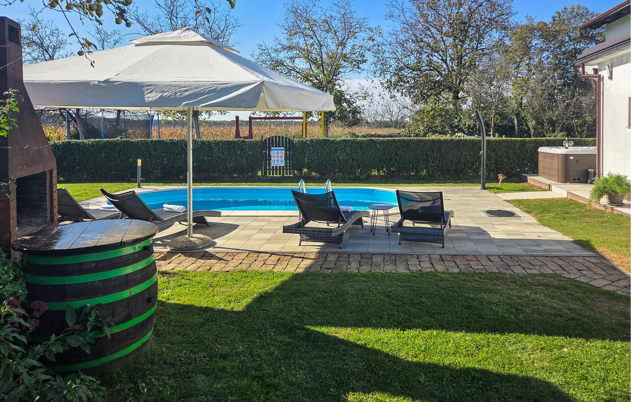 Dieses Steinhaus bietet Ihnen ebenso eine mehrere offene Terrasse sowie einen privaten Pool, in dem Sie sich jederzeit abkühlen können, sollte es mal zu heiß werden. Des weiteren stehen Ihnen auch Sonnenliegen zur Verfügung auf welchen Sie sich in der Sonne baden und vollkommen entspannen können. An lauen Sommerabenden können Sie auch den gemauerten Grill für entspannte Stunden nutzen. In diesem harmonischen Haus finden Sie alles was Ihren Besuch von Kroatien zu einem entspannten Urlaub machen wird. Ihre Kinder werden die große Wiese zu schätzen wissen, wo sie unter anderem Fußball oder Badminton spielen und sich auf der Rutsche und Schaukel vergnügen können.