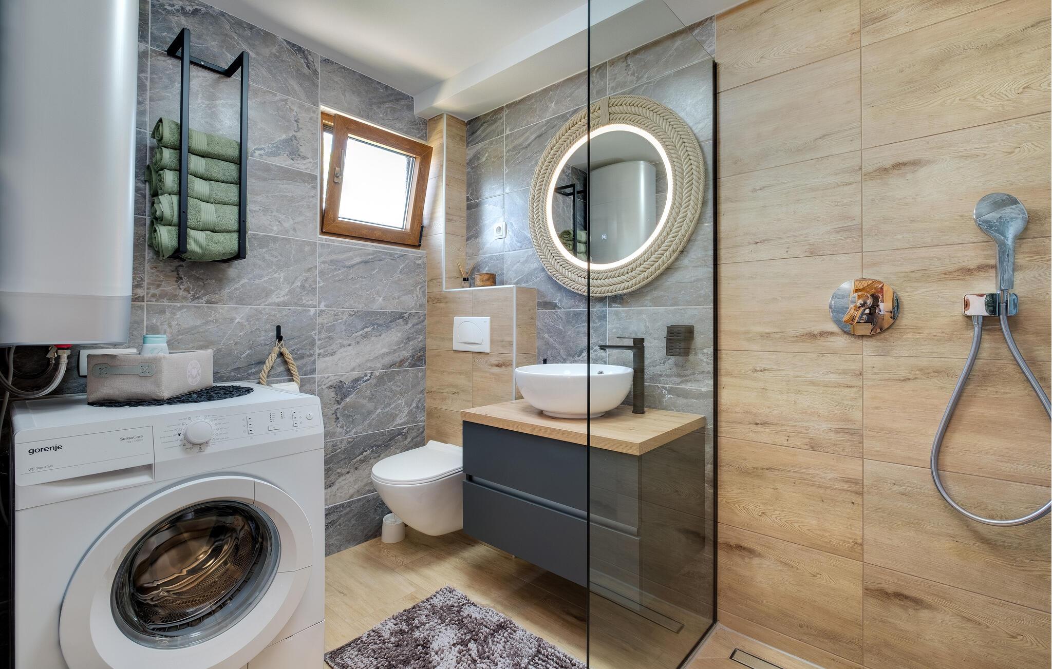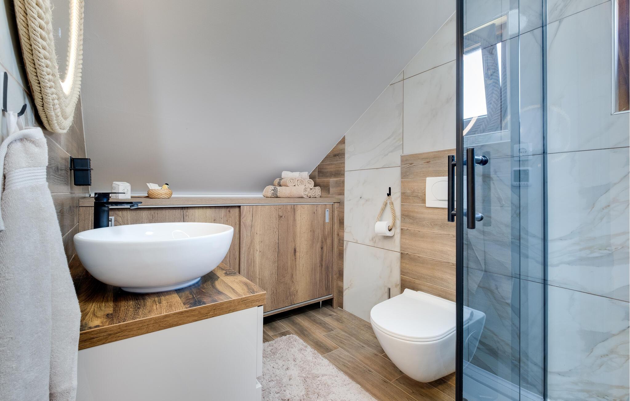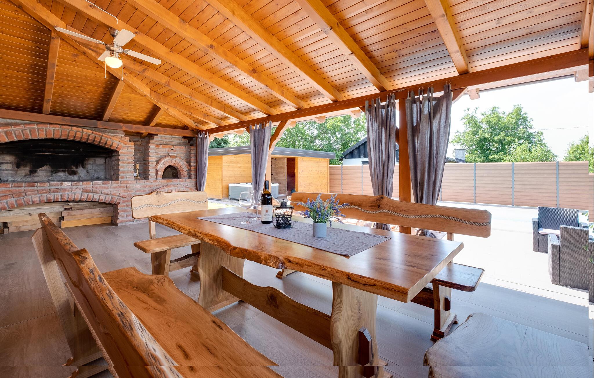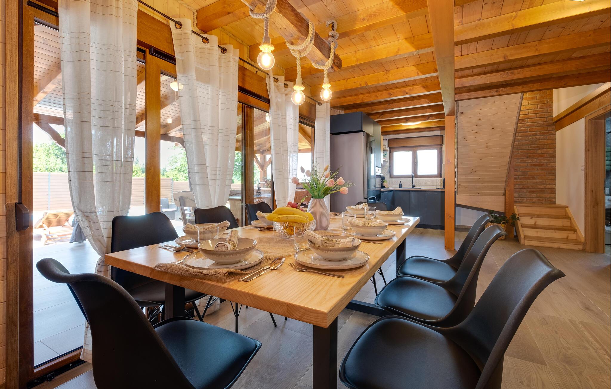 In ländlicher Idylle gelegen, ist das Haus von viel Grün und unberührter Natur umgeben, was Ihnen Ruhe und Entspannung bietet. Die Innenräume dieses Ferienhauses sind eine harmonische Kombination aus Komfort und stilvoller Einrichtung. Die Wände aus Holz schaffen eine gemütliche und rustikale Atmosphäre, die durch moderne Möbel und geschmackvolle Dekorationen ergänzt wird. Das Wohnzimmer ist mit einem Sofa ausgestattet, das Sie zum Entspannen einlädt. Der Kamin sorgt an kühleren Abenden für wohlige Wärme und ein angenehmes Ambiente, das Sie beim Filmschauen oder Spielen auskosten können. Die offene Küche ist sehr gut ausgestattet und ermöglicht es Ihnen, Ihre Mahlzeiten in einer angenehmen Umgebung zuzubereiten.
