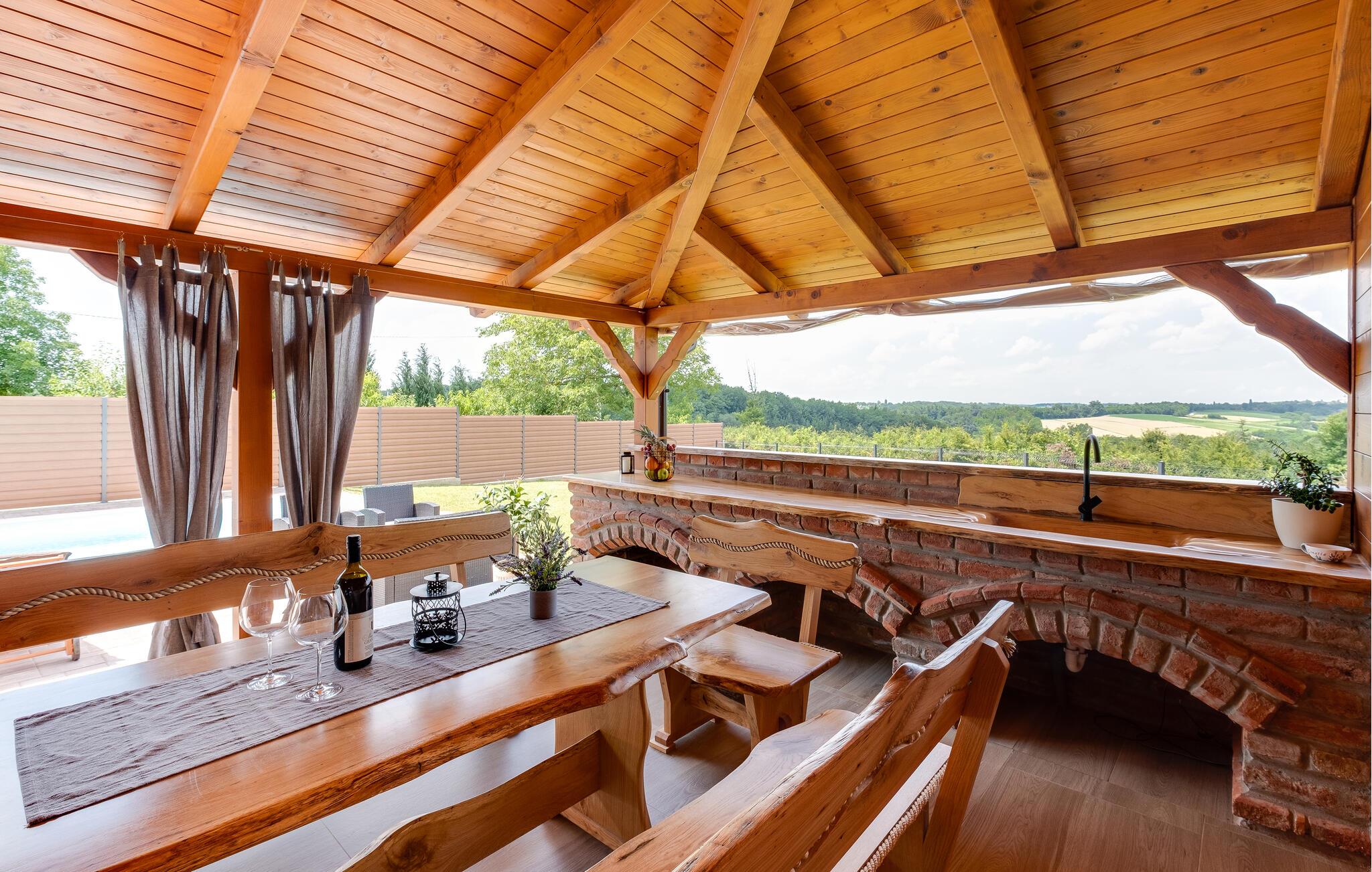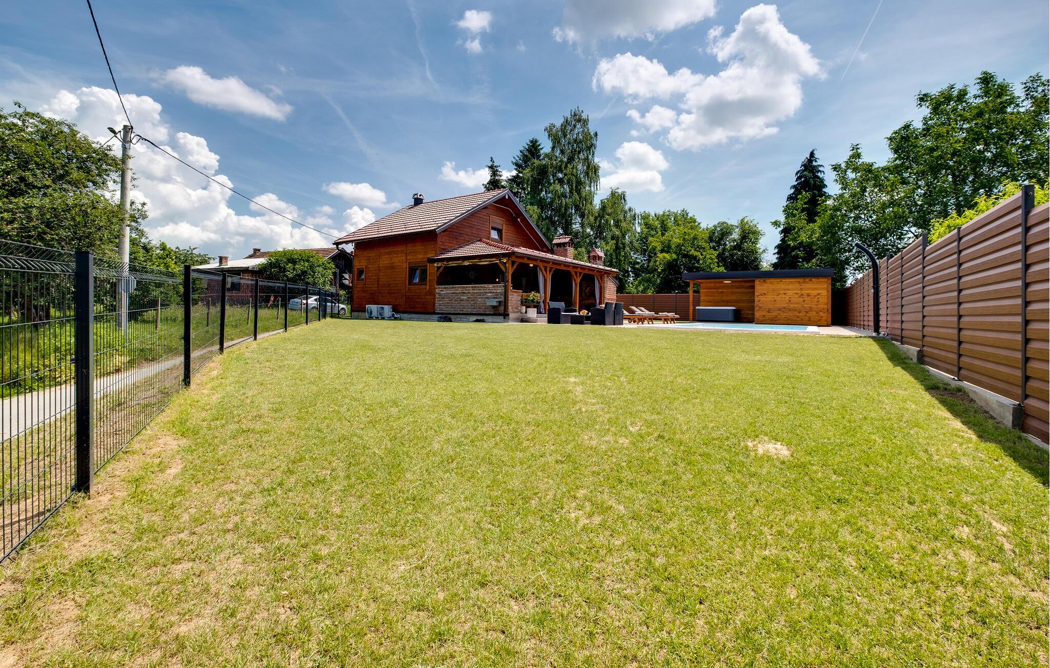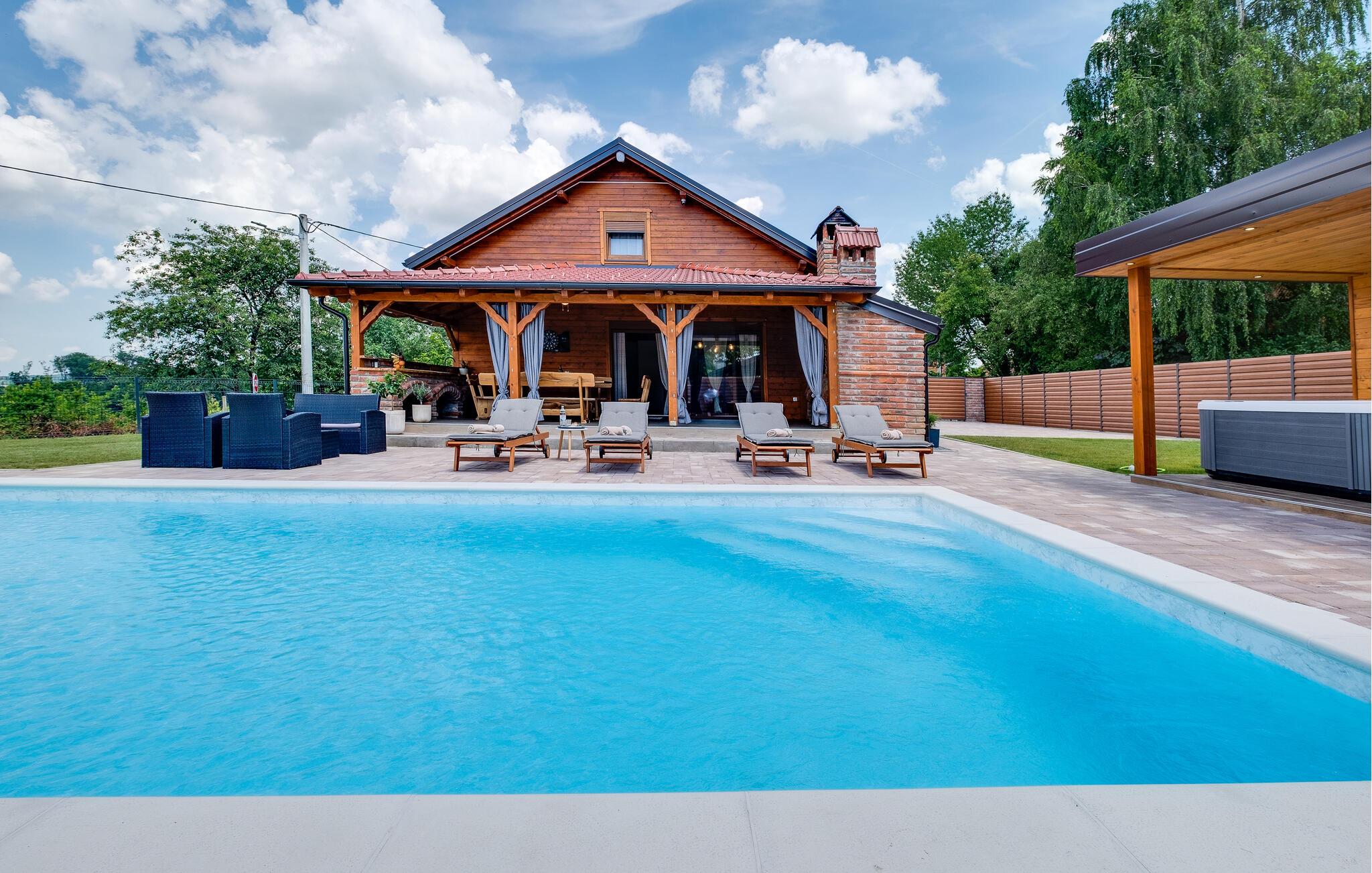 Genießen Sie Ihren Urlaub in diesem traumhaften Holzhaus mit Swimmingpool.
