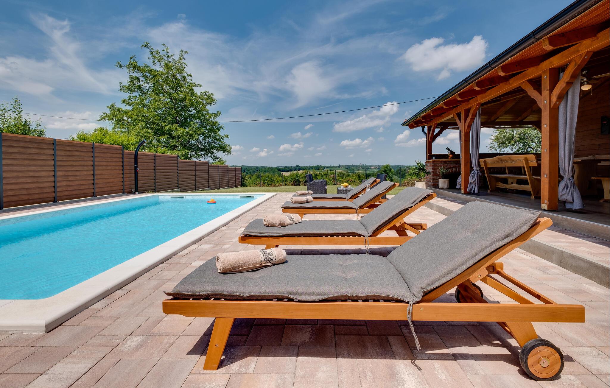 Treten Sie hinaus in den großzügigen Garten mit Pool, der Sie zum Verweilen und Entspannen einlädt. Freuen Sie sich auf Sonnenbäder, gemeinsames Kochen in der Sommerküche oder Entspannung im Whirlpool.