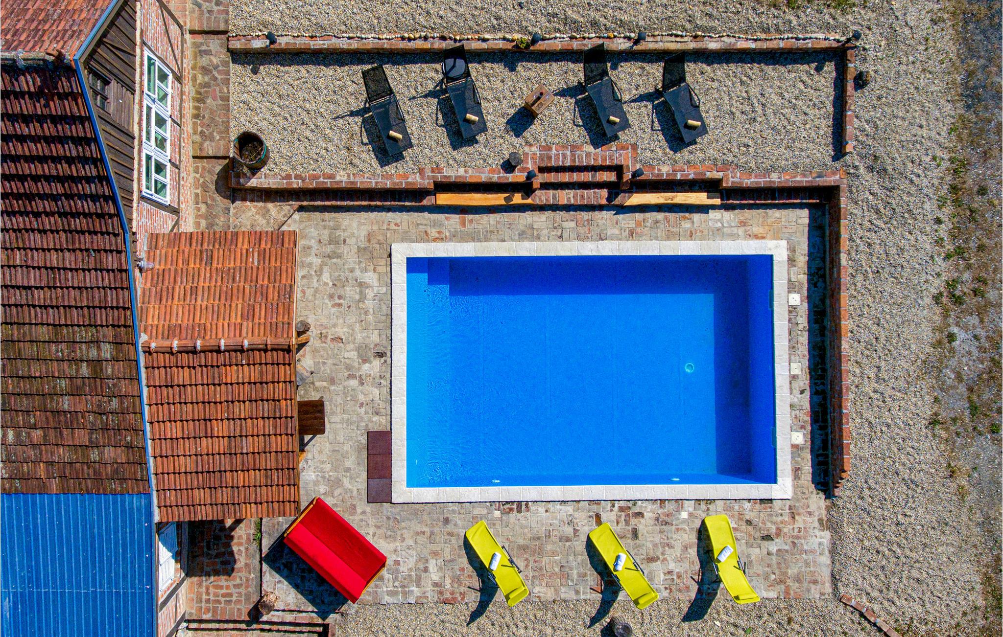 Der Innenraum setzt sich wie folgt zusammen: Im Erdgeschoss befinden sich die Küche mit Wohnzimmer, das Badezimmer, Schlafzimmer und ein Abstellraum. Zum Dachgeschoss mit der minimalen Deckenhöhe von ca. 60 cm führt eine steile Holztreppe. Das Dachgeschoss ist ein offener Raum mit einem Doppelbett und zwei Einzelbetten und zugleich ist es ein Durchgangszimmer zum Schlafzimmer Nr. 2, in dem zwei Einzelbetten stehen. An der Rückseite des Hauses können Sie an heißen Sommertagen die Erfrischung im Pool genießen und auf der Sonnenterrasse entspannen.