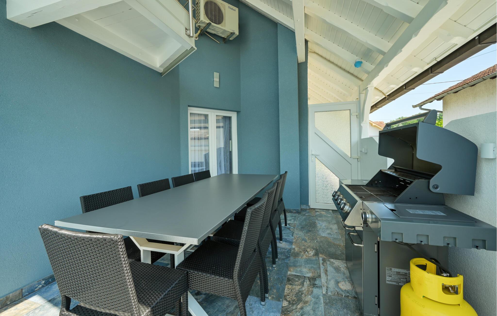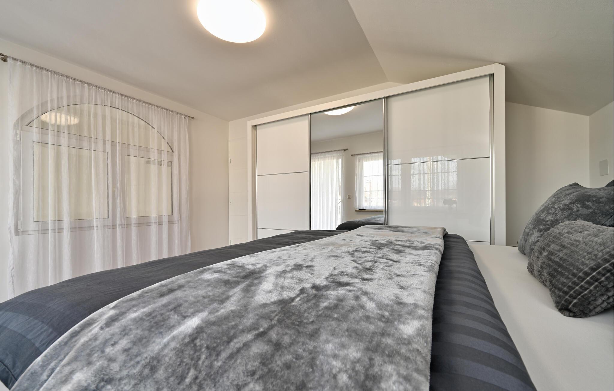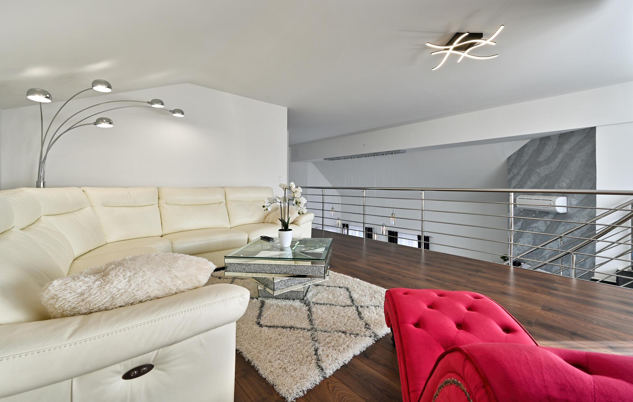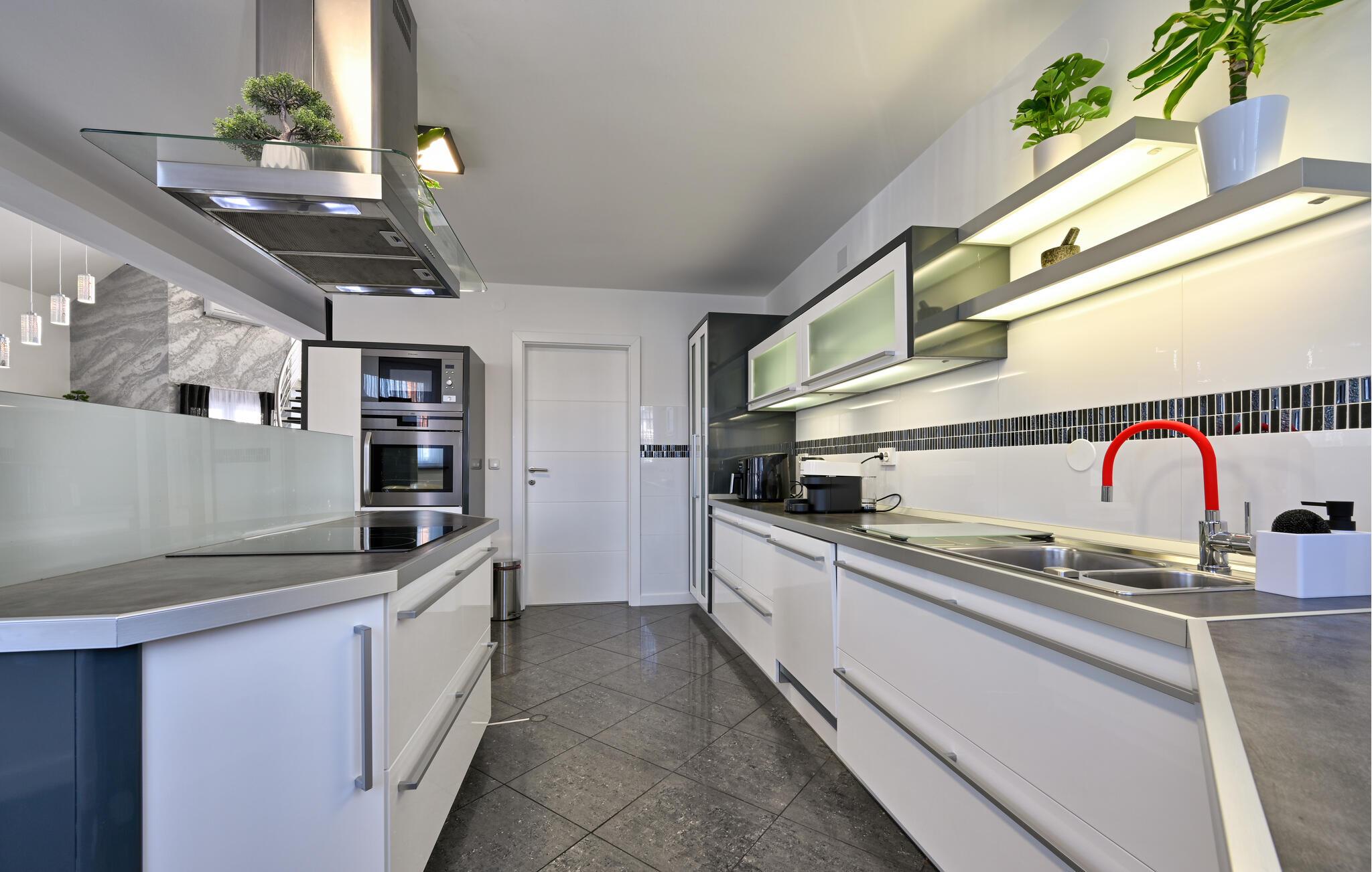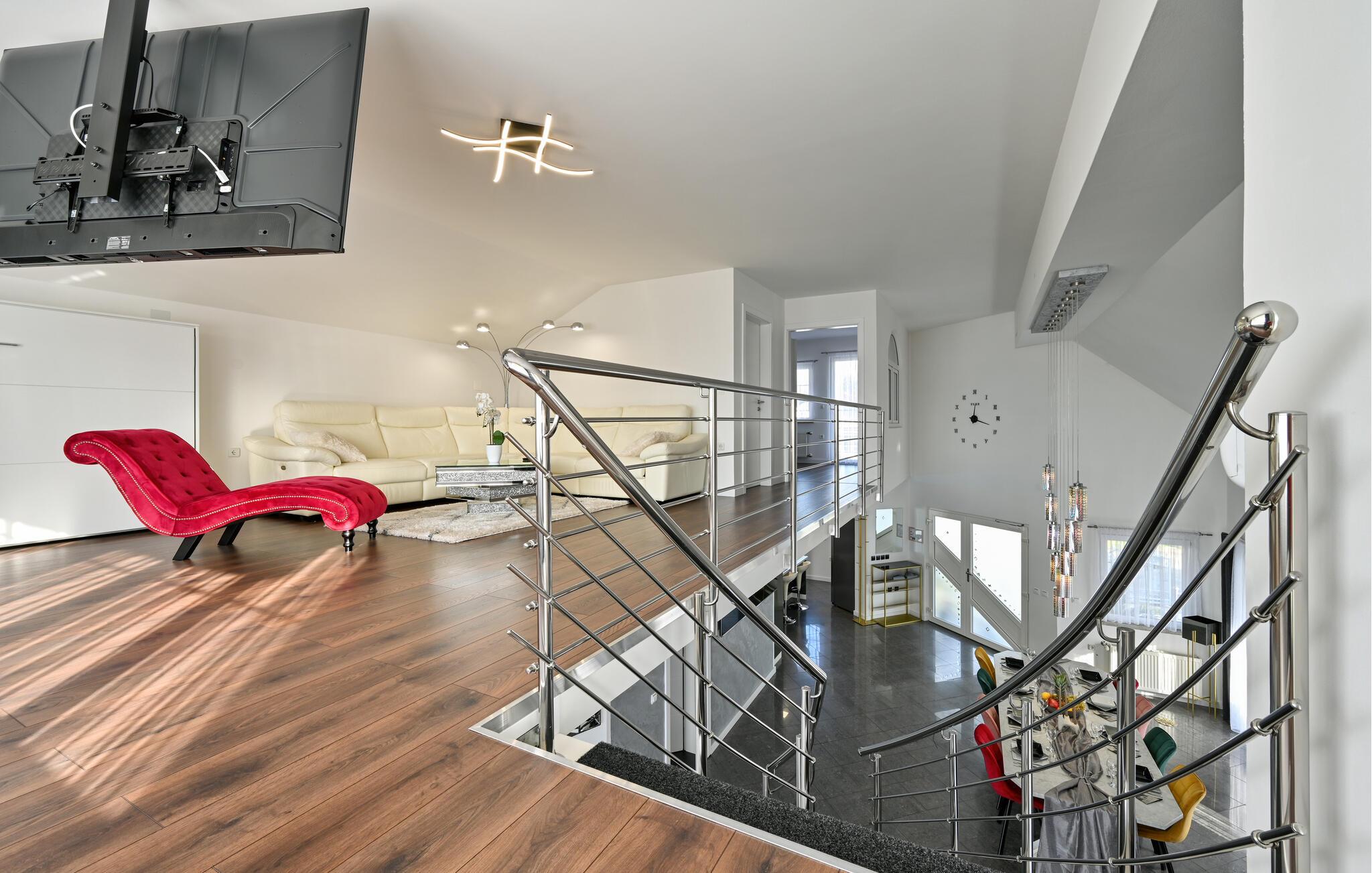 Treten Sie ein und lassen Sie sich vom eleganten Ambiente dieses komfortablen Feriendomizils verzaubern, in dem Sie mit Freunden oder der Familie unvergessliche Urlaubserinnerungen sammeln. Freuen Sie sich auf gesellige Kochabende in der geräumigen, top ausgestatteten Küche und zelebrieren Sie Ihre Mahlzeiten im stilvollen Essbereich. Entspannen Sie danach im gemütlichen Wohnzimmer auf der luxuriösen Eckcouch, während Sie Ihre Lieblingsfilme auf dem großen TV streamen, oder verbringen Sie gemeinsame Zeit am Kickertisch oder mit der Playstation 5.