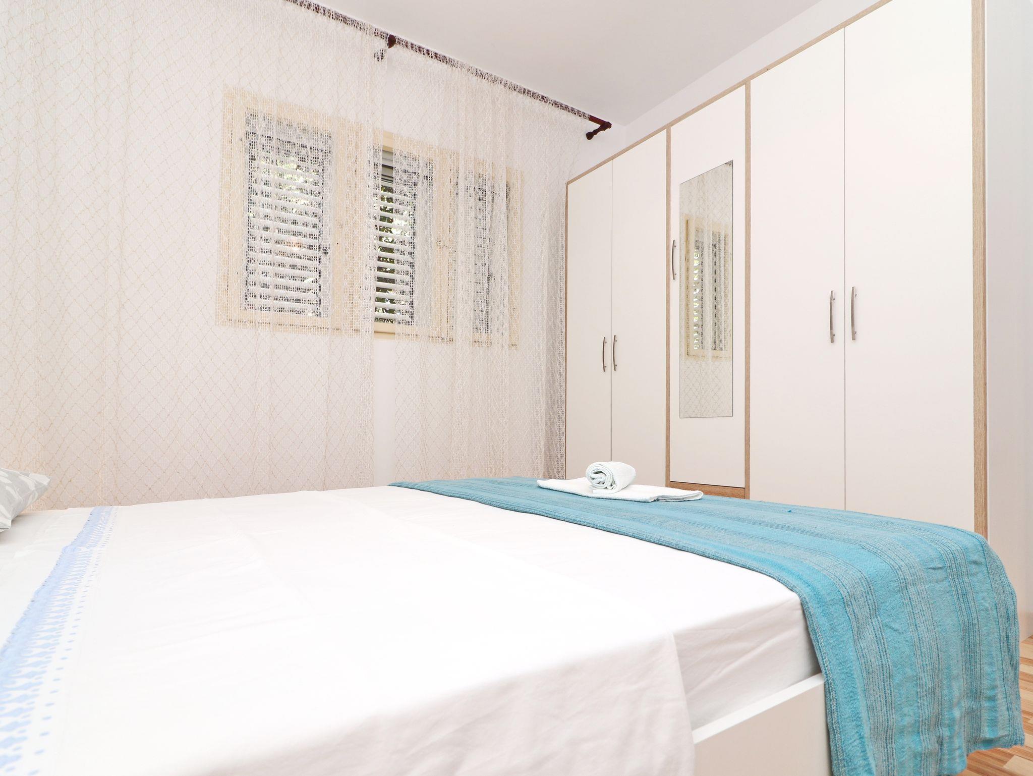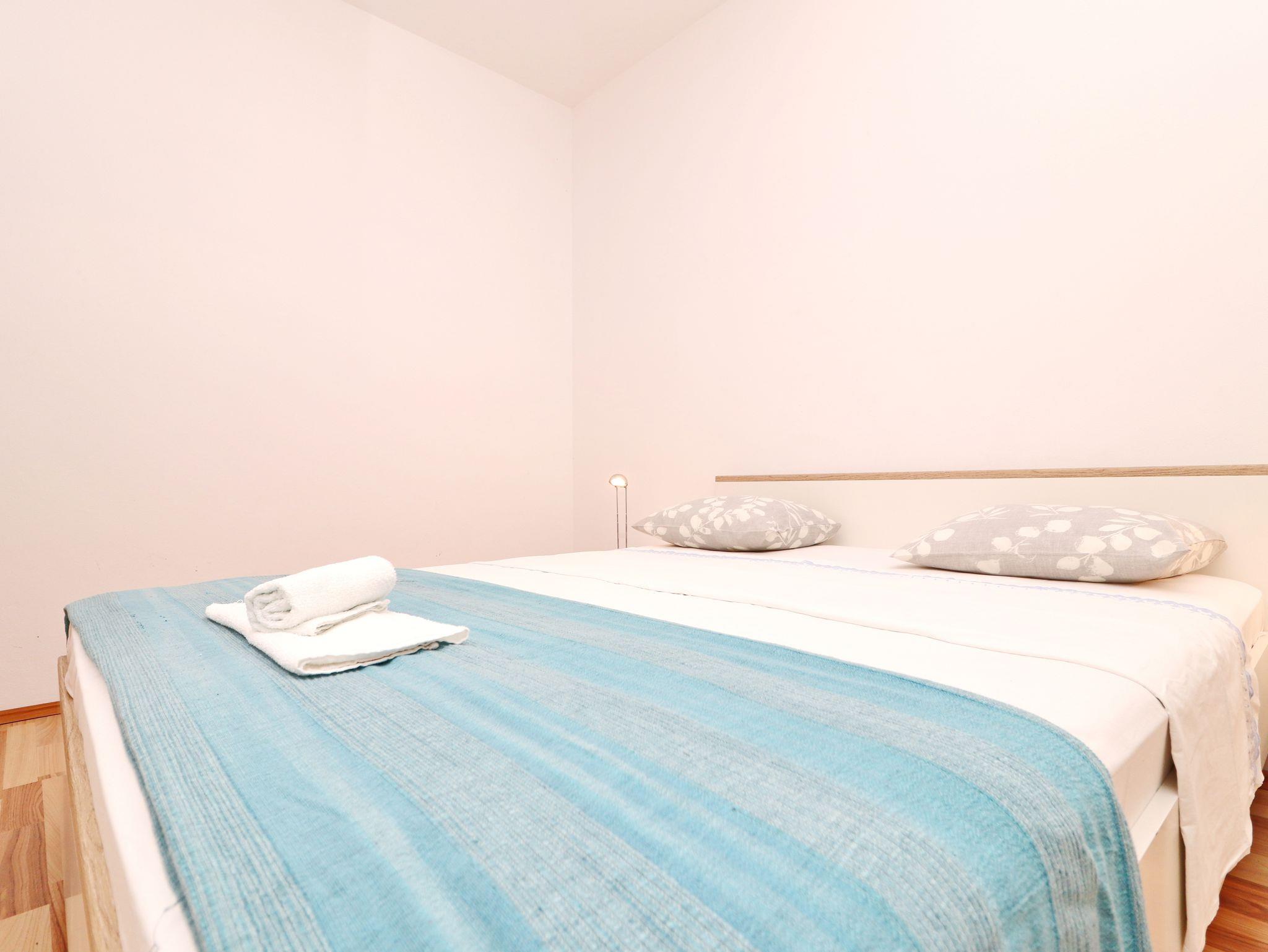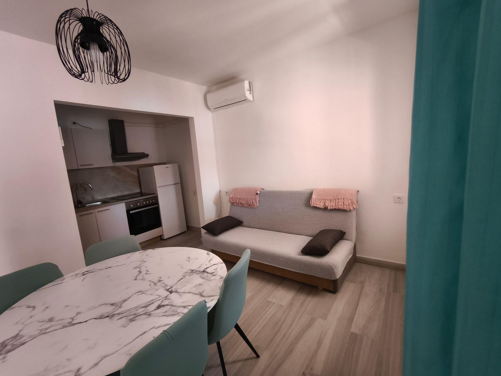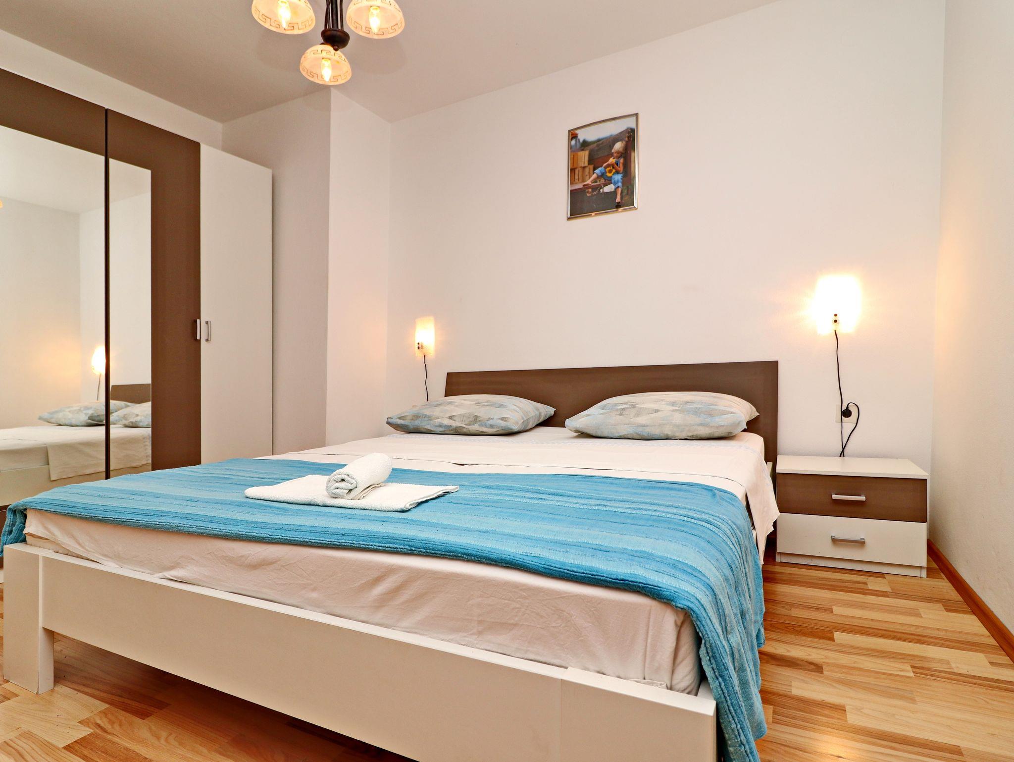 Ferienwohnung bietet Platz für 4 Gäste. Die Betten sind in Schlafzimmern, die es 2 gibt, innerhalb einer Gesamtfläche von 44m2, angeordnet. Die Gäste haben eine eigene Terrasse zur Verfügung, auf der sie in warmen Sommernächten genießen können. Das Apartment bietet Meerblick. Es ist erlaubt, Speisen auf dem Gemeinschafts-Grill vorzubereiten. IM PREIS INBEGRIFFEN: Kurtaxe, Endreinigung, Klimatisierung, Parkplatz, Internet, Kinderbett, Bügeleisen, Bügelbrett, Föhn, Sonnenschirm. VERBINDLICHE ZUSÄTZLICHE KOSTEN: Aufzahlung für Kurzaufenthalte (prozentualer Zuschlag pro Nächtigungsanzahl: 30% - 1, 20% - 2, 10% - 3). Die Verfügbarkeit zusätzlicher Dienstleistungen in Ihrem reservierten Termin und die Preise derselben (falls nicht aufgeführt) müssen im Voraus überprüft werden. Zusätzliche Dienstleistungen die in der Zahlungsaufforderung nicht aufgeführt sind werden direkt beim Vermieter bezahlt, angenommen der Gast nutzt auch diese. Ermäßigung auf den Grundpreis: Gratistag 21=19 (bei einem Aufenthalt von 21 Tagen oder mehr erhalten Sie 2 Gratistage für den Aufenthalt bis 31.12.26).