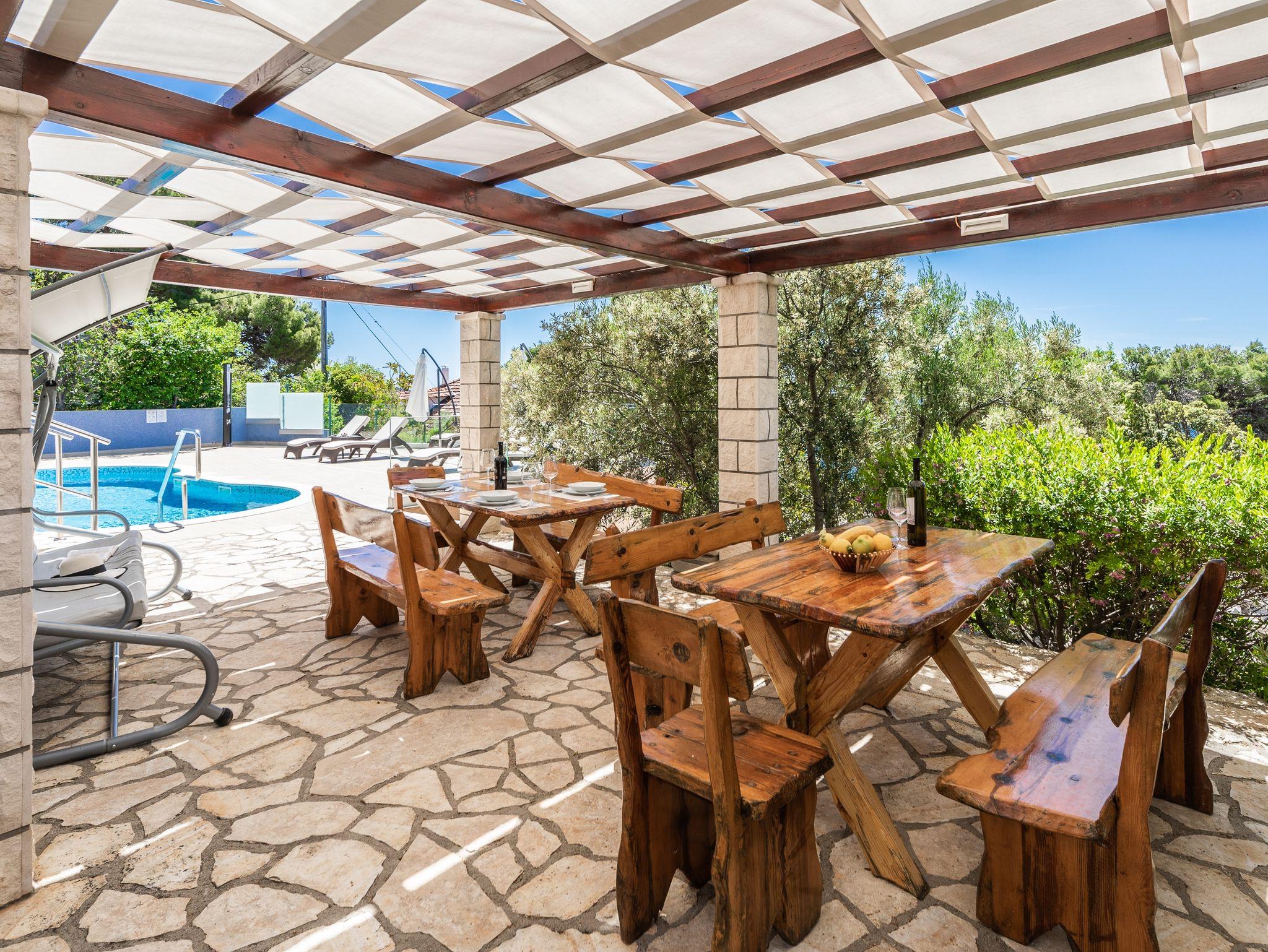 Umgebung des Objekts (Ordentlich), Hof (500m2, Kinderbereich, Sitzbereich), Parkplatz (Anzahl der Parkplätze: 6, Entfernung vom Objekt: im Hof), Pool: gemeinsam, Dimensionen: 9m x 3.95m x 1.6m, Wassertyp: Süßwasser, Grill: gemeinsam, WiFi Internet, Föhn, Bügeleisen, Bügelbrett, Kinderbett