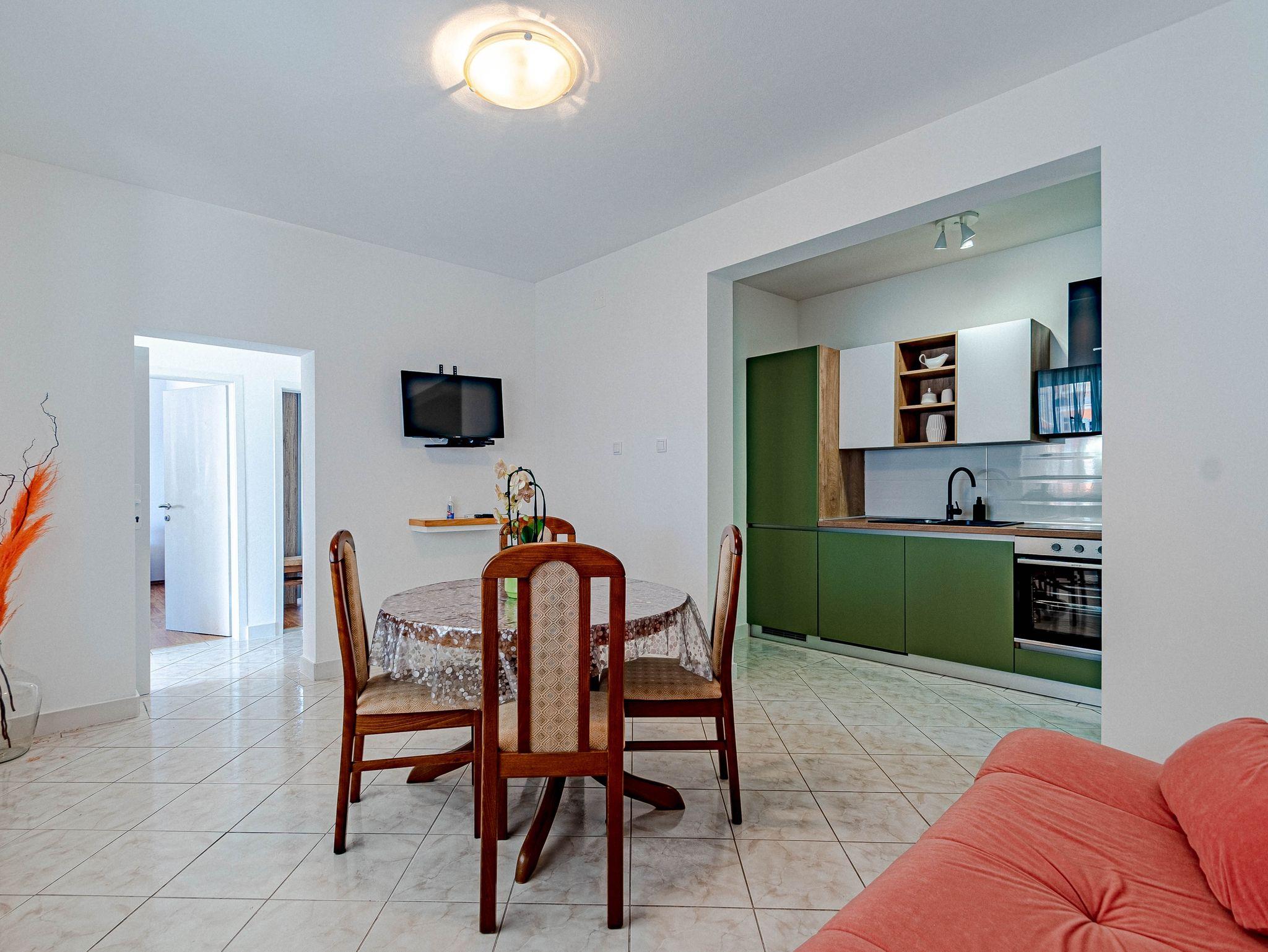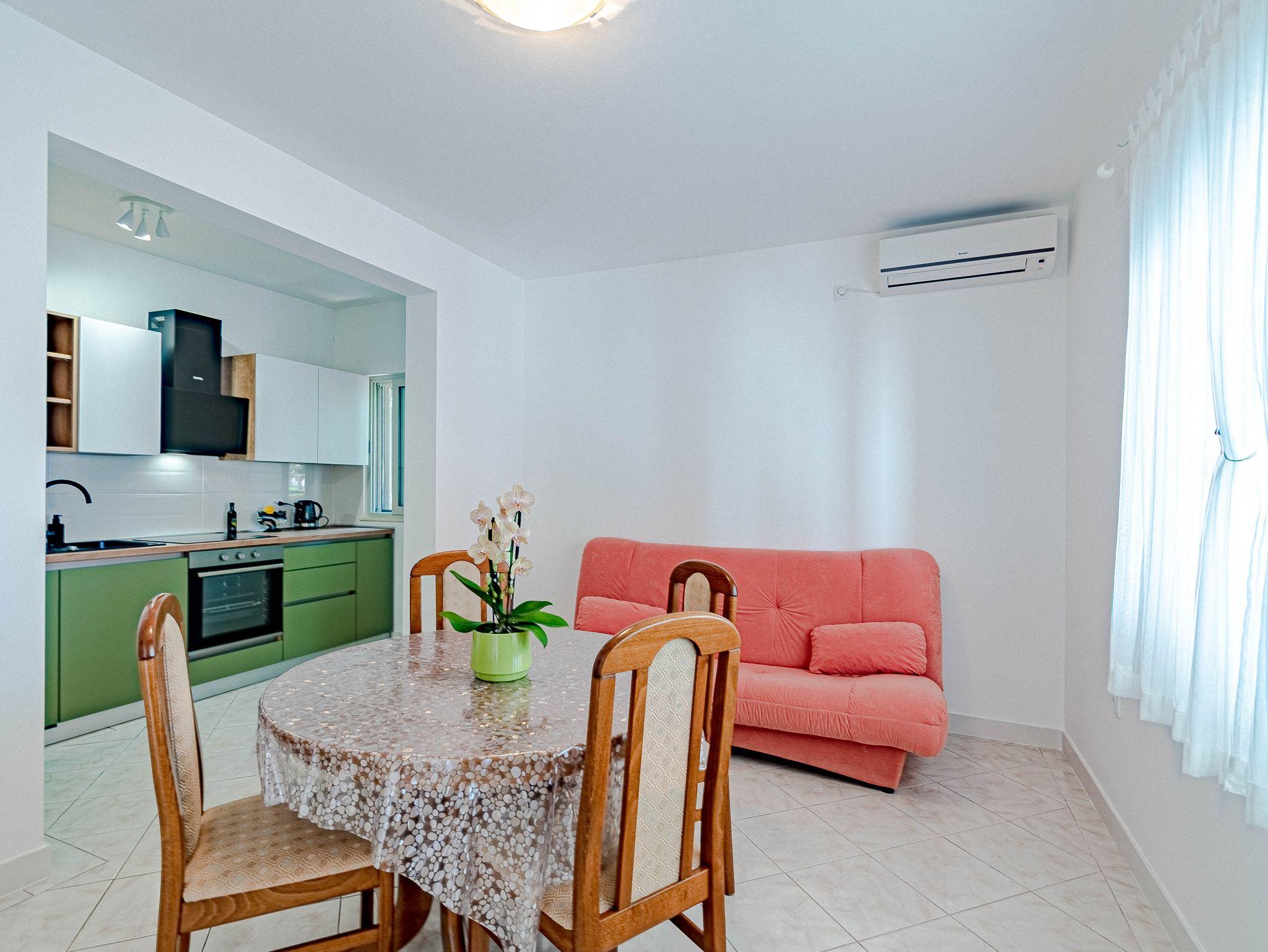 Ferienwohnung bietet Platz für 4 Gäste. Die Betten sind in Schlafzimmern, die es 2 gibt, innerhalb einer Gesamtfläche von 57m2, angeordnet. Die Gäste haben eine eigene Terrasse zur Verfügung, auf der sie in warmen Sommernächten genießen können. Das Apartment bietet Meerblick. In der Unterkunftseinheit besteht die Möglichkeit des Mitbringens von Haustieren gegen Aufpreis. IM PREIS INBEGRIFFEN: Kurtaxe, Endreinigung, Klimatisierung, Parkplatz, Internet, Föhn. VERBINDLICHE ZUSÄTZLICHE KOSTEN: Aufzahlung für Kurzaufenthalte (prozentualer Zuschlag pro Nächtigungsanzahl: 30% - 1, 20% - 2, 10% - 3). UNVERBINDLICHE ZUSÄTZLICHE KOSTEN: Haustiere (10,00 € pro Nacht). Die Verfügbarkeit zusätzlicher Dienstleistungen in Ihrem reservierten Termin und die Preise derselben (falls nicht aufgeführt) müssen im Voraus überprüft werden. Zusätzliche Dienstleistungen die in der Zahlungsaufforderung nicht aufgeführt sind werden direkt beim Vermieter bezahlt, angenommen der Gast nutzt auch diese. Ermäßigung auf den Grundpreis: Gratistag 14=13 (bei einem Aufenthalt von 14 Tagen oder mehr erhalten Sie einen Gratistag für den Aufenthalt bis 31.12.26).