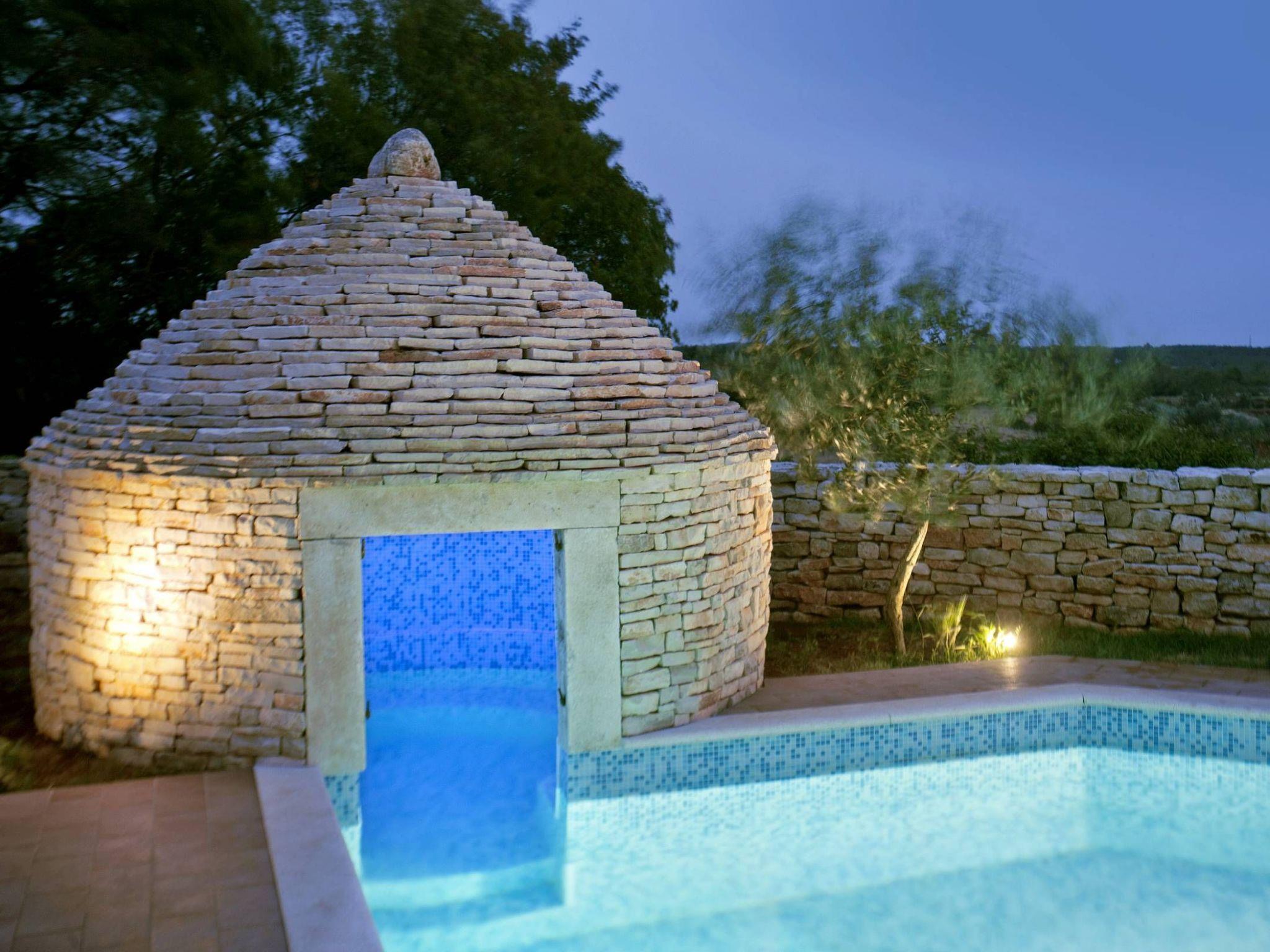 The outdoor area is a true highlight, centered around a private swimming pool surrounded by sunbeds. A traditional Istrian kažun stone hut adds rustic charm to the property, while the covered terrace and charcoal barbecue create the perfect setting for outdoor meals.