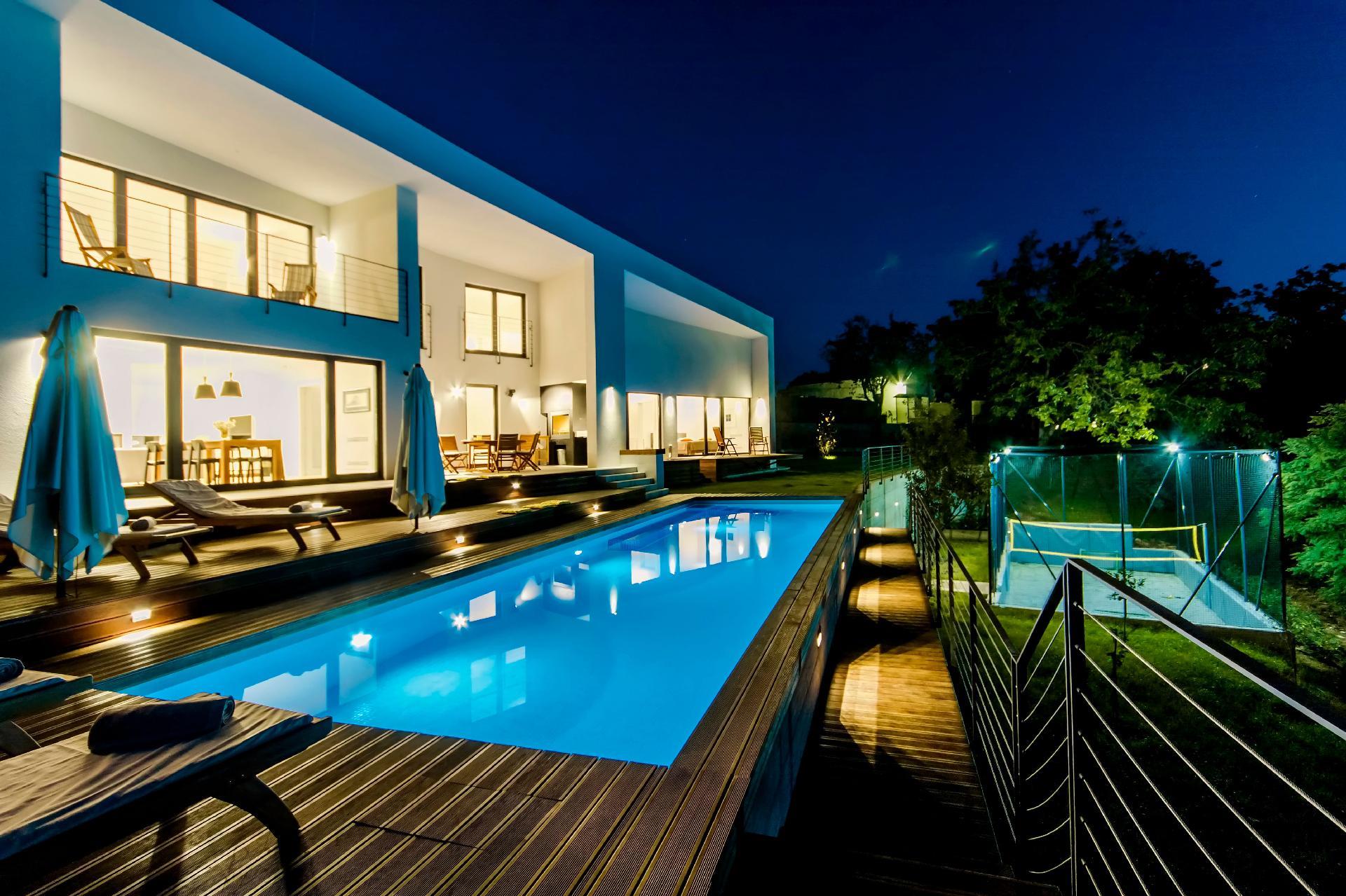 Stepping outside, Villa Vala presents a splendid garden spanning 1800m2, meticulously landscaped and fully fenced for utmost privacy. An orchard adds a touch of natural beauty to the surroundings. The garden's centerpiece is a magnificent 50m2 pool, offering both heating and massage features, complemented by sun loungers and a jacuzzi that accommodates four people. This outdoor haven invites guests to immerse themselves in relaxation, whether through a refreshing swim or basking in the sun's warmth.