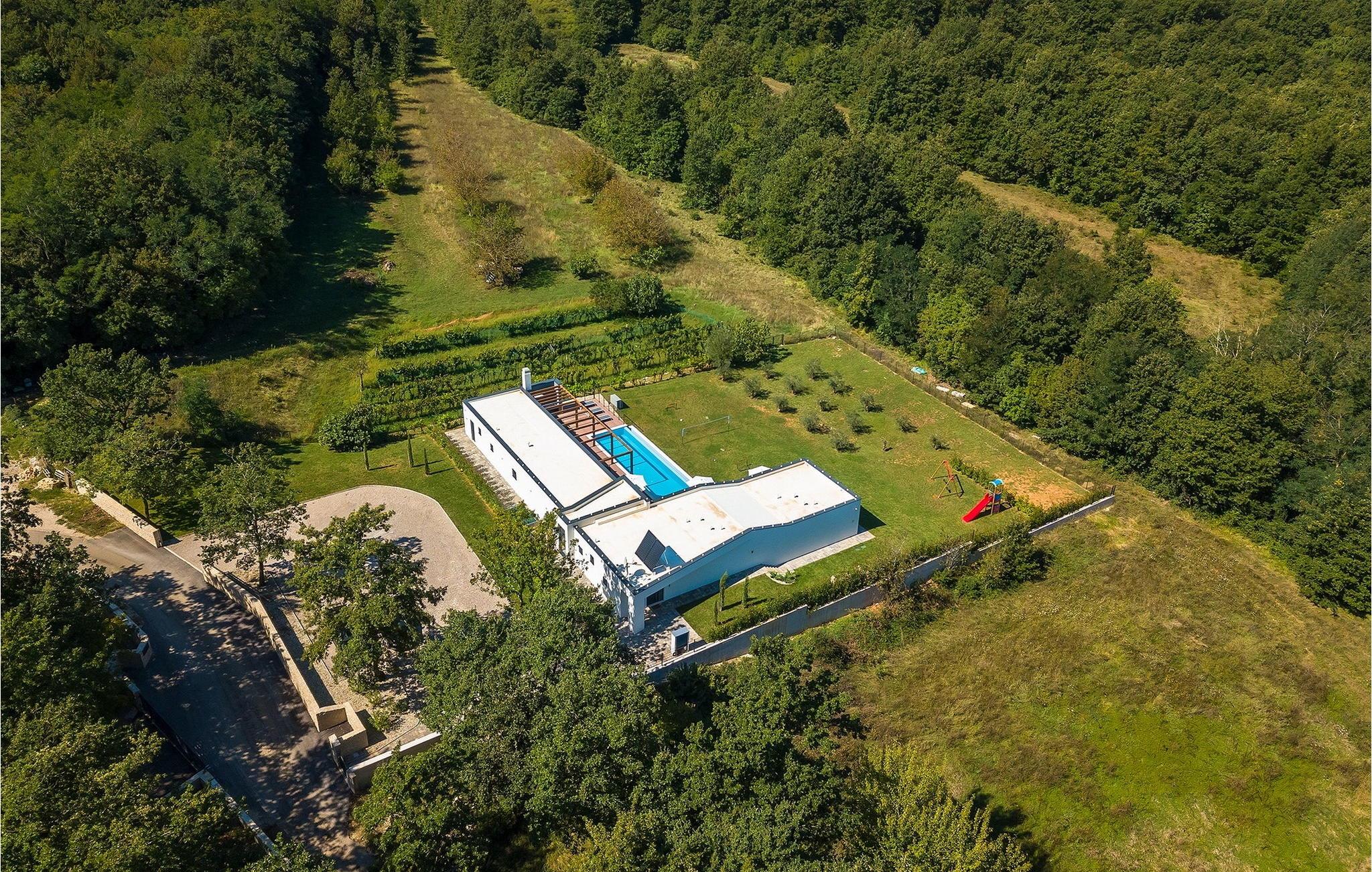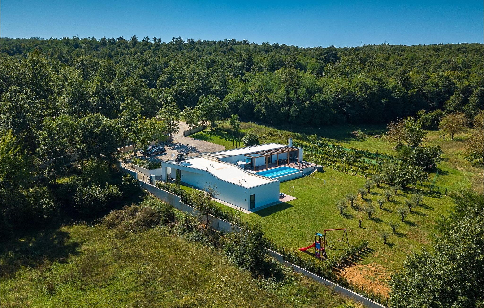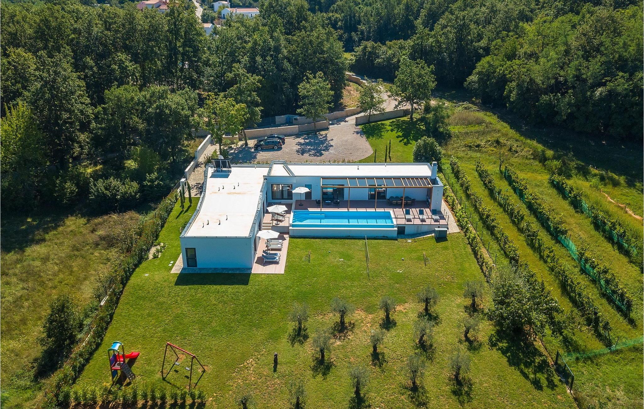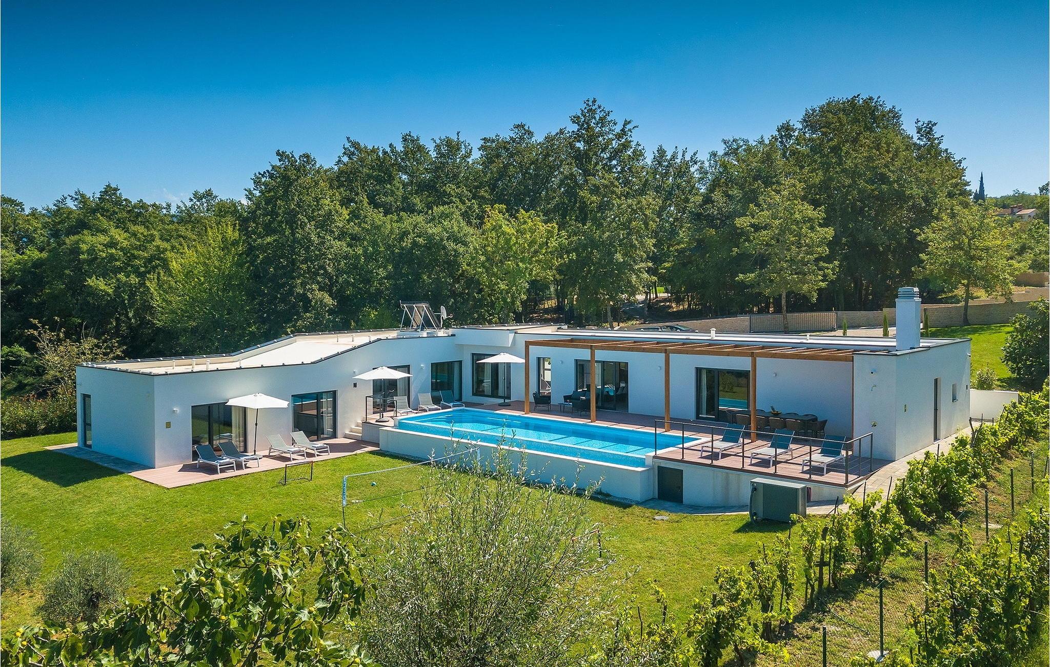 Inmitten grüner Landschaft, umgeben von Wald, Weinbergen, Oliven- und Feigenbäumen werden Sie die Ruhe und Abgeschiedenheit finden, nach der Sie sich so lange sehnen. Unsere Villa Istria Green ist wahrlich eine Ruheoase an der Ostküste Istriens, nur ca. 12km entfernt von Rabac. Die moderne Erdgeschossvilla mit 5 Schlafzimmern kann bis zu 10 Gäste beherbergen und bietet mehr als ausreichend Komfort für einen erholsamen Urlaub mit Familie und Freunden. Der erfrischende 48m2 große Swimming-Pool bildet neben dem weitläufigen Garten den Mittelpunkt der Villa Istria Green. Hier werden Sie mit Ihren Liebsten die besten Momente Ihres Urlaubs erleben: Erfrischen Sie sich im Pool, planschen Sie mit den Kindern, entspannen Sie auf einer der Sonnenliegen während die Teenies im Garten Fußball oder Volleyball spielen und genießen Sie die Sonne Kroatiens. Genießen Sie das gemeinsame Frühstück am Esstisch auf der großen Terrasse und verbringen Sie fröhliche Grillabende mit Ihren Liebsten während Sie lokale Spezialitäten auf dem Holzkohlegrill zubereiten. Das stilvolle Interieur ist hell und sehr gemütlich eingerichtet. Der offene voll klimatisierte Wohnbereich mit bequemer Couch und TV, der Essbereich und die voll ausgestattete Küche vermitteln ein Gefühl von "zu Hause". Fünf komfortable Schlafzimmer mit bequemen Doppelbetten versprechen erholsame Nächte und verfügen jeweils über ein eigenes Badezimmer mit Dusche. Jedes der Zimmer ist mit eigenem TV sowie einer Klimaanlage ausgestattet und bietet direkten Zugang zum Aussenbereich. Buchen Sie die luxuriöse Villa Istria Green und verbringen Sie einen unvergesslichen Urlaub mit Ihrer Familie umgeben von der unberührten Natur Istriens! Erleben Sie Istrien hautnah von seiner schönsten Seite und besuchen Sie die Villa Istria Green. Umgeben von einem Wald, Weinbergen und Olivenhainen liegt diese einzigartige Villa im kleinen Dorf Krsan, nur 12km vom nächsten Strand in Rabac entfernt. Abgeschieden und doch nicht allzu weit entfernt von Annehmlichkeiten wie Restaurants, Bars, Supermärkten und allem, was man sonst noch für einen sorgenfreien Urlaub braucht, ist die Lage perfekt, um Istrien kennenzulernen. Erkunden Sie das Herz Istriens und besuchen Sie Pazin, wo Sie neben großartiger Gastronomie auch eine Zipline erwartet, die über die Schlucht des Paziner Schlosses führt. Genießen Sie die besten Weine in Motovun oder schlendern Sie durch die Gassen der kleinsten Stadt Kroatiens: Hum. Machen Sie einen Tagesausflug in die historische Stadt Pula oder entdecken Sie die schönsten Strände der Küste. Lassen Sie sich begeistern, verbringen Sie einen Traumurlaub und kehren Sie bald zurück. Bitte beachten Sie, dass diese Unterkunft auf Anfrage möglicherweise jüngere Besuchergruppen akzeptiert. Bitte kontaktieren Sie uns, um dies zu überprüfen. Als jüngere Besuchergruppe gilt in dieser Unterkunft eine Gruppe von Personen im Alter von 25 Jahren oder jünger. Wenn Sie eine jüngere Besuchergruppe sind [oder einen Junggesellenabschied planen], können Sie bei der Ankunft zur Zahlung einer zusätzlichen Kaution aufgefordert werden. Sollten Schäden durch die Gäste Ihrer Gruppe entstanden sein, dann werden die Kosten für die Reparatur entstandener Schäden/Ersatz beschädigter Gegenstände von der Kaution abgezogen. Die Temperatur des beheizten Schwimmbades hängt von äußeren Faktoren, einschließlich der Wetterbedingungen, ab und daher kann die Wassertemperatur nicht garantiert werden.