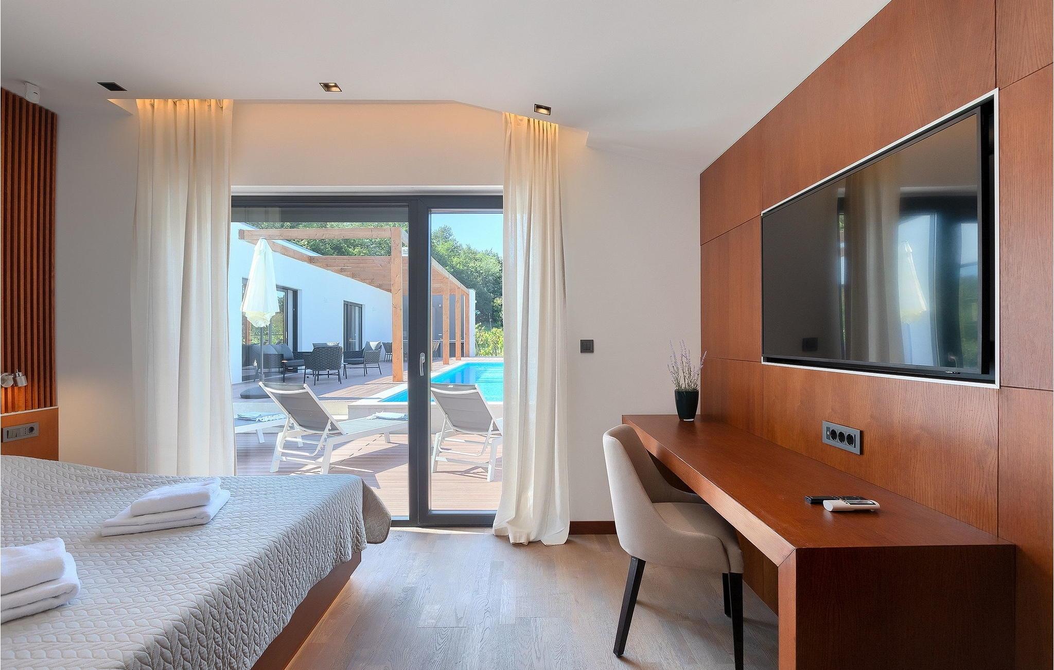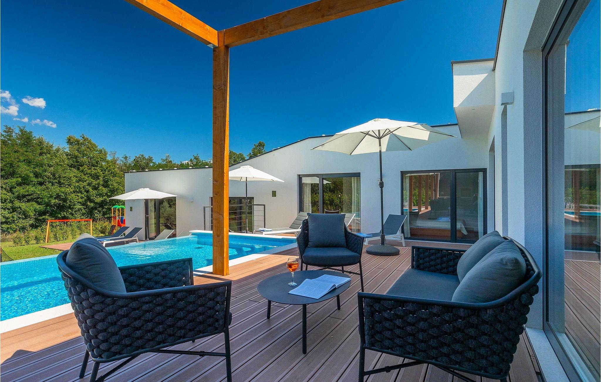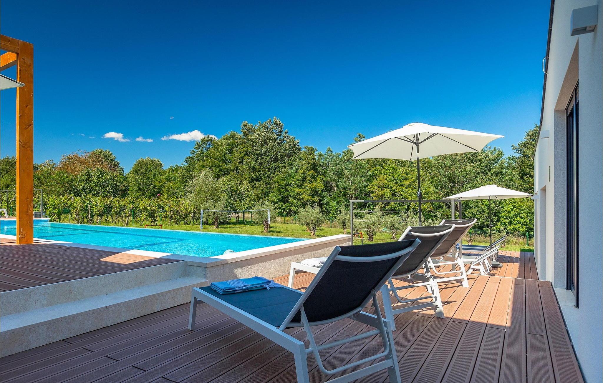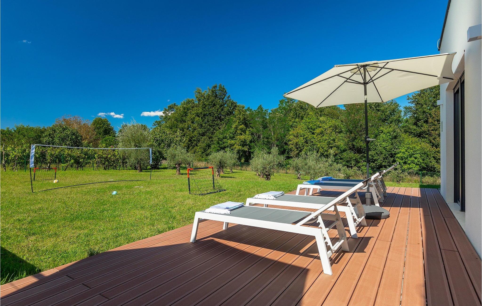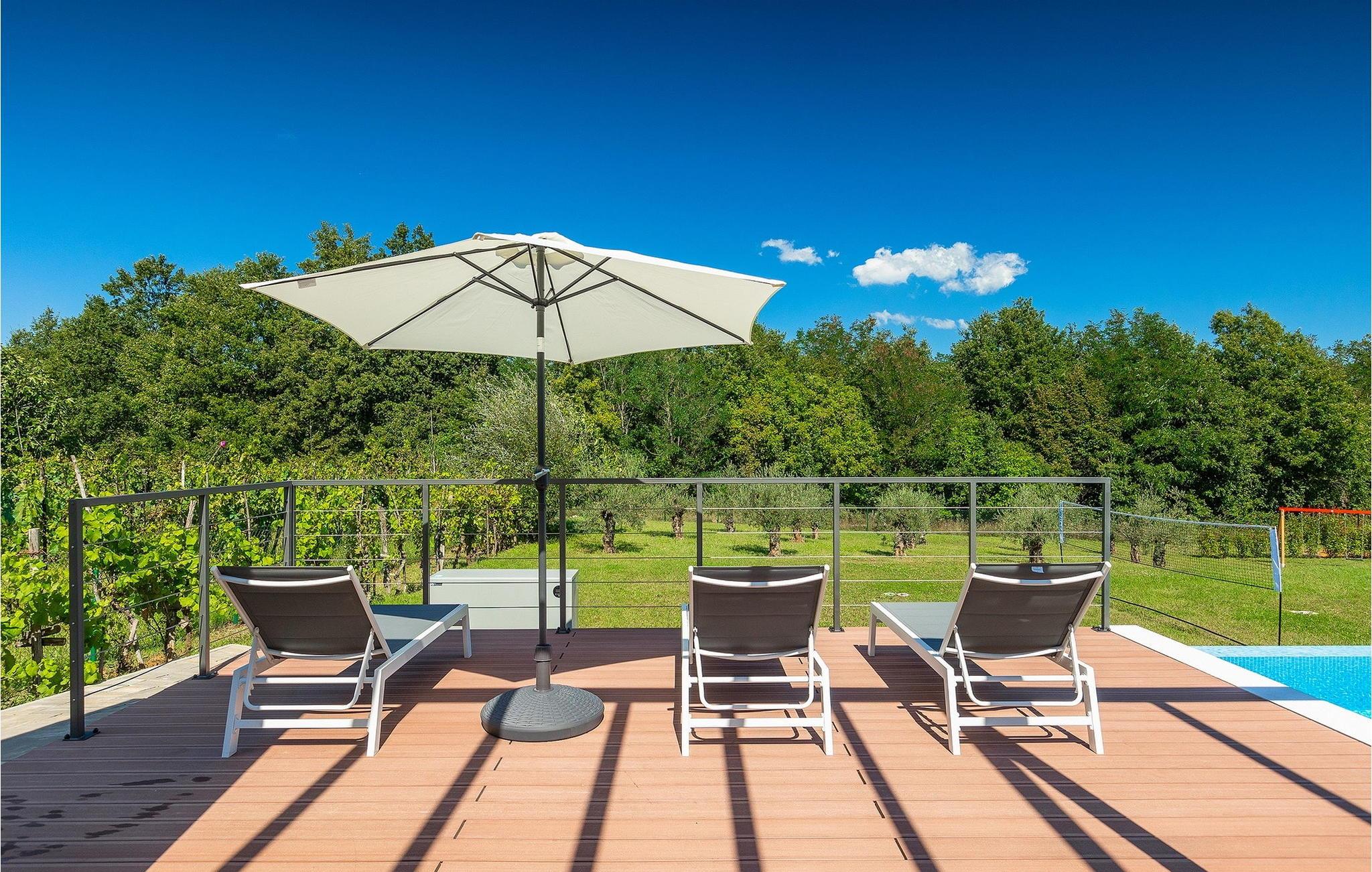 Inmitten grüner Landschaft, umgeben von Wald, Weinbergen, Oliven- und Feigenbäumen werden Sie die Ruhe und Abgeschiedenheit finden, nach der Sie sich so lange sehnen. Unsere Villa Istria Green ist wahrlich eine Ruheoase an der Ostküste Istriens, nur ca. 12km entfernt von Rabac. Die moderne Erdgeschossvilla mit 5 Schlafzimmern kann bis zu 10 Gäste beherbergen und bietet mehr als ausreichend Komfort für einen erholsamen Urlaub mit Familie und Freunden. Der erfrischende 48m2 große Swimming-Pool bildet neben dem weitläufigen Garten den Mittelpunkt der Villa Istria Green. Hier werden Sie mit Ihren Liebsten die besten Momente Ihres Urlaubs erleben: Erfrischen Sie sich im Pool, planschen Sie mit den Kindern, entspannen Sie auf einer der Sonnenliegen während die Teenies im Garten Fußball oder Volleyball spielen und genießen Sie die Sonne Kroatiens. Genießen Sie das gemeinsame Frühstück am Esstisch auf der großen Terrasse und verbringen Sie fröhliche Grillabende mit Ihren Liebsten während Sie lokale Spezialitäten auf dem Holzkohlegrill zubereiten. Das stilvolle Interieur ist hell und sehr gemütlich eingerichtet. Der offene voll klimatisierte Wohnbereich mit bequemer Couch und TV, der Essbereich und die voll ausgestattete Küche vermitteln ein Gefühl von "zu Hause". Fünf komfortable Schlafzimmer mit bequemen Doppelbetten versprechen erholsame Nächte und verfügen jeweils über ein eigenes Badezimmer mit Dusche. Jedes der Zimmer ist mit eigenem TV sowie einer Klimaanlage ausgestattet und bietet direkten Zugang zum Aussenbereich. Buchen Sie die luxuriöse Villa Istria Green und verbringen Sie einen unvergesslichen Urlaub mit Ihrer Familie umgeben von der unberührten Natur Istriens! Erleben Sie Istrien hautnah von seiner schönsten Seite und besuchen Sie die Villa Istria Green. Umgeben von einem Wald, Weinbergen und Olivenhainen liegt diese einzigartige Villa im kleinen Dorf Krsan, nur 12km vom nächsten Strand in Rabac entfernt. Abgeschieden und doch nicht allzu weit entfernt von Annehmlichkeiten wie Restaurants, Bars, Supermärkten und allem, was man sonst noch für einen sorgenfreien Urlaub braucht, ist die Lage perfekt, um Istrien kennenzulernen. Erkunden Sie das Herz Istriens und besuchen Sie Pazin, wo Sie neben großartiger Gastronomie auch eine Zipline erwartet, die über die Schlucht des Paziner Schlosses führt. Genießen Sie die besten Weine in Motovun oder schlendern Sie durch die Gassen der kleinsten Stadt Kroatiens: Hum. Machen Sie einen Tagesausflug in die historische Stadt Pula oder entdecken Sie die schönsten Strände der Küste. Lassen Sie sich begeistern, verbringen Sie einen Traumurlaub und kehren Sie bald zurück. Bitte beachten Sie, dass diese Unterkunft auf Anfrage möglicherweise jüngere Besuchergruppen akzeptiert. Bitte kontaktieren Sie uns, um dies zu überprüfen. Als jüngere Besuchergruppe gilt in dieser Unterkunft eine Gruppe von Personen im Alter von 25 Jahren oder jünger. Wenn Sie eine jüngere Besuchergruppe sind [oder einen Junggesellenabschied planen], können Sie bei der Ankunft zur Zahlung einer zusätzlichen Kaution aufgefordert werden. Sollten Schäden durch die Gäste Ihrer Gruppe entstanden sein, dann werden die Kosten für die Reparatur entstandener Schäden/Ersatz beschädigter Gegenstände von der Kaution abgezogen. Die Temperatur des beheizten Schwimmbades hängt von äußeren Faktoren, einschließlich der Wetterbedingungen, ab und daher kann die Wassertemperatur nicht garantiert werden.