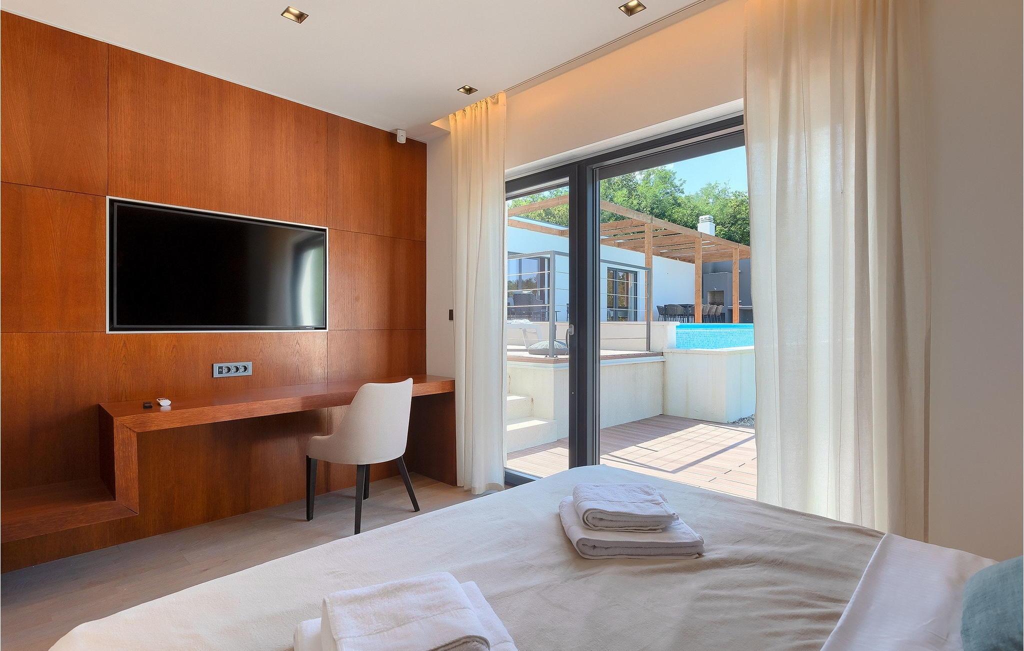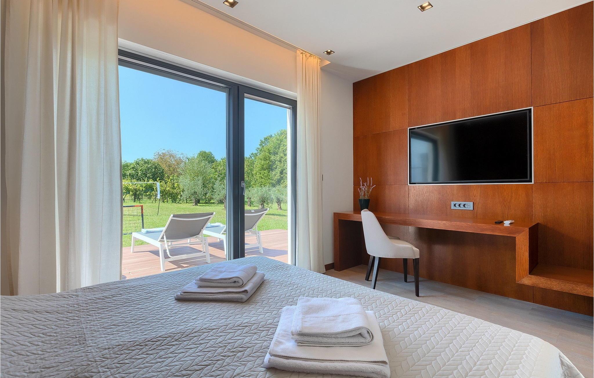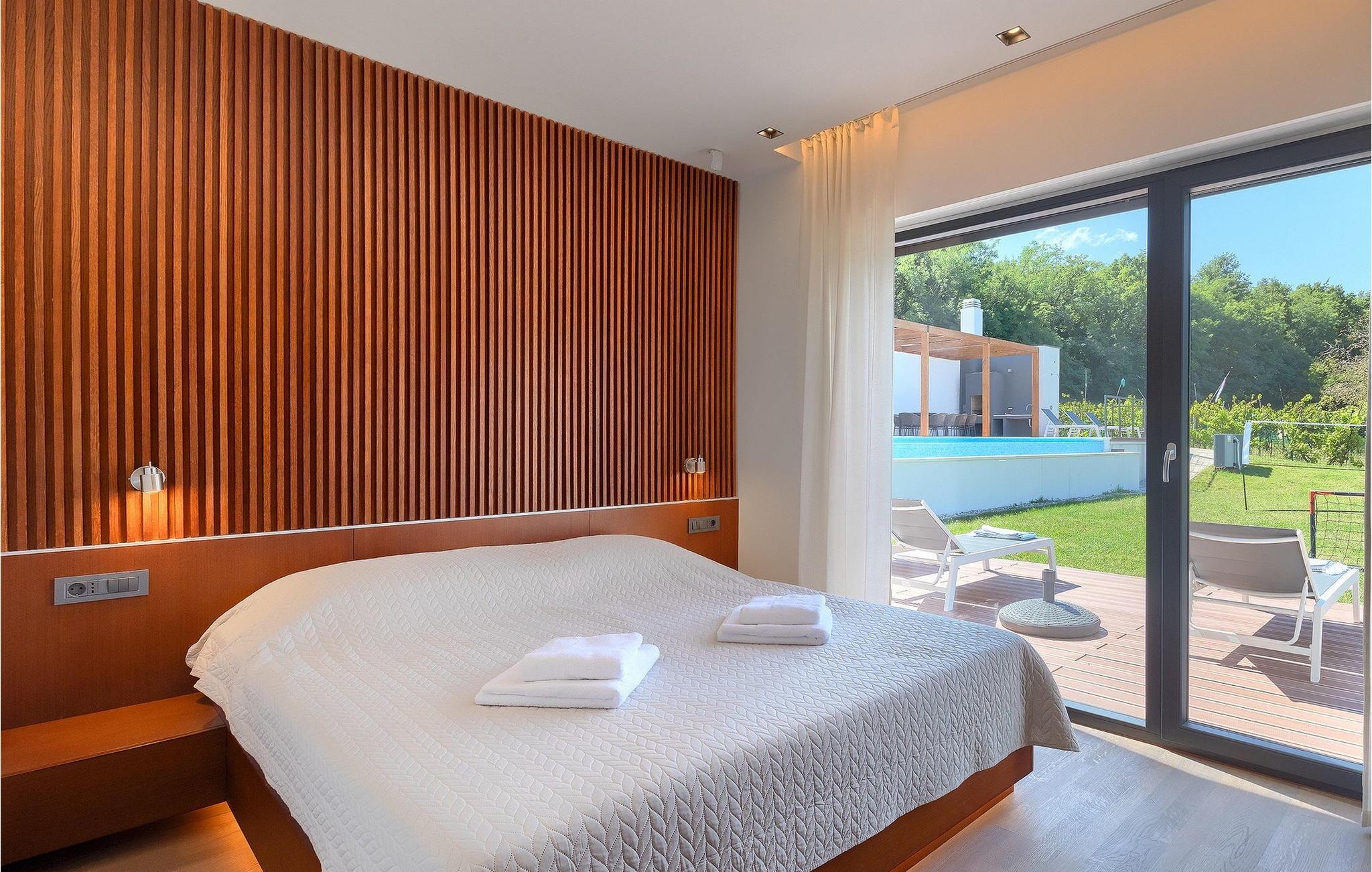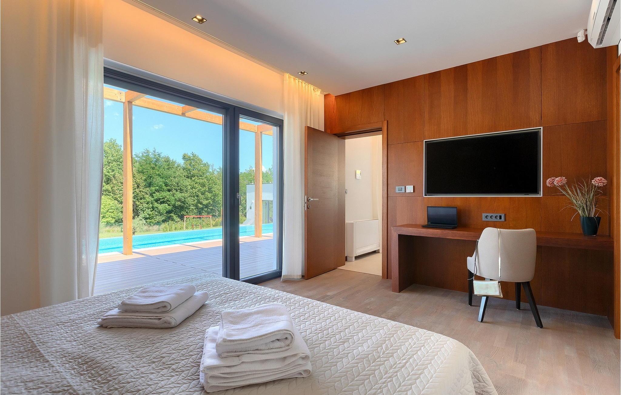 Inmitten grüner Landschaft, umgeben von Wald, Weinbergen, Oliven- und Feigenbäumen werden Sie die Ruhe und Abgeschiedenheit finden, nach der Sie sich so lange sehnen. Unsere Villa Istria Green ist wahrlich eine Ruheoase an der Ostküste Istriens, nur ca. 12km entfernt von Rabac. Die moderne Erdgeschossvilla mit 5 Schlafzimmern kann bis zu 10 Gäste beherbergen und bietet mehr als ausreichend Komfort für einen erholsamen Urlaub mit Familie und Freunden. Der erfrischende 48m2 große Swimming-Pool bildet neben dem weitläufigen Garten den Mittelpunkt der Villa Istria Green. Hier werden Sie mit Ihren Liebsten die besten Momente Ihres Urlaubs erleben: Erfrischen Sie sich im Pool, planschen Sie mit den Kindern, entspannen Sie auf einer der Sonnenliegen während die Teenies im Garten Fußball oder Volleyball spielen und genießen Sie die Sonne Kroatiens. Genießen Sie das gemeinsame Frühstück am Esstisch auf der großen Terrasse und verbringen Sie fröhliche Grillabende mit Ihren Liebsten während Sie lokale Spezialitäten auf dem Holzkohlegrill zubereiten. Das stilvolle Interieur ist hell und sehr gemütlich eingerichtet. Der offene voll klimatisierte Wohnbereich mit bequemer Couch und TV, der Essbereich und die voll ausgestattete Küche vermitteln ein Gefühl von "zu Hause". Fünf komfortable Schlafzimmer mit bequemen Doppelbetten versprechen erholsame Nächte und verfügen jeweils über ein eigenes Badezimmer mit Dusche. Jedes der Zimmer ist mit eigenem TV sowie einer Klimaanlage ausgestattet und bietet direkten Zugang zum Aussenbereich. Buchen Sie die luxuriöse Villa Istria Green und verbringen Sie einen unvergesslichen Urlaub mit Ihrer Familie umgeben von der unberührten Natur Istriens! Erleben Sie Istrien hautnah von seiner schönsten Seite und besuchen Sie die Villa Istria Green. Umgeben von einem Wald, Weinbergen und Olivenhainen liegt diese einzigartige Villa im kleinen Dorf Krsan, nur 12km vom nächsten Strand in Rabac entfernt. Abgeschieden und doch nicht allzu weit entfernt von Annehmlichkeiten wie Restaurants, Bars, Supermärkten und allem, was man sonst noch für einen sorgenfreien Urlaub braucht, ist die Lage perfekt, um Istrien kennenzulernen. Erkunden Sie das Herz Istriens und besuchen Sie Pazin, wo Sie neben großartiger Gastronomie auch eine Zipline erwartet, die über die Schlucht des Paziner Schlosses führt. Genießen Sie die besten Weine in Motovun oder schlendern Sie durch die Gassen der kleinsten Stadt Kroatiens: Hum. Machen Sie einen Tagesausflug in die historische Stadt Pula oder entdecken Sie die schönsten Strände der Küste. Lassen Sie sich begeistern, verbringen Sie einen Traumurlaub und kehren Sie bald zurück. Bitte beachten Sie, dass diese Unterkunft auf Anfrage möglicherweise jüngere Besuchergruppen akzeptiert. Bitte kontaktieren Sie uns, um dies zu überprüfen. Als jüngere Besuchergruppe gilt in dieser Unterkunft eine Gruppe von Personen im Alter von 25 Jahren oder jünger. Wenn Sie eine jüngere Besuchergruppe sind [oder einen Junggesellenabschied planen], können Sie bei der Ankunft zur Zahlung einer zusätzlichen Kaution aufgefordert werden. Sollten Schäden durch die Gäste Ihrer Gruppe entstanden sein, dann werden die Kosten für die Reparatur entstandener Schäden/Ersatz beschädigter Gegenstände von der Kaution abgezogen. Die Temperatur des beheizten Schwimmbades hängt von äußeren Faktoren, einschließlich der Wetterbedingungen, ab und daher kann die Wassertemperatur nicht garantiert werden.