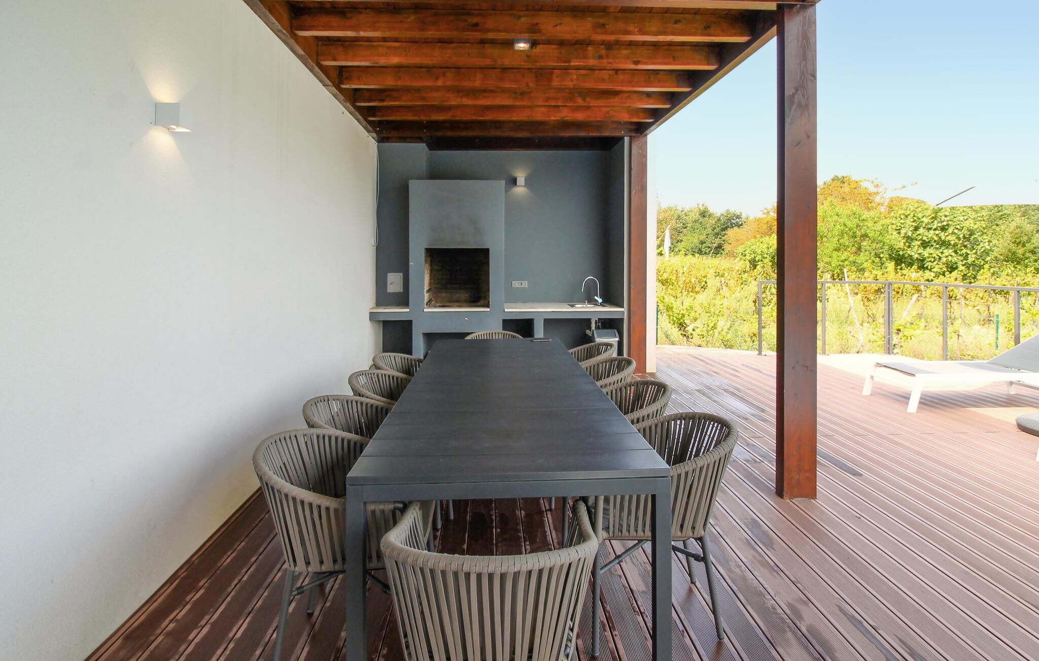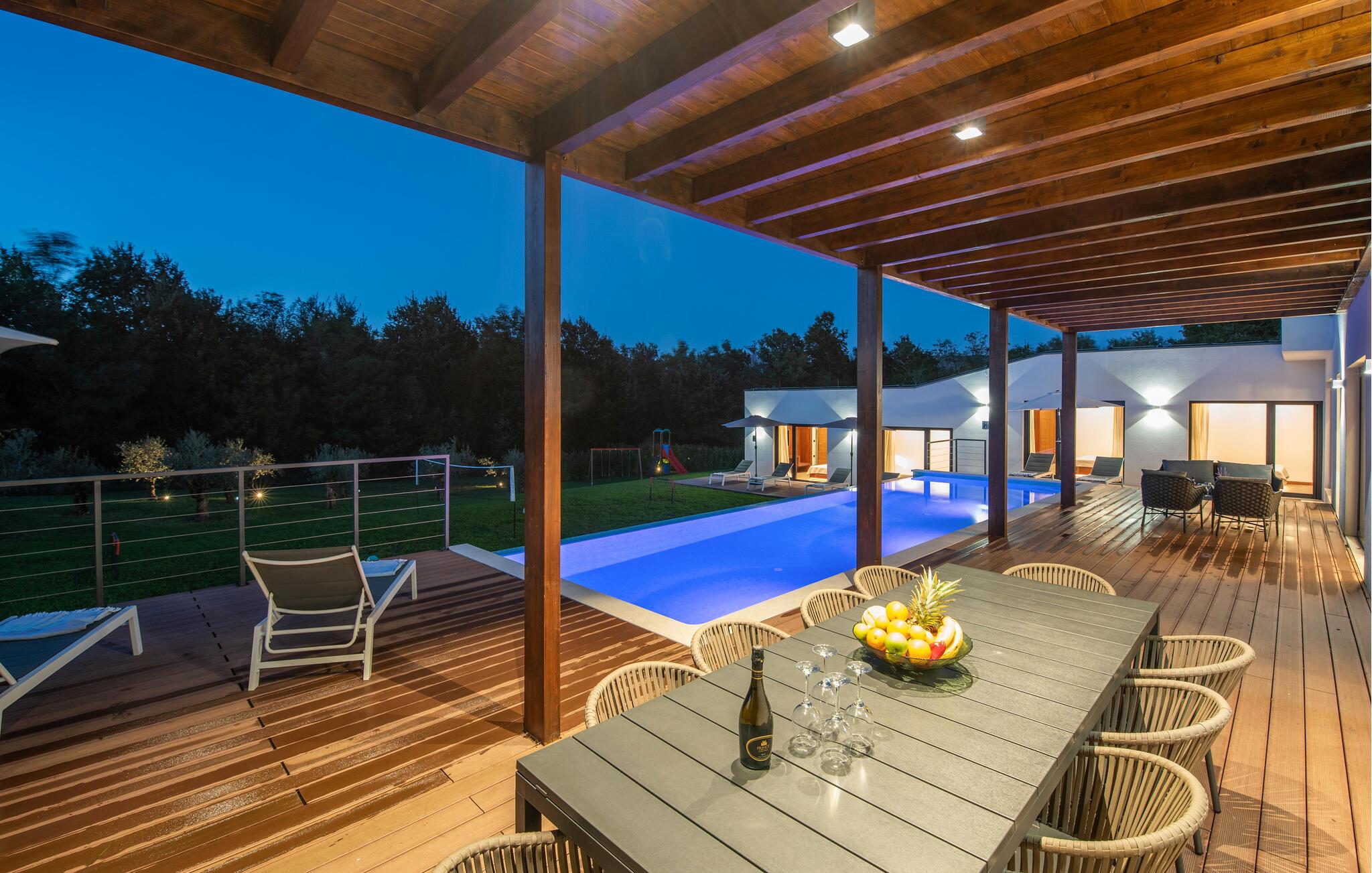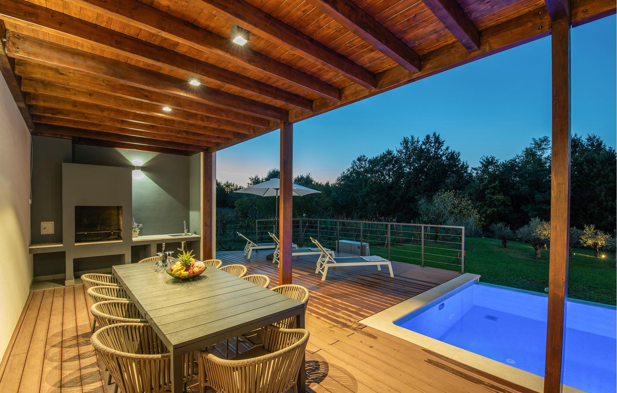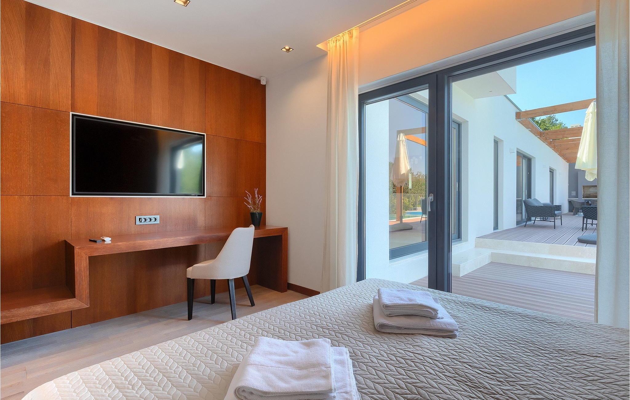 Inmitten grüner Landschaft, umgeben von Wald, Weinbergen, Oliven- und Feigenbäumen werden Sie die Ruhe und Abgeschiedenheit finden, nach der Sie sich so lange sehnen. Unsere Villa Istria Green ist wahrlich eine Ruheoase an der Ostküste Istriens, nur ca. 12km entfernt von Rabac. Die moderne Erdgeschossvilla mit 5 Schlafzimmern kann bis zu 10 Gäste beherbergen und bietet mehr als ausreichend Komfort für einen erholsamen Urlaub mit Familie und Freunden. Der erfrischende 48m2 große Swimming-Pool bildet neben dem weitläufigen Garten den Mittelpunkt der Villa Istria Green. Hier werden Sie mit Ihren Liebsten die besten Momente Ihres Urlaubs erleben: Erfrischen Sie sich im Pool, planschen Sie mit den Kindern, entspannen Sie auf einer der Sonnenliegen während die Teenies im Garten Fußball oder Volleyball spielen und genießen Sie die Sonne Kroatiens. Genießen Sie das gemeinsame Frühstück am Esstisch auf der großen Terrasse und verbringen Sie fröhliche Grillabende mit Ihren Liebsten während Sie lokale Spezialitäten auf dem Holzkohlegrill zubereiten. Das stilvolle Interieur ist hell und sehr gemütlich eingerichtet. Der offene voll klimatisierte Wohnbereich mit bequemer Couch und TV, der Essbereich und die voll ausgestattete Küche vermitteln ein Gefühl von "zu Hause". Fünf komfortable Schlafzimmer mit bequemen Doppelbetten versprechen erholsame Nächte und verfügen jeweils über ein eigenes Badezimmer mit Dusche. Jedes der Zimmer ist mit eigenem TV sowie einer Klimaanlage ausgestattet und bietet direkten Zugang zum Aussenbereich. Buchen Sie die luxuriöse Villa Istria Green und verbringen Sie einen unvergesslichen Urlaub mit Ihrer Familie umgeben von der unberührten Natur Istriens! Erleben Sie Istrien hautnah von seiner schönsten Seite und besuchen Sie die Villa Istria Green. Umgeben von einem Wald, Weinbergen und Olivenhainen liegt diese einzigartige Villa im kleinen Dorf Krsan, nur 12km vom nächsten Strand in Rabac entfernt. Abgeschieden und doch nicht allzu weit entfernt von Annehmlichkeiten wie Restaurants, Bars, Supermärkten und allem, was man sonst noch für einen sorgenfreien Urlaub braucht, ist die Lage perfekt, um Istrien kennenzulernen. Erkunden Sie das Herz Istriens und besuchen Sie Pazin, wo Sie neben großartiger Gastronomie auch eine Zipline erwartet, die über die Schlucht des Paziner Schlosses führt. Genießen Sie die besten Weine in Motovun oder schlendern Sie durch die Gassen der kleinsten Stadt Kroatiens: Hum. Machen Sie einen Tagesausflug in die historische Stadt Pula oder entdecken Sie die schönsten Strände der Küste. Lassen Sie sich begeistern, verbringen Sie einen Traumurlaub und kehren Sie bald zurück. Bitte beachten Sie, dass diese Unterkunft auf Anfrage möglicherweise jüngere Besuchergruppen akzeptiert. Bitte kontaktieren Sie uns, um dies zu überprüfen. Als jüngere Besuchergruppe gilt in dieser Unterkunft eine Gruppe von Personen im Alter von 25 Jahren oder jünger. Wenn Sie eine jüngere Besuchergruppe sind [oder einen Junggesellenabschied planen], können Sie bei der Ankunft zur Zahlung einer zusätzlichen Kaution aufgefordert werden. Sollten Schäden durch die Gäste Ihrer Gruppe entstanden sein, dann werden die Kosten für die Reparatur entstandener Schäden/Ersatz beschädigter Gegenstände von der Kaution abgezogen. Die Temperatur des beheizten Schwimmbades hängt von äußeren Faktoren, einschließlich der Wetterbedingungen, ab und daher kann die Wassertemperatur nicht garantiert werden.