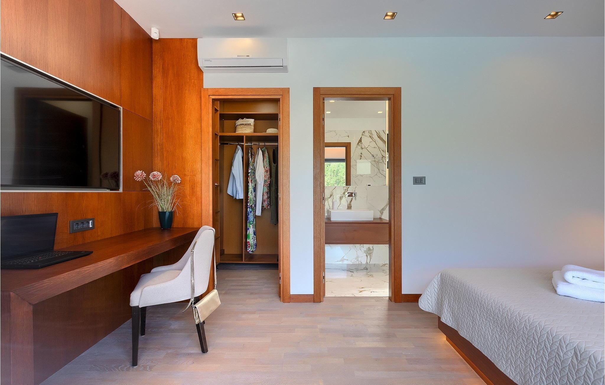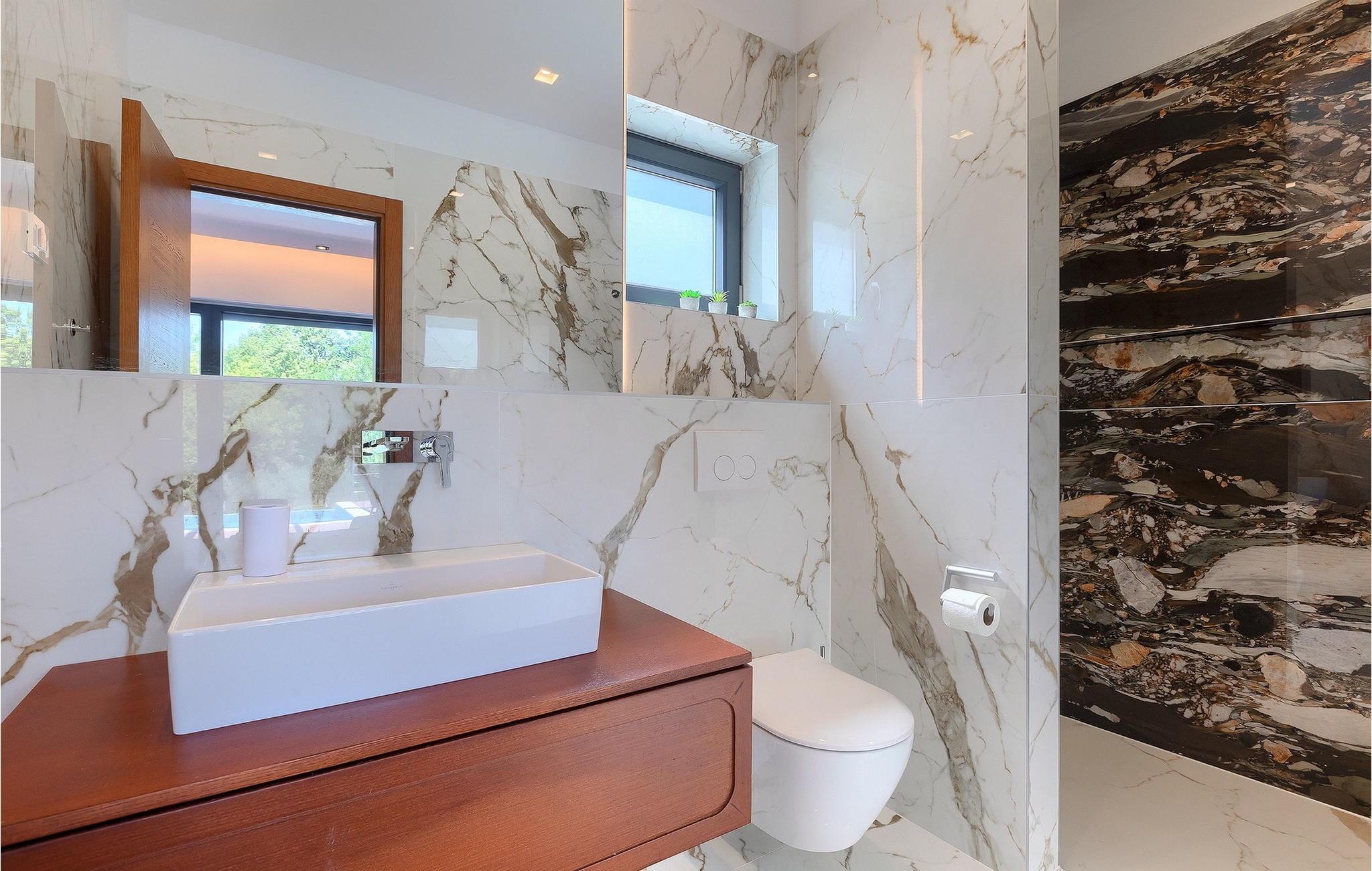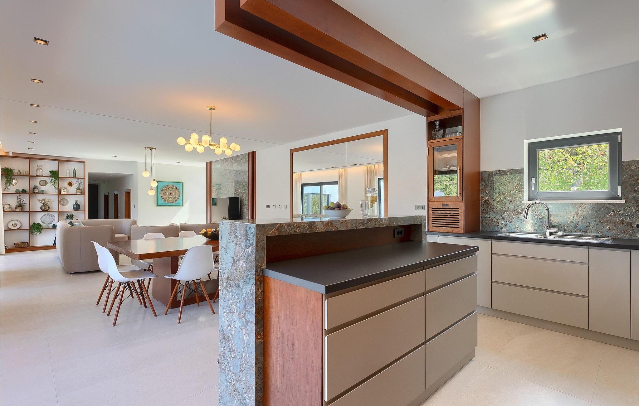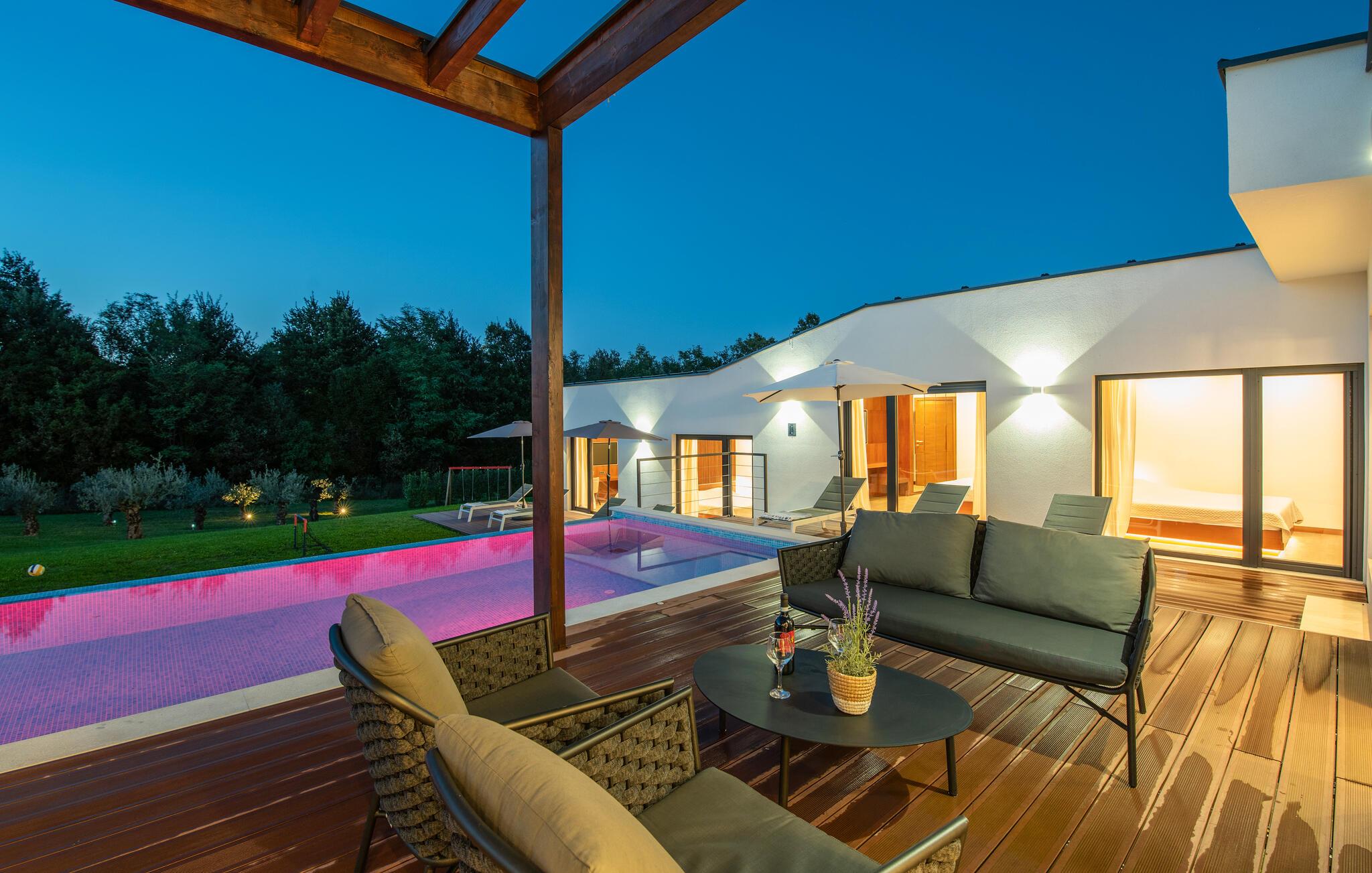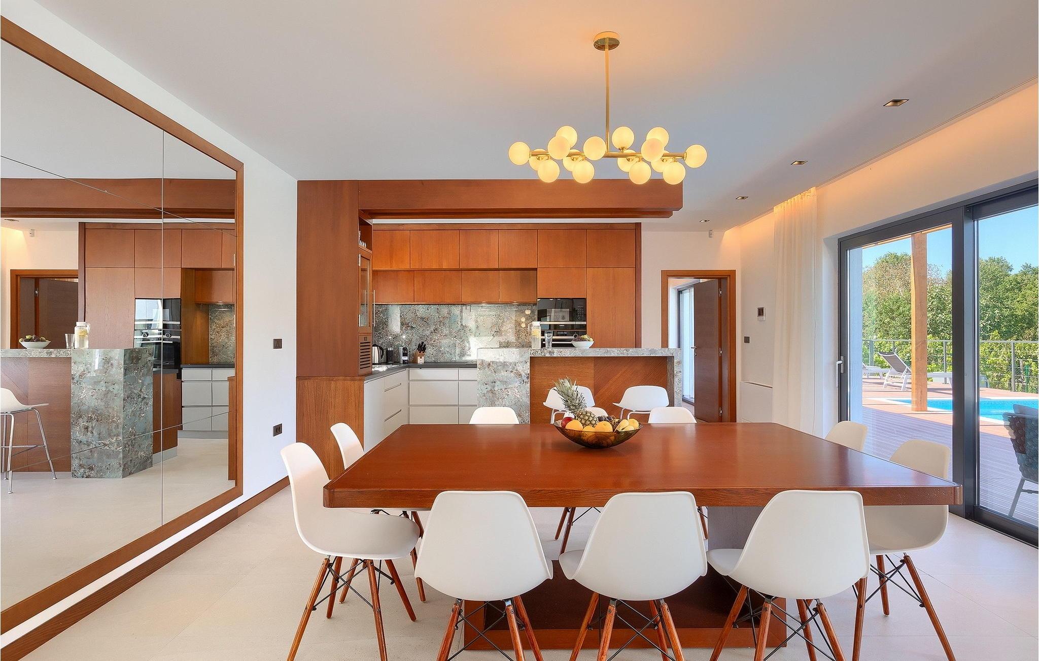 Inmitten grüner Landschaft, umgeben von Wald, Weinbergen, Oliven- und Feigenbäumen werden Sie die Ruhe und Abgeschiedenheit finden, nach der Sie sich so lange sehnen. Unsere Villa Istria Green ist wahrlich eine Ruheoase an der Ostküste Istriens, nur ca. 12km entfernt von Rabac. Die moderne Erdgeschossvilla mit 5 Schlafzimmern kann bis zu 10 Gäste beherbergen und bietet mehr als ausreichend Komfort für einen erholsamen Urlaub mit Familie und Freunden. Der erfrischende 48m2 große Swimming-Pool bildet neben dem weitläufigen Garten den Mittelpunkt der Villa Istria Green. Hier werden Sie mit Ihren Liebsten die besten Momente Ihres Urlaubs erleben: Erfrischen Sie sich im Pool, planschen Sie mit den Kindern, entspannen Sie auf einer der Sonnenliegen während die Teenies im Garten Fußball oder Volleyball spielen und genießen Sie die Sonne Kroatiens. Genießen Sie das gemeinsame Frühstück am Esstisch auf der großen Terrasse und verbringen Sie fröhliche Grillabende mit Ihren Liebsten während Sie lokale Spezialitäten auf dem Holzkohlegrill zubereiten. Das stilvolle Interieur ist hell und sehr gemütlich eingerichtet. Der offene voll klimatisierte Wohnbereich mit bequemer Couch und TV, der Essbereich und die voll ausgestattete Küche vermitteln ein Gefühl von "zu Hause". Fünf komfortable Schlafzimmer mit bequemen Doppelbetten versprechen erholsame Nächte und verfügen jeweils über ein eigenes Badezimmer mit Dusche. Jedes der Zimmer ist mit eigenem TV sowie einer Klimaanlage ausgestattet und bietet direkten Zugang zum Aussenbereich. Buchen Sie die luxuriöse Villa Istria Green und verbringen Sie einen unvergesslichen Urlaub mit Ihrer Familie umgeben von der unberührten Natur Istriens! Erleben Sie Istrien hautnah von seiner schönsten Seite und besuchen Sie die Villa Istria Green. Umgeben von einem Wald, Weinbergen und Olivenhainen liegt diese einzigartige Villa im kleinen Dorf Krsan, nur 12km vom nächsten Strand in Rabac entfernt. Abgeschieden und doch nicht allzu weit entfernt von Annehmlichkeiten wie Restaurants, Bars, Supermärkten und allem, was man sonst noch für einen sorgenfreien Urlaub braucht, ist die Lage perfekt, um Istrien kennenzulernen. Erkunden Sie das Herz Istriens und besuchen Sie Pazin, wo Sie neben großartiger Gastronomie auch eine Zipline erwartet, die über die Schlucht des Paziner Schlosses führt. Genießen Sie die besten Weine in Motovun oder schlendern Sie durch die Gassen der kleinsten Stadt Kroatiens: Hum. Machen Sie einen Tagesausflug in die historische Stadt Pula oder entdecken Sie die schönsten Strände der Küste. Lassen Sie sich begeistern, verbringen Sie einen Traumurlaub und kehren Sie bald zurück. Bitte beachten Sie, dass diese Unterkunft auf Anfrage möglicherweise jüngere Besuchergruppen akzeptiert. Bitte kontaktieren Sie uns, um dies zu überprüfen. Als jüngere Besuchergruppe gilt in dieser Unterkunft eine Gruppe von Personen im Alter von 25 Jahren oder jünger. Wenn Sie eine jüngere Besuchergruppe sind [oder einen Junggesellenabschied planen], können Sie bei der Ankunft zur Zahlung einer zusätzlichen Kaution aufgefordert werden. Sollten Schäden durch die Gäste Ihrer Gruppe entstanden sein, dann werden die Kosten für die Reparatur entstandener Schäden/Ersatz beschädigter Gegenstände von der Kaution abgezogen. Die Temperatur des beheizten Schwimmbades hängt von äußeren Faktoren, einschließlich der Wetterbedingungen, ab und daher kann die Wassertemperatur nicht garantiert werden.